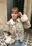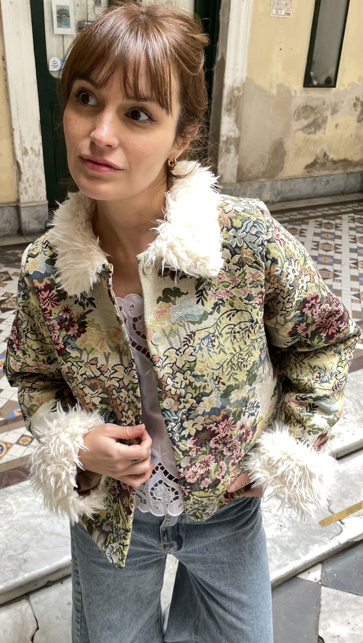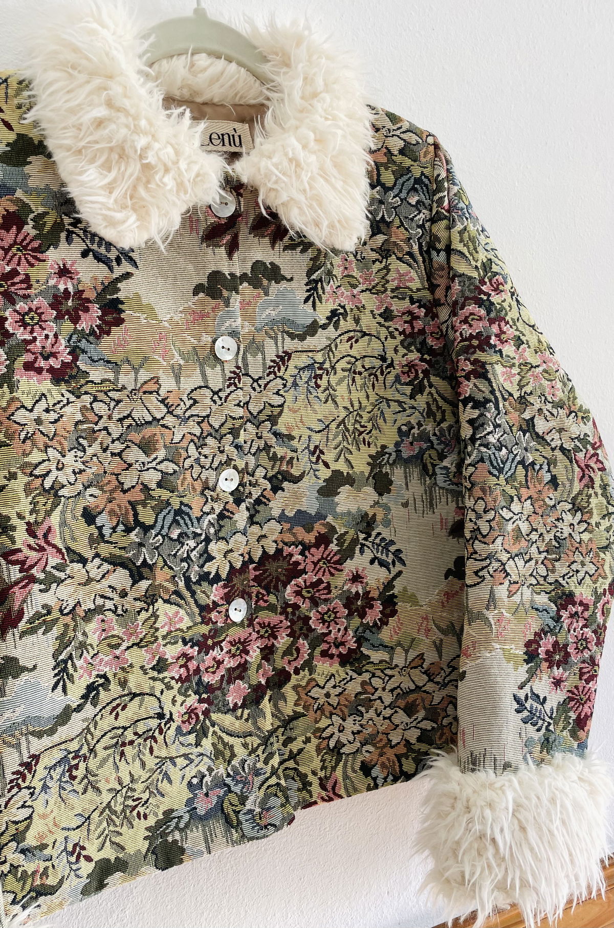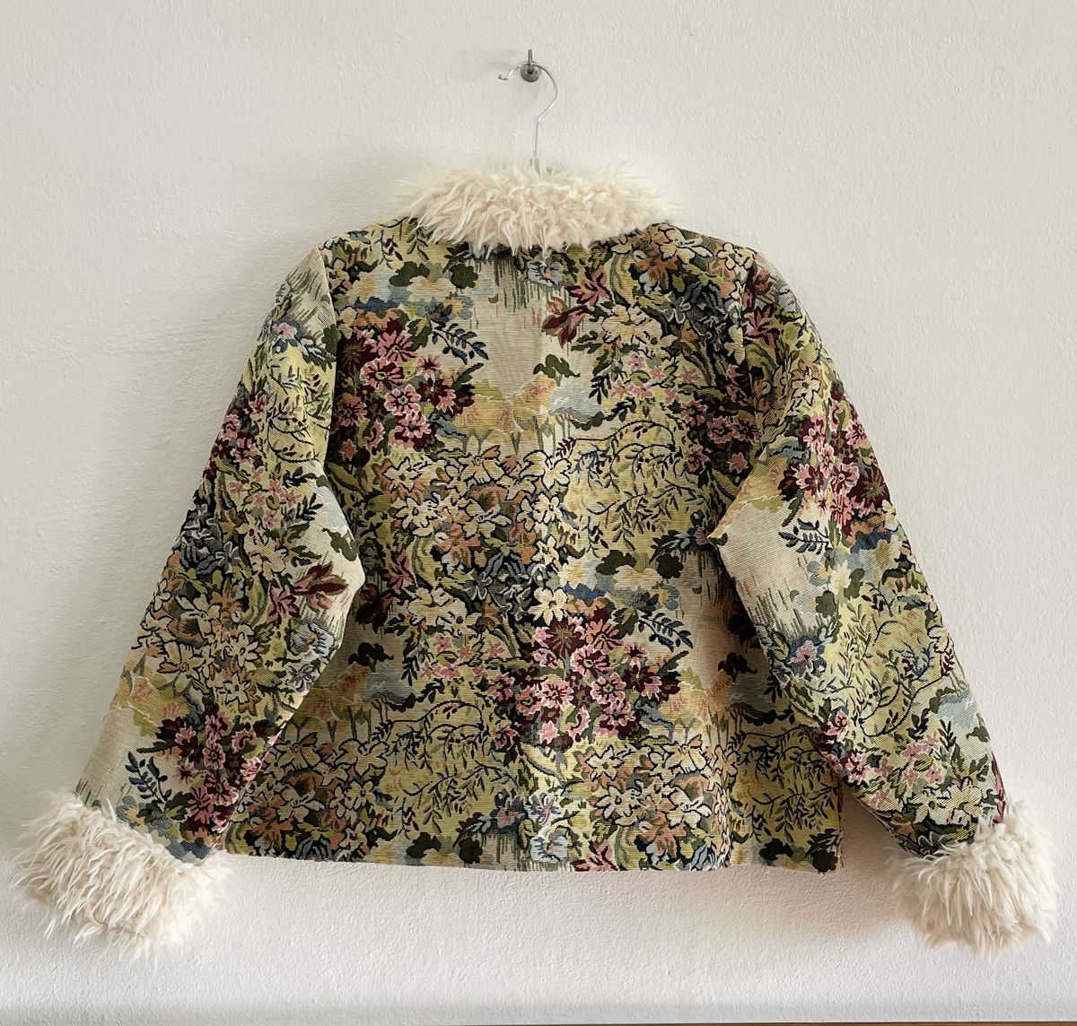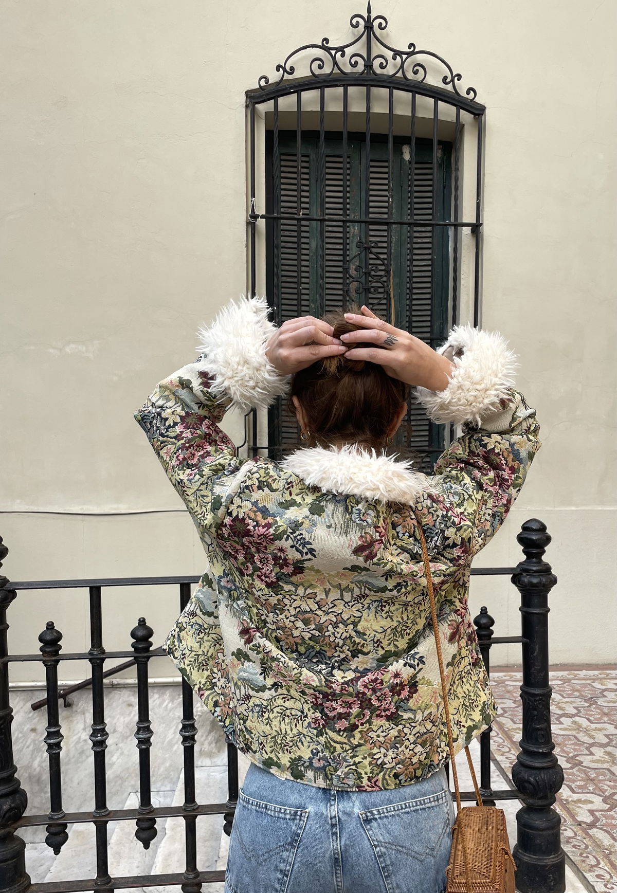 Campera hecha a partir de retazo de tapicería de gobelino floreado. Con piel en ruedo de mangas y cuello