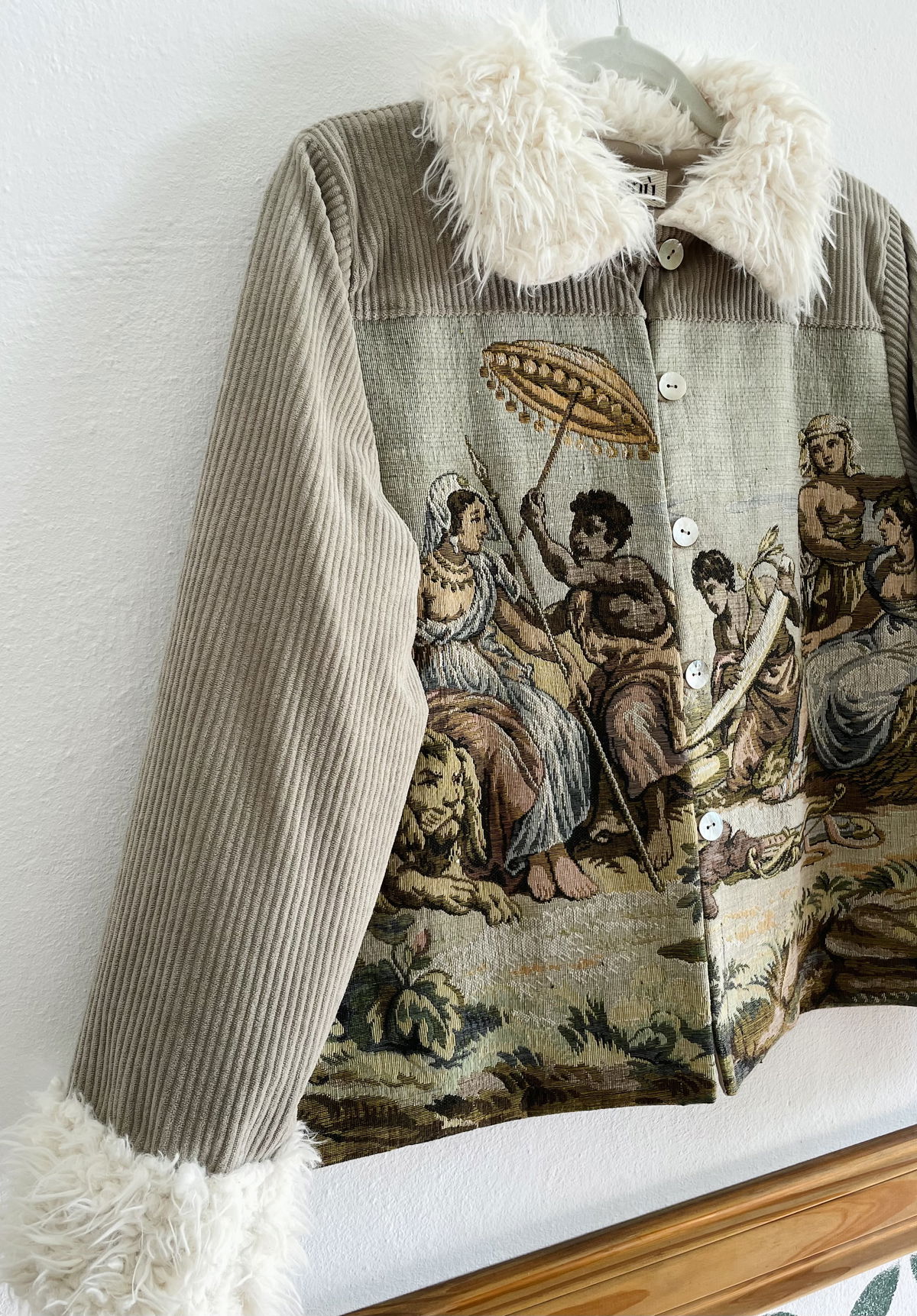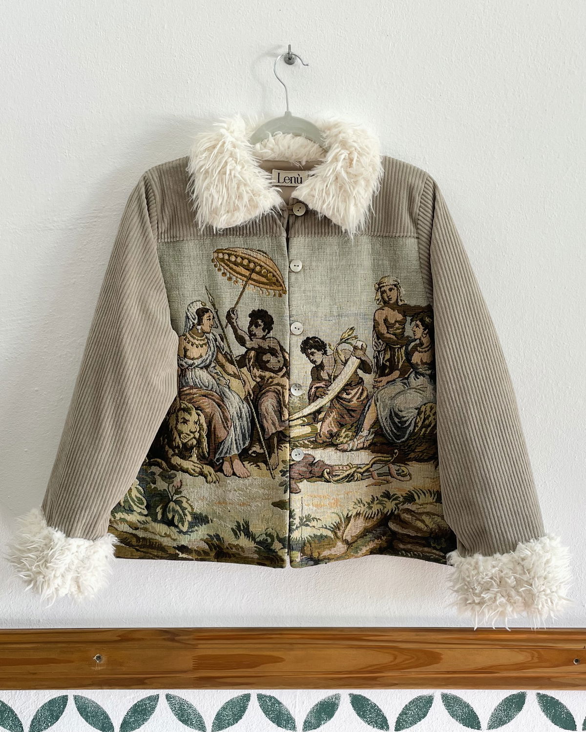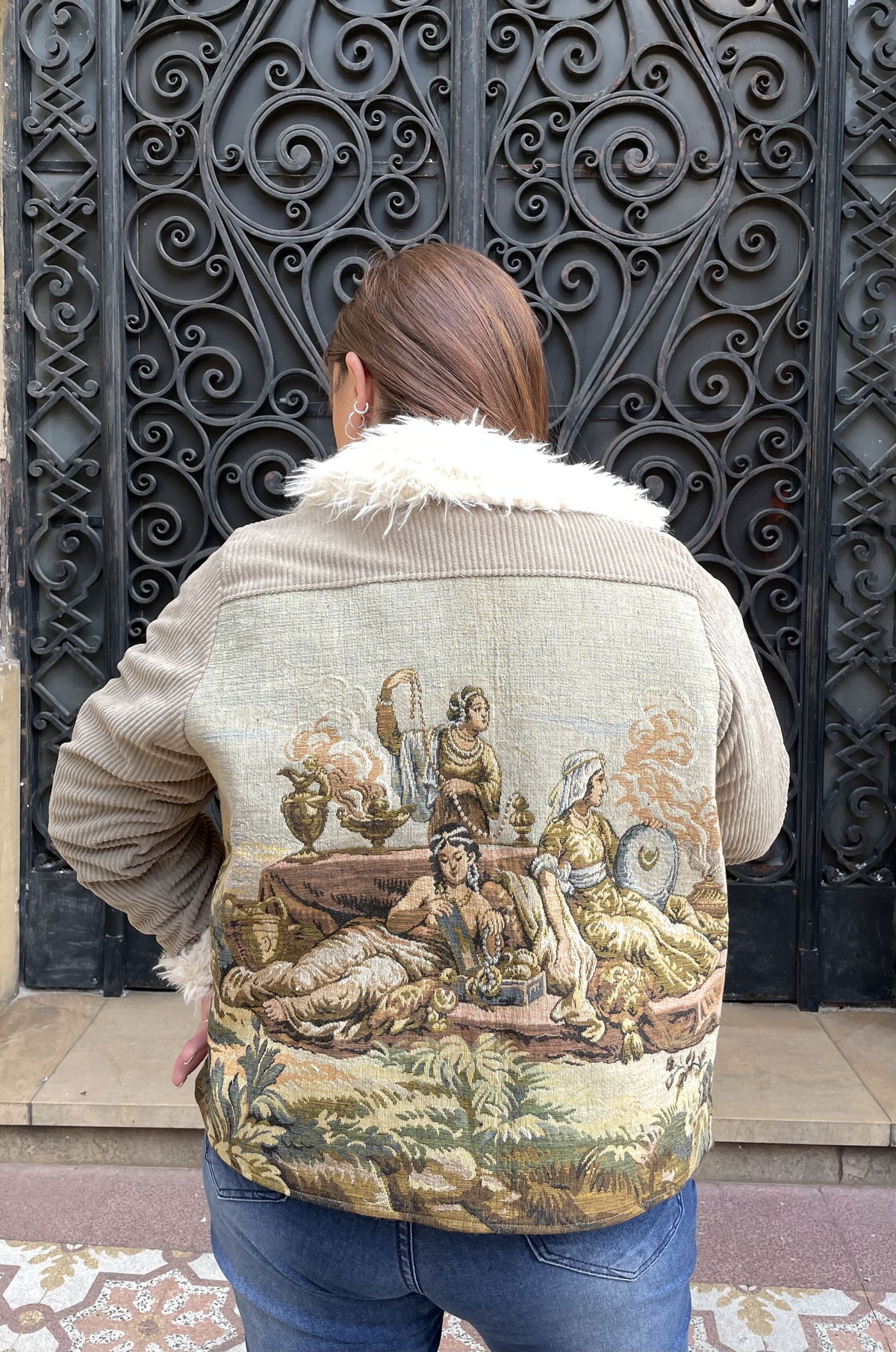 Campera hecha a partir de tapiz francés de gobelino. Con piel en ruedo de mangas y cuello