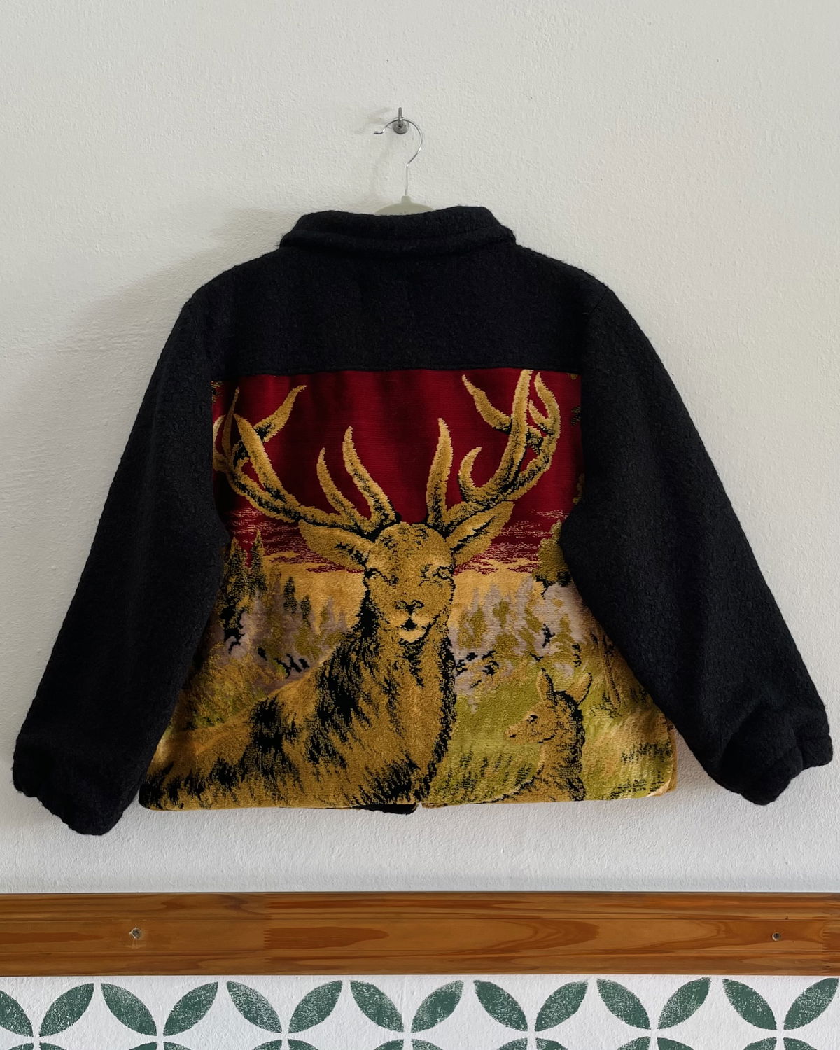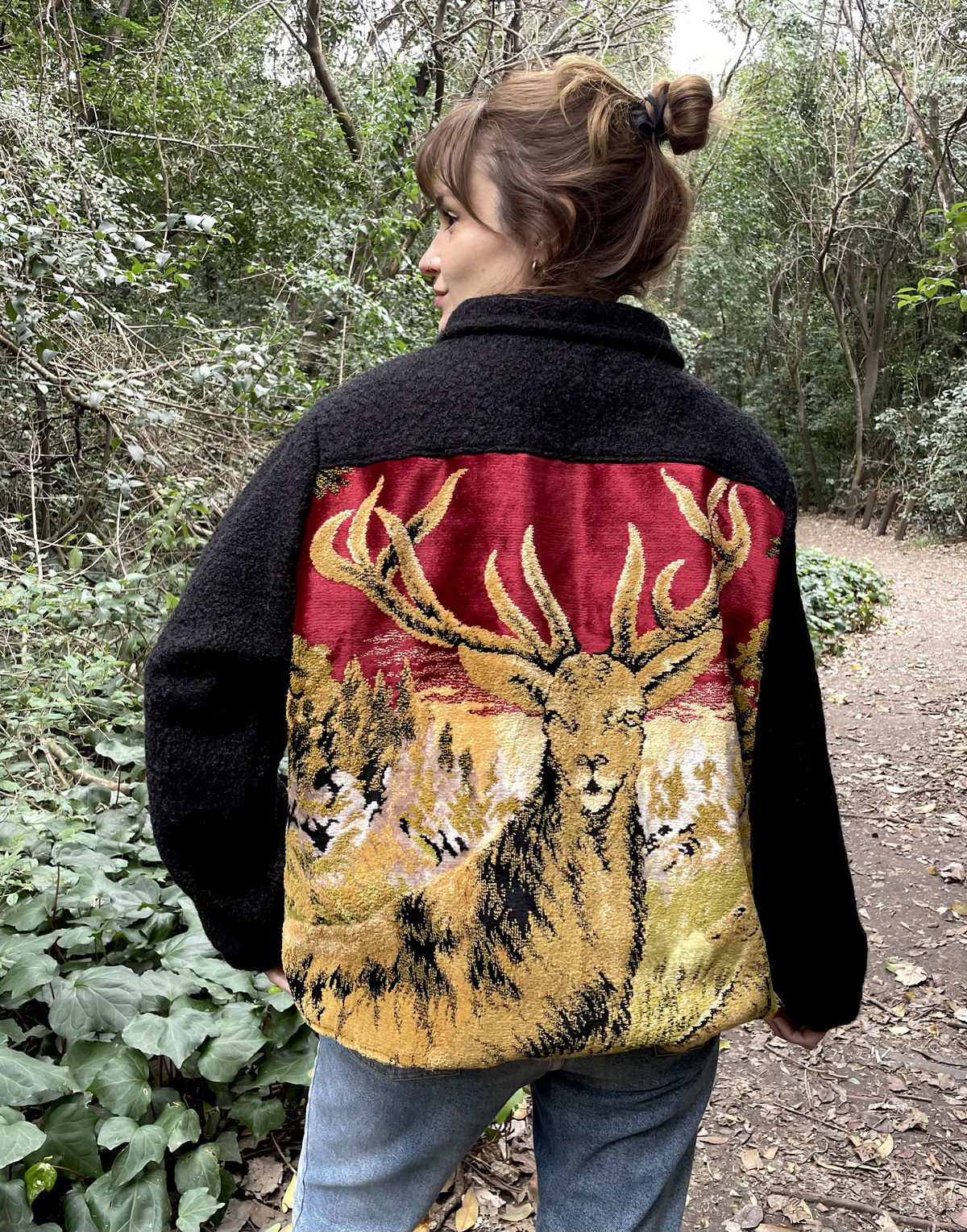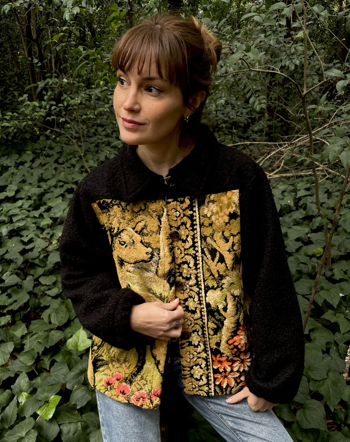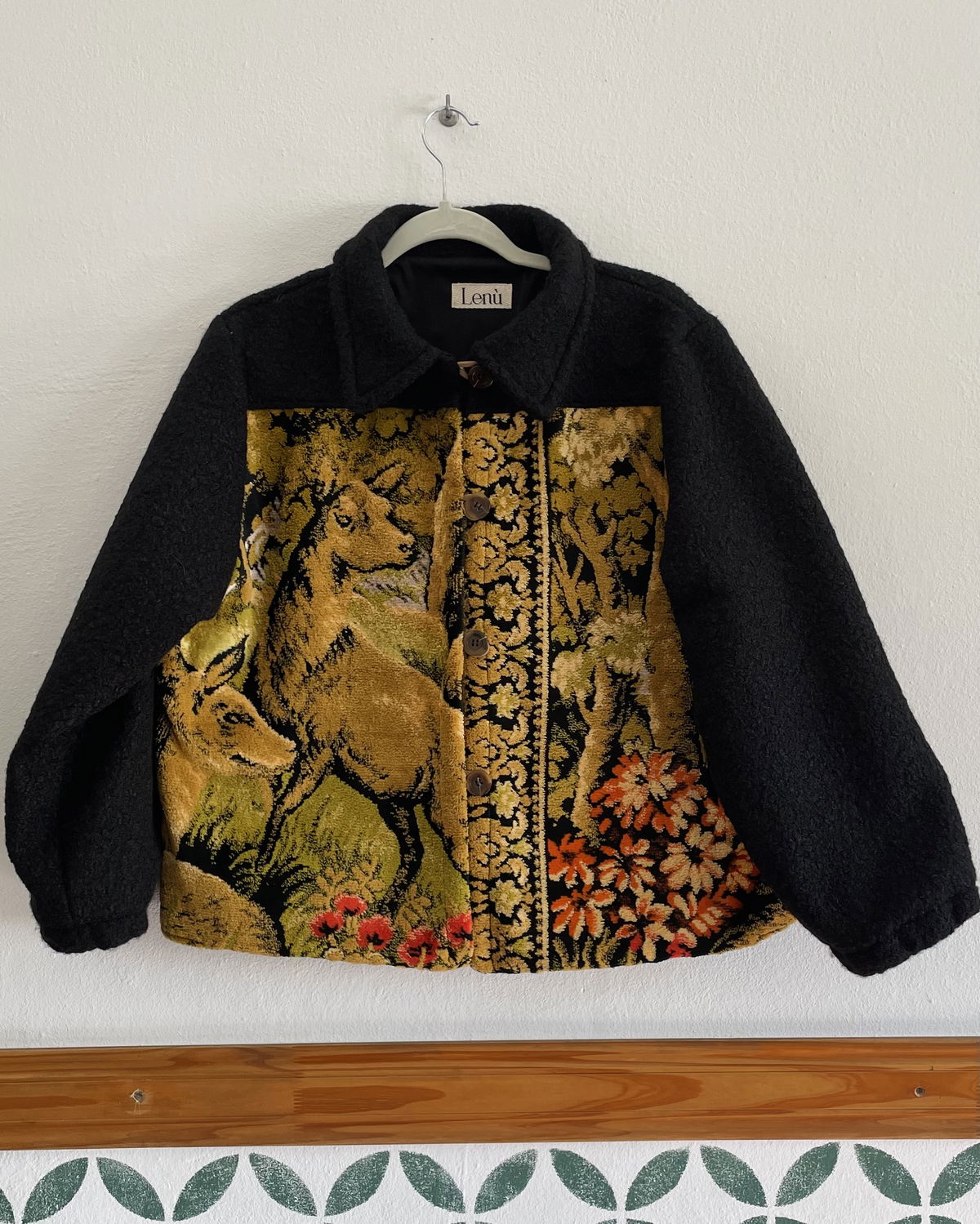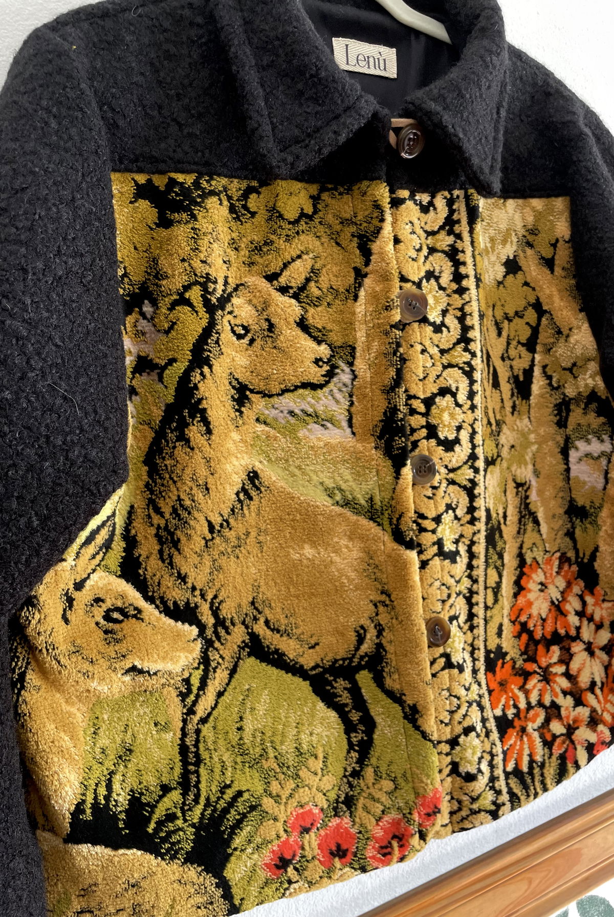 Campera hecha a partir de tapiz de terciopelo combinada con paño bouclé. Integramente forrada