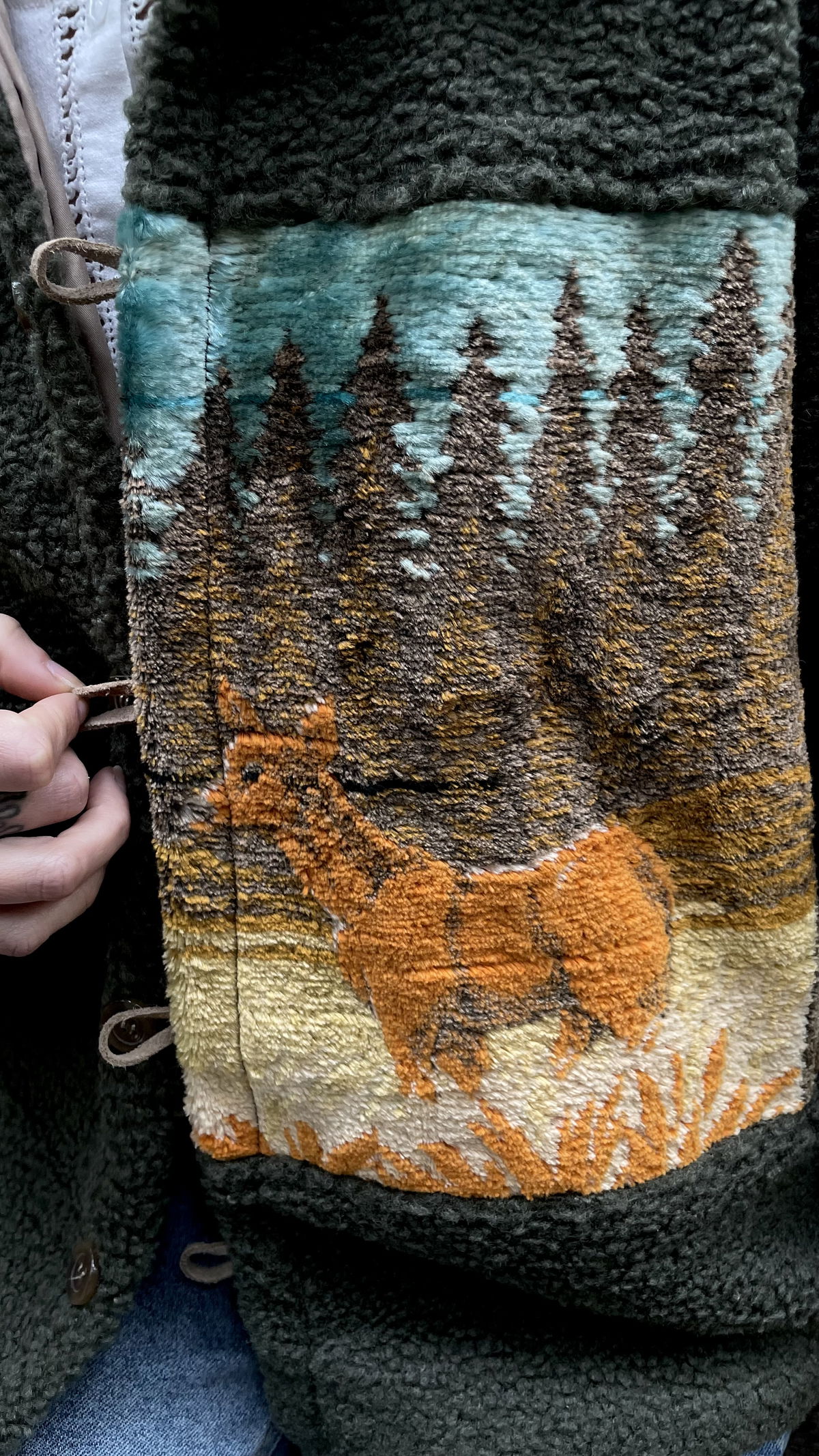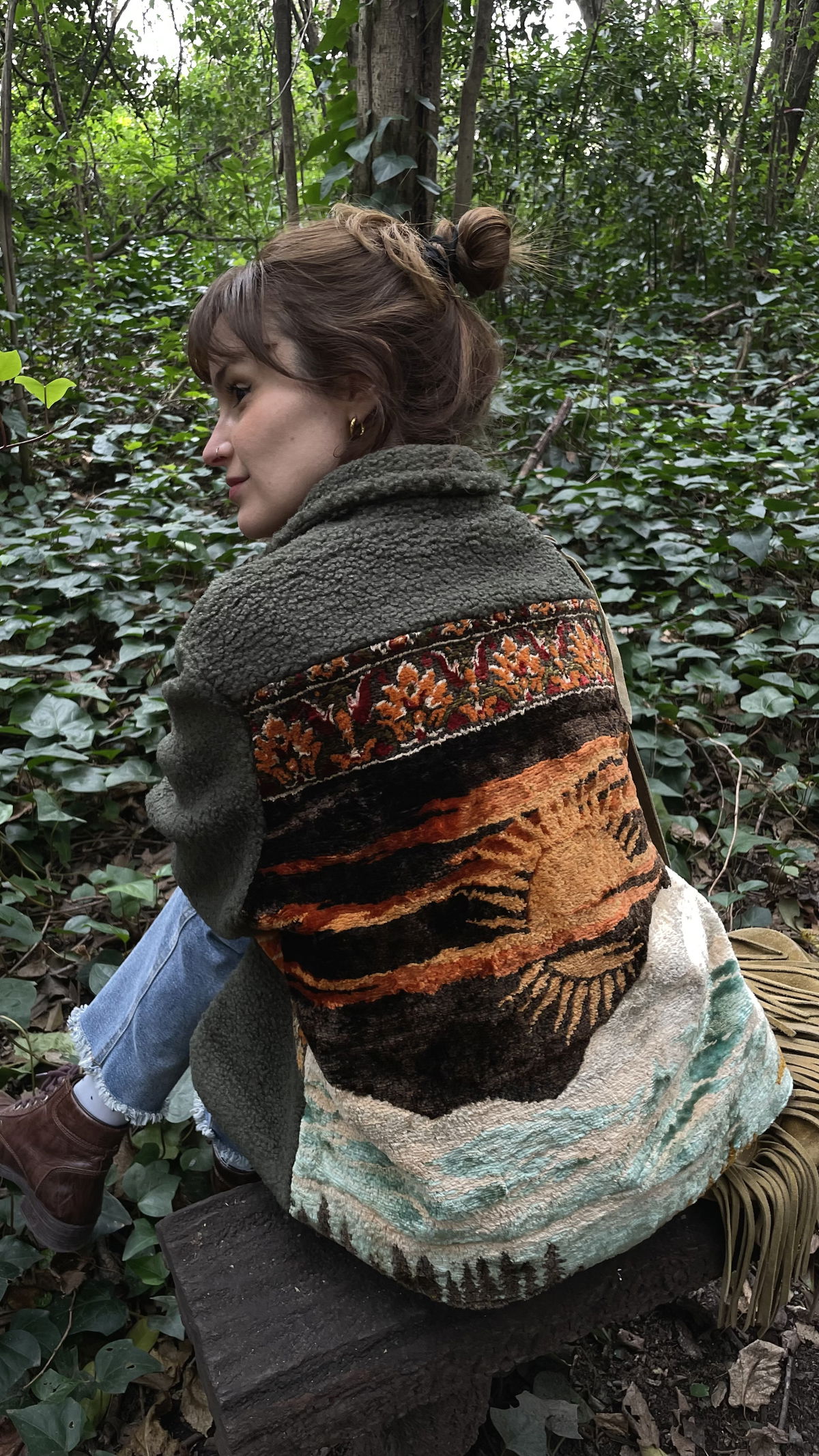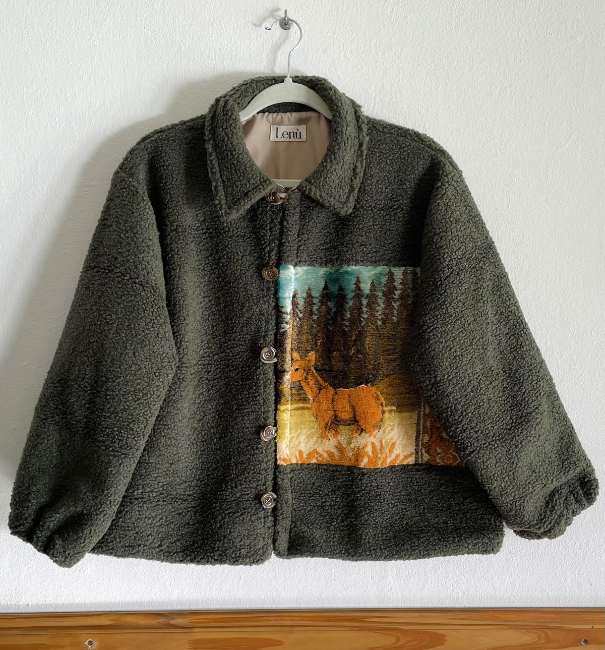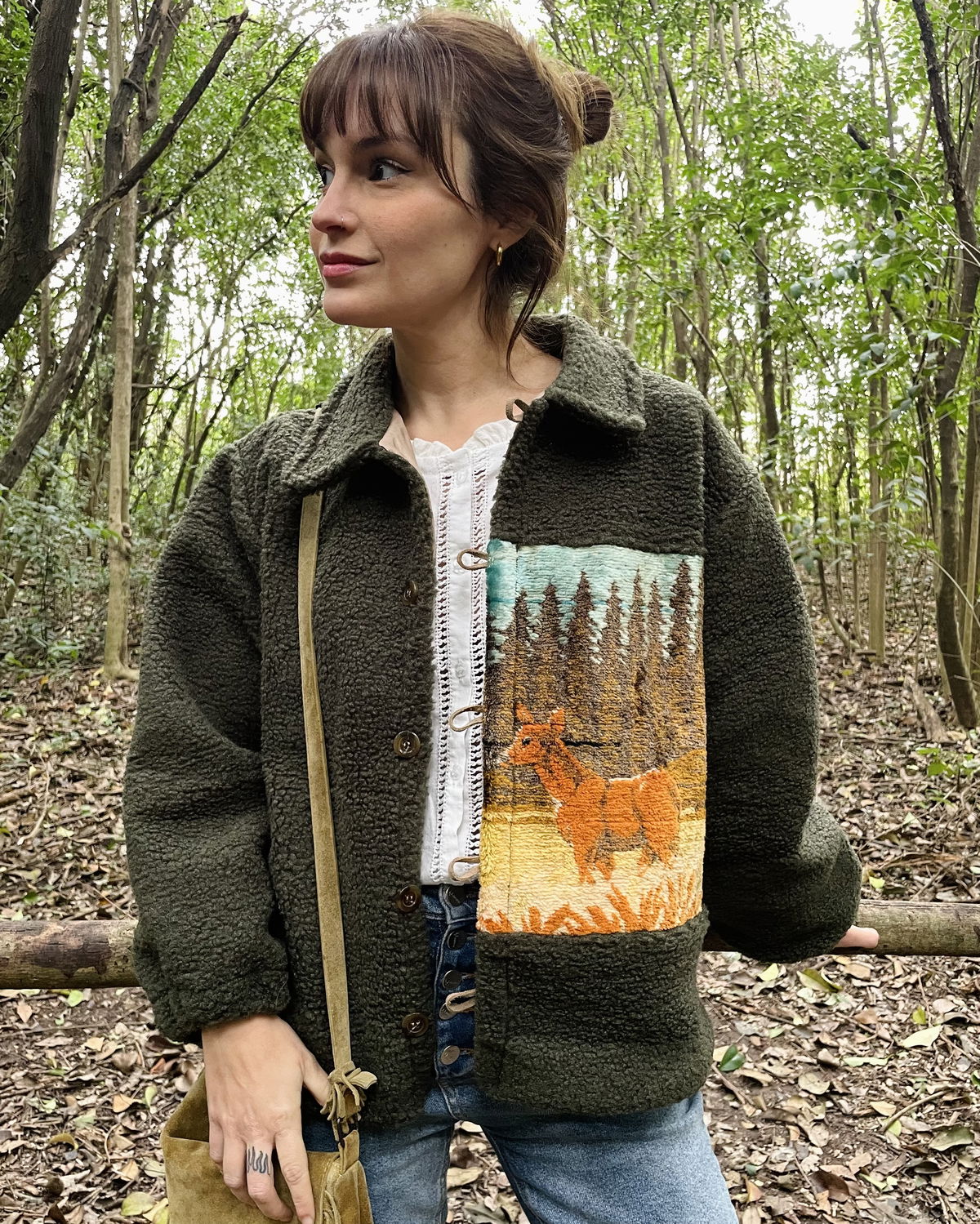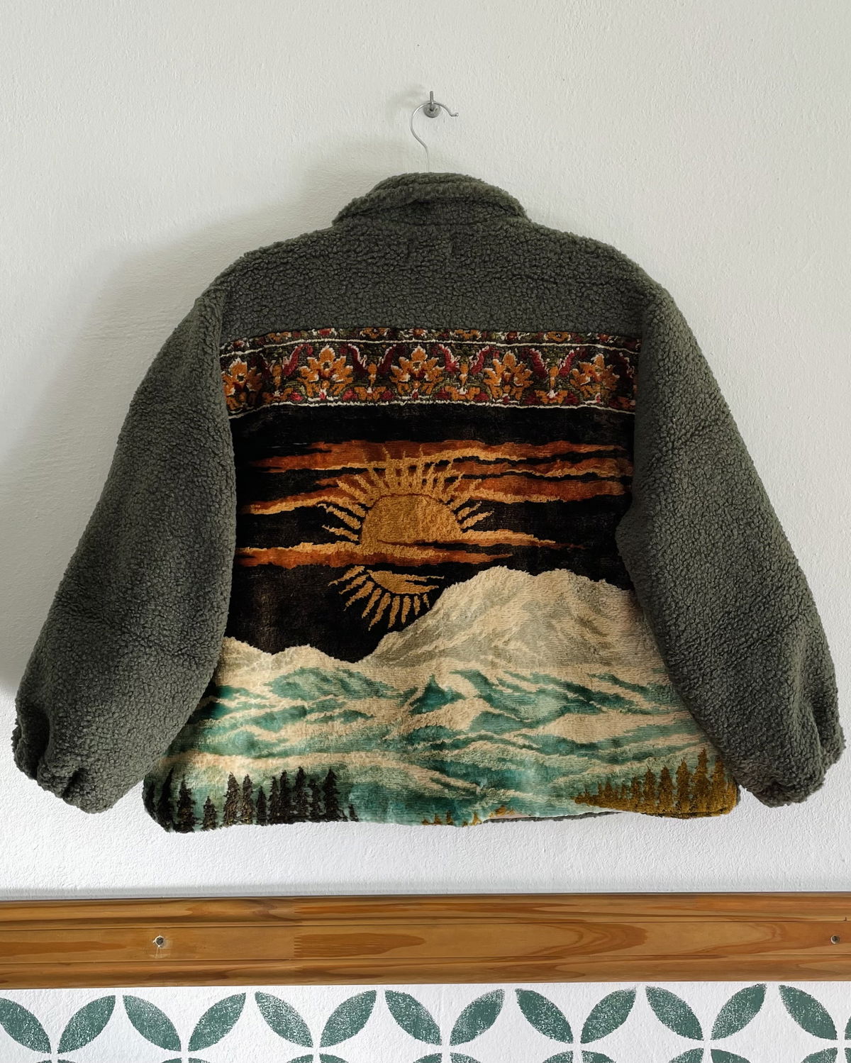 Campera hecha a partir de tapiz de terciopelo combinada con paño bouclé. Integramente forrada
