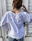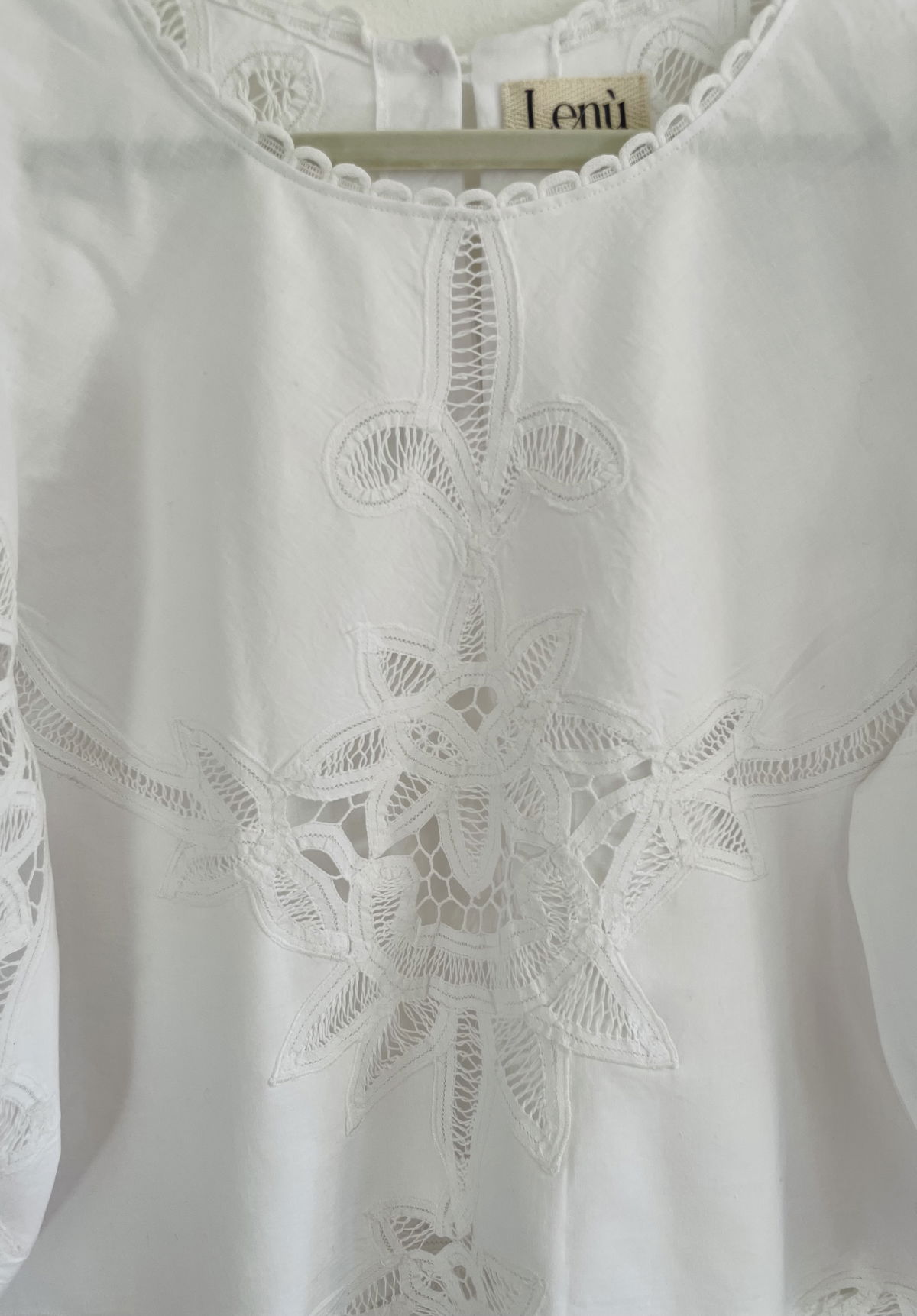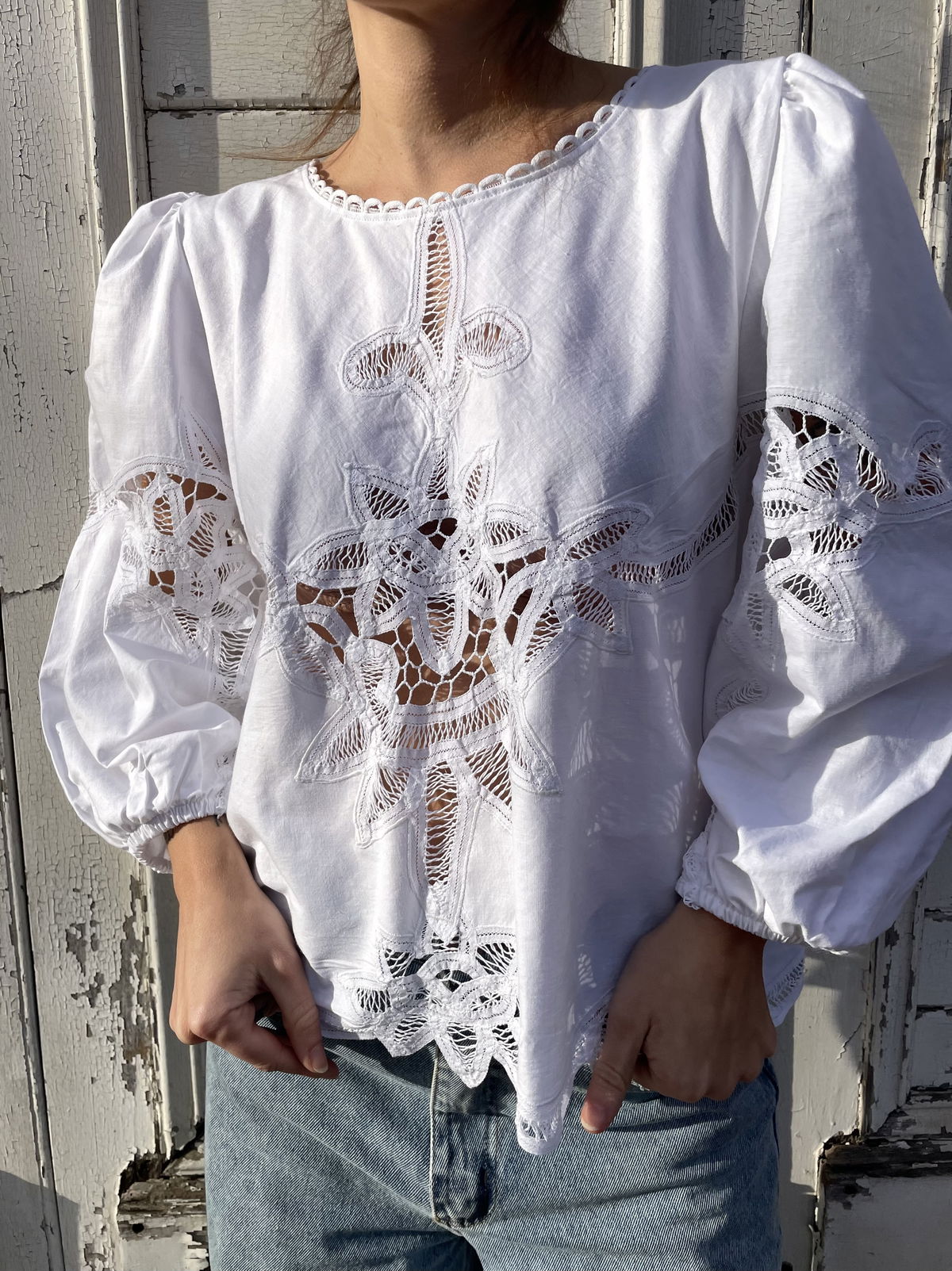 Blusa confeccionada a partir de mantel de algodón con detalles de encaje inglés. Mangas globo