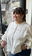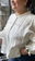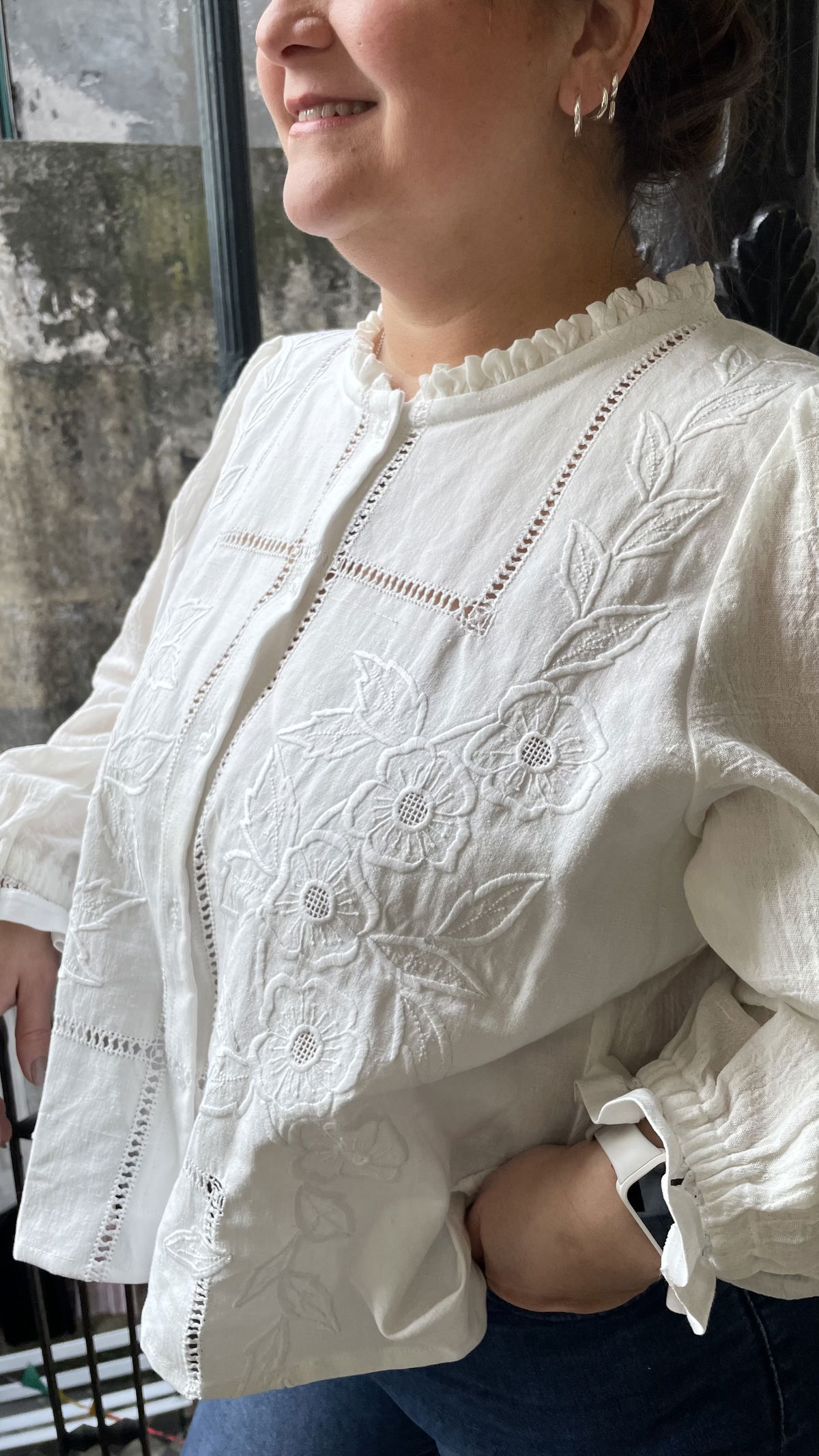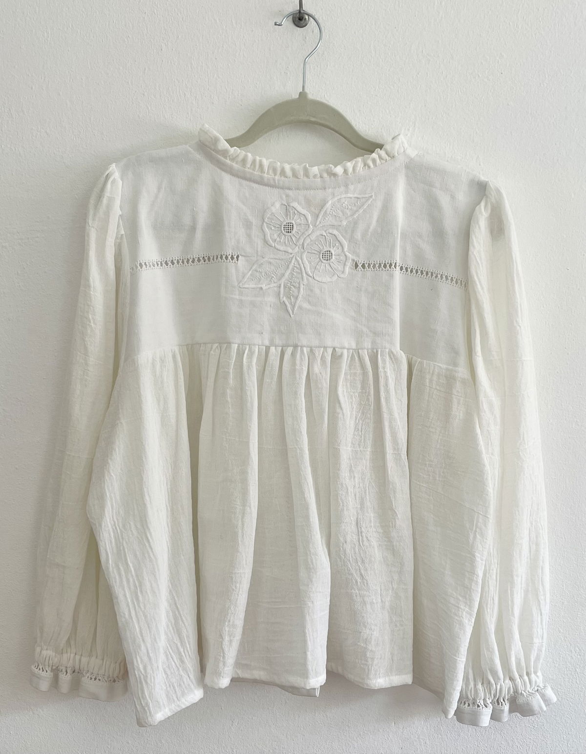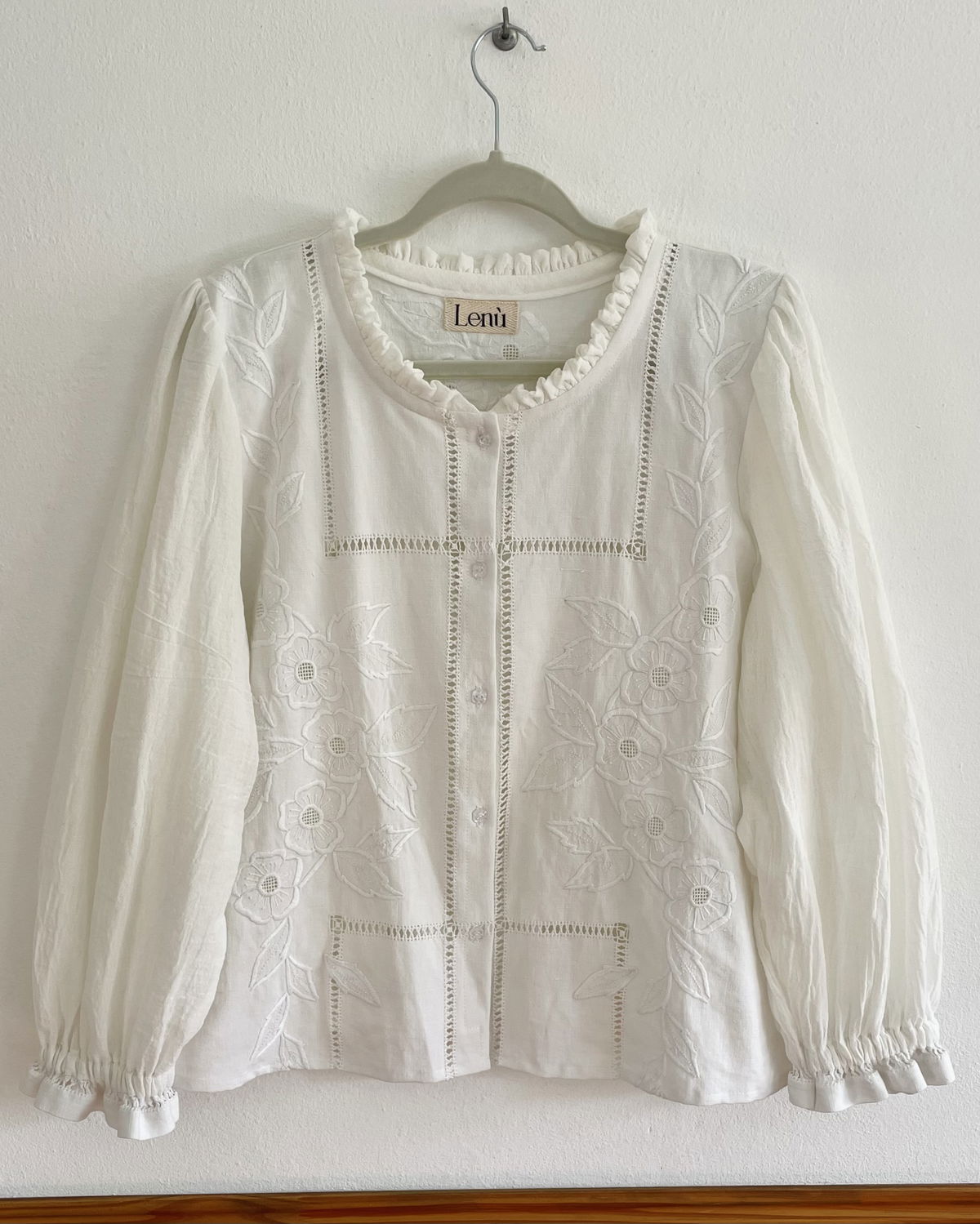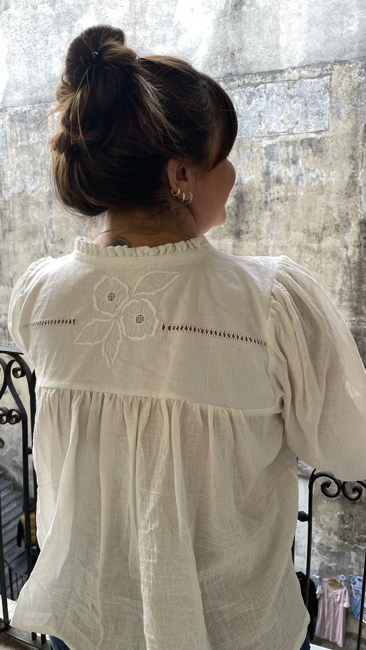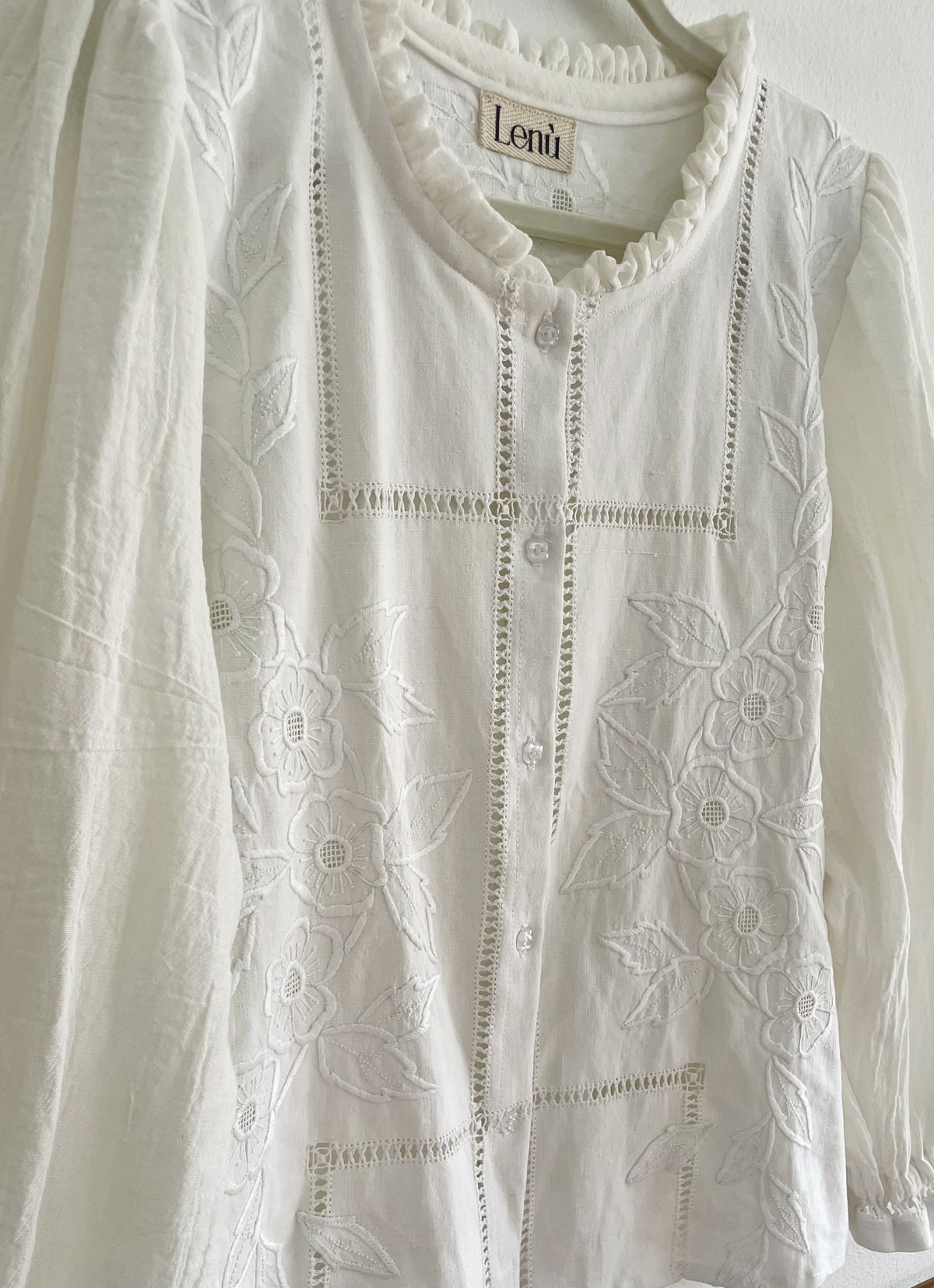 Camisa confeccionada a partir de mantel antiguo de algodón con bordados, calados y vainillas. Volado en cuello