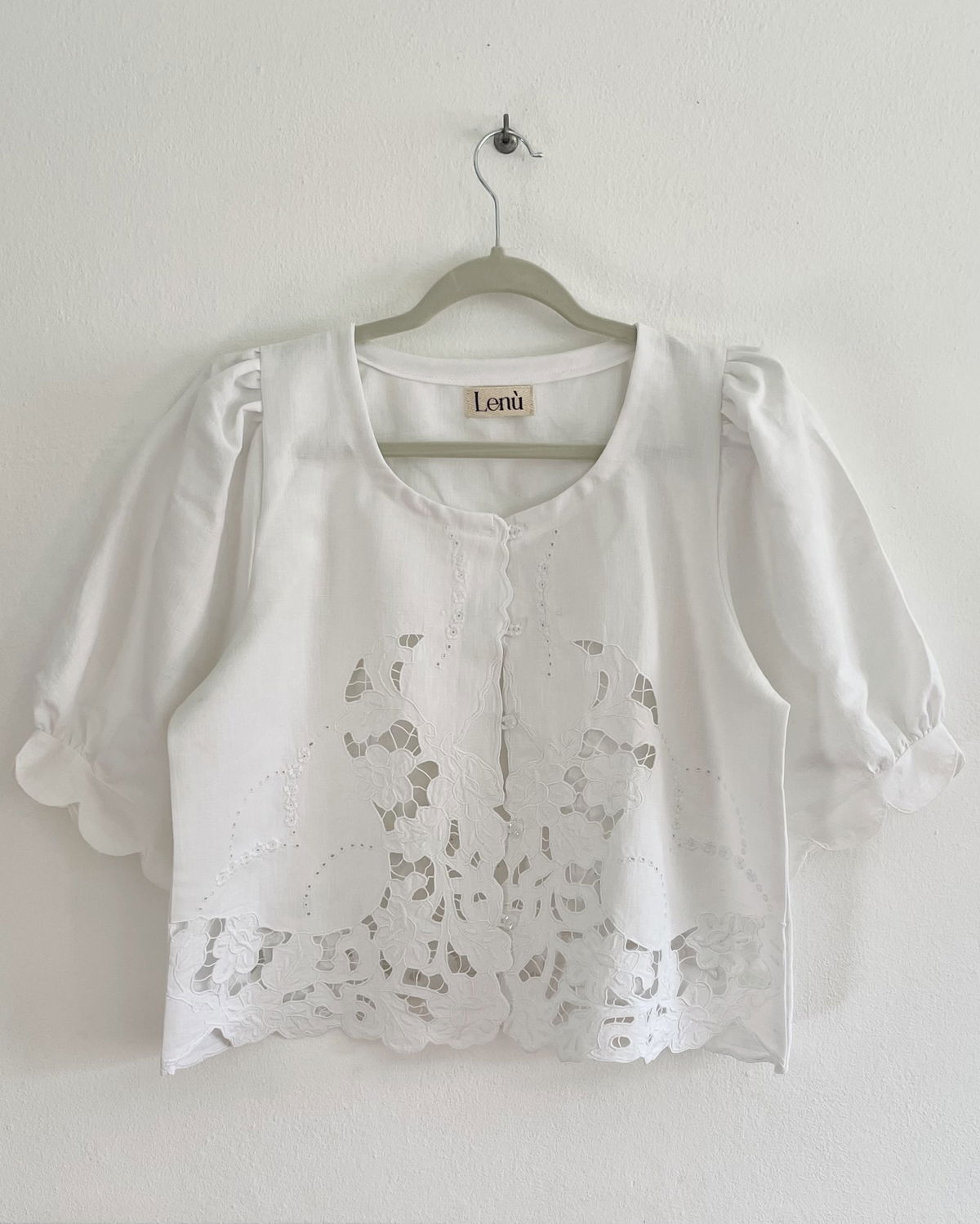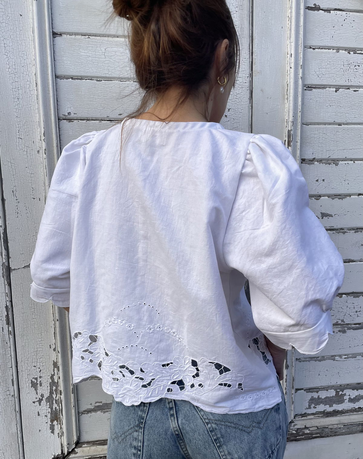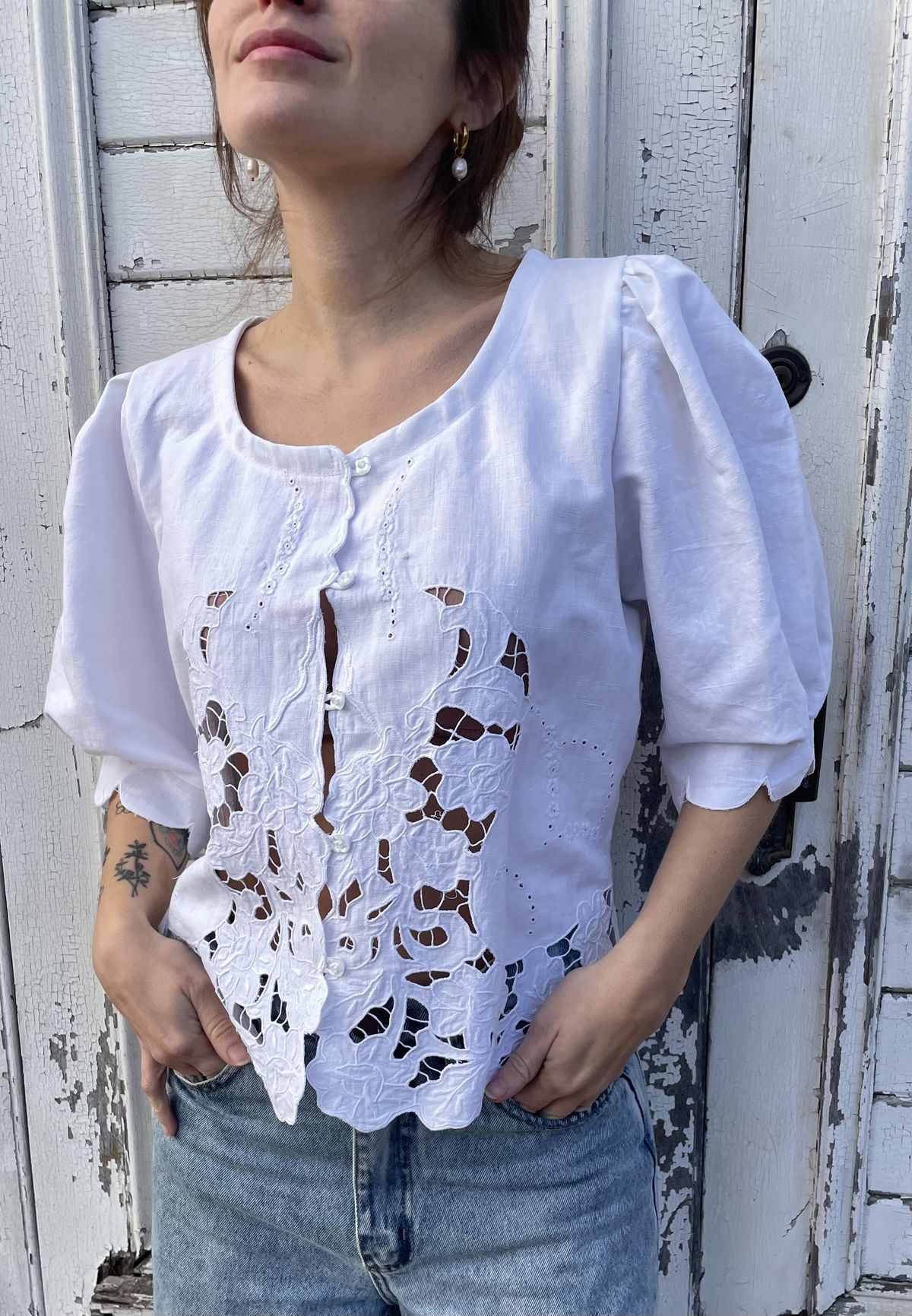 Blusa confeccionada a partir de sábana antigua de algodón con bordado richelieu y calados. Manga globo corta