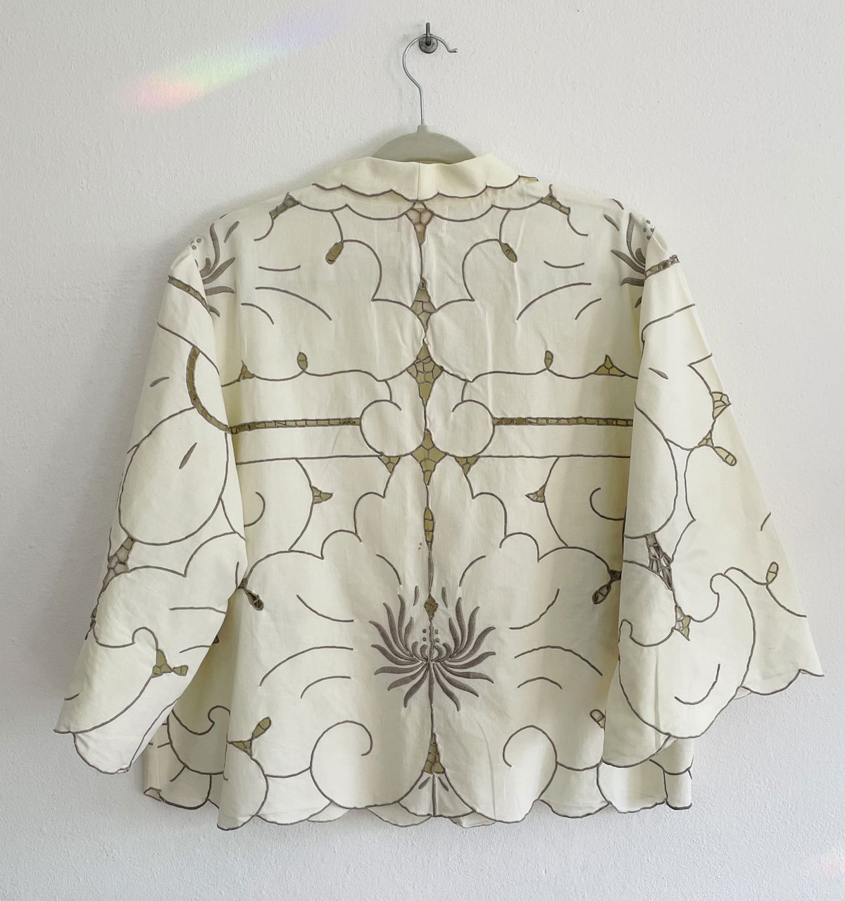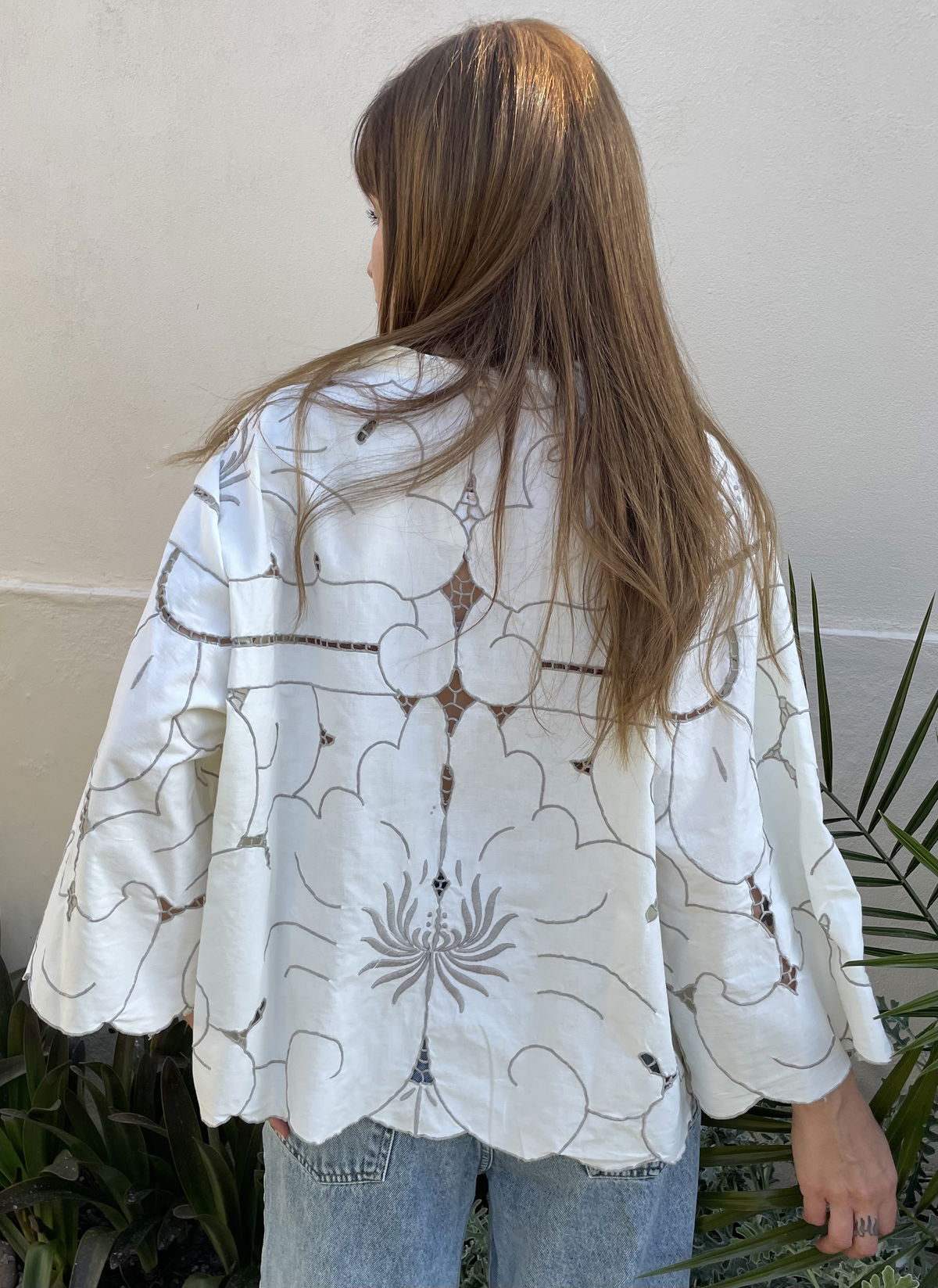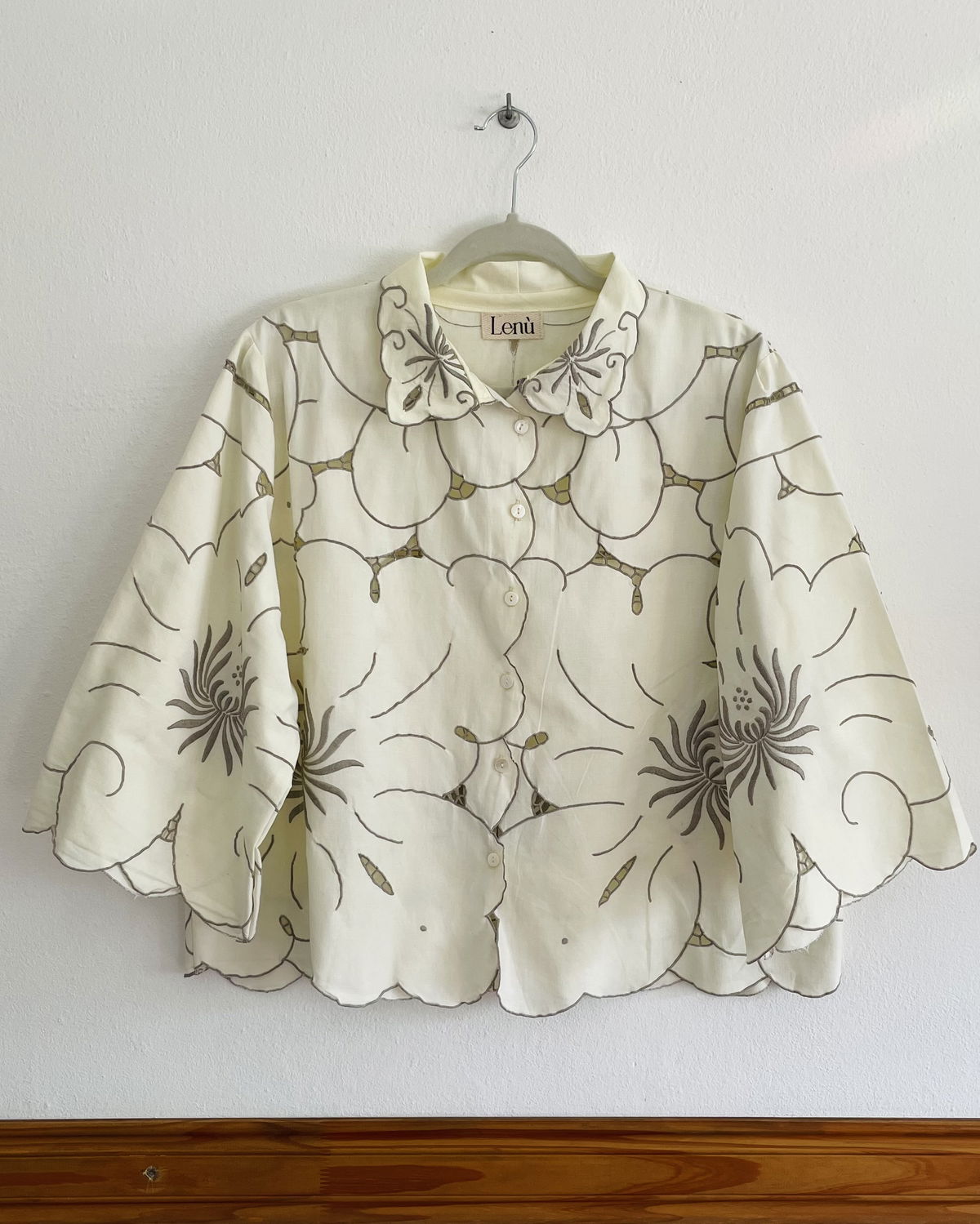 Camisa de algodón bordado y calado con cuello y mangas amplias.