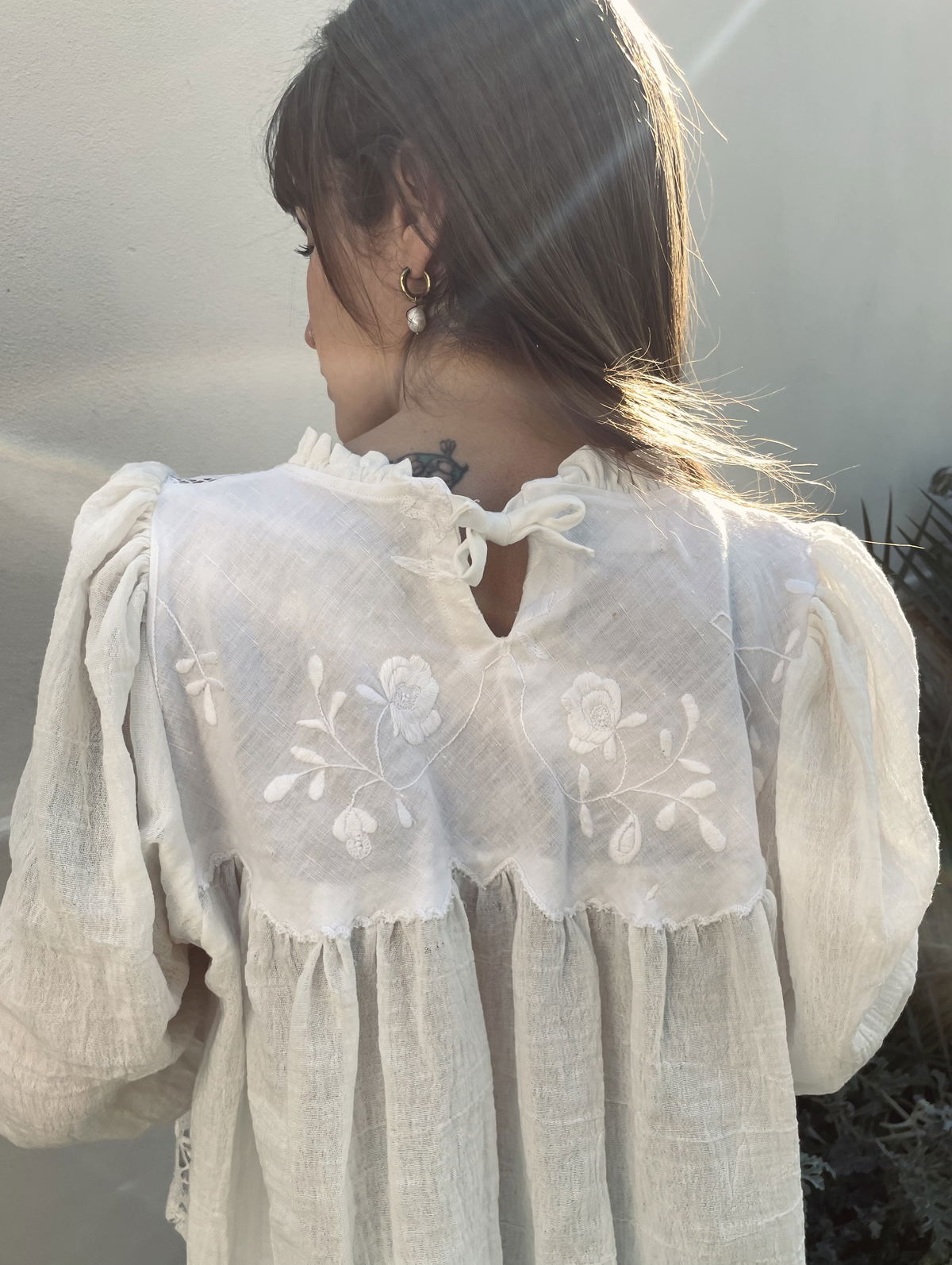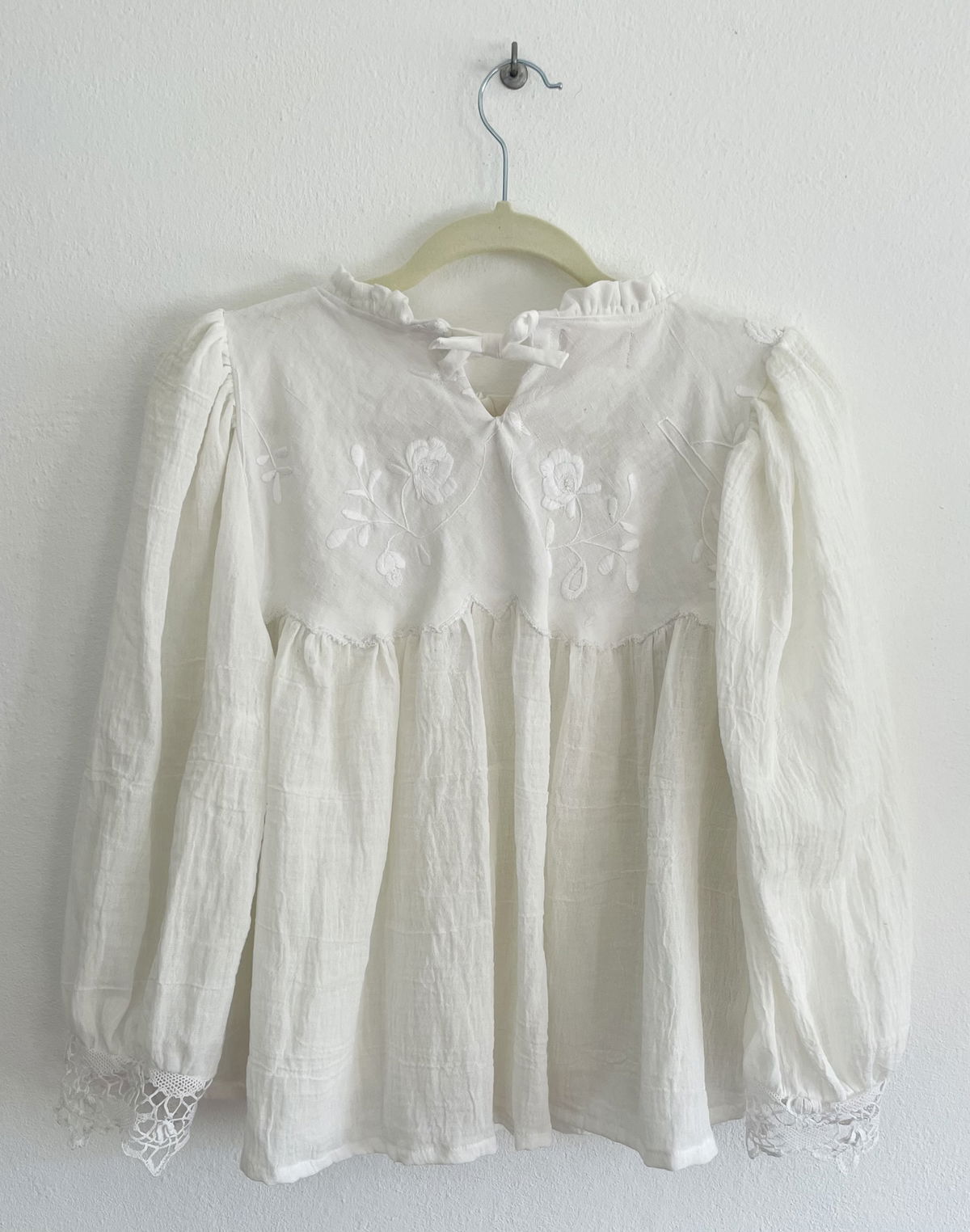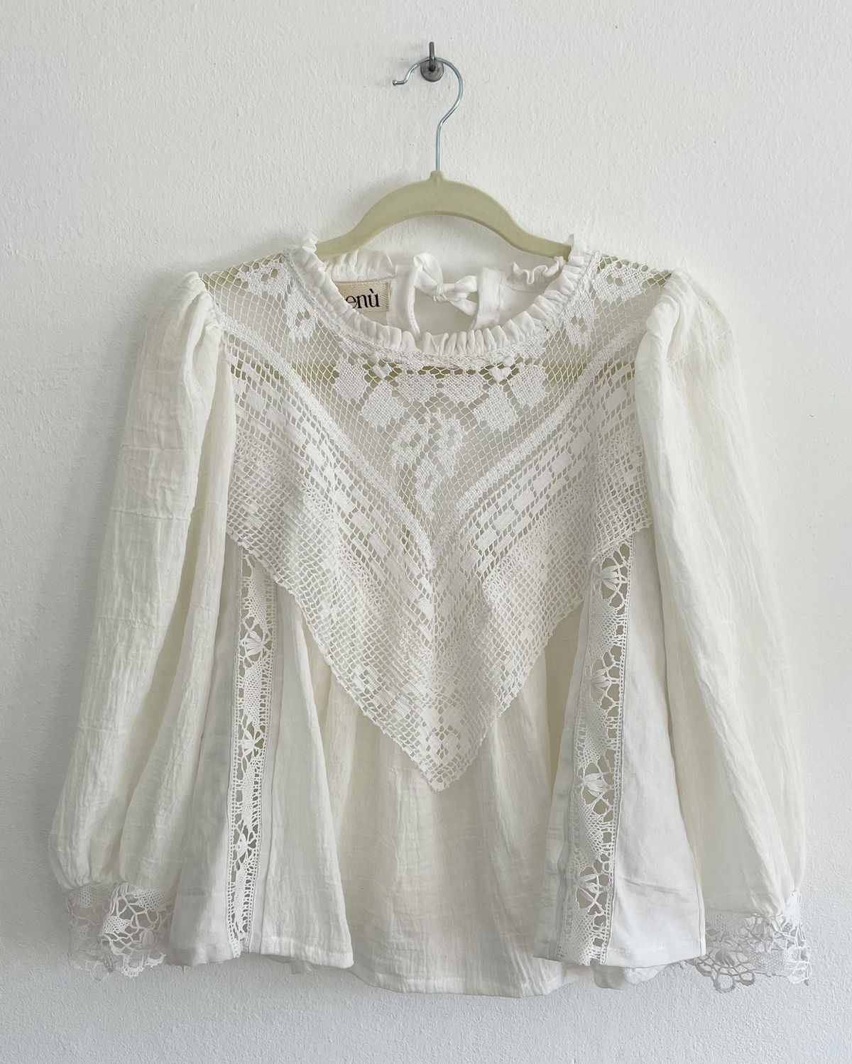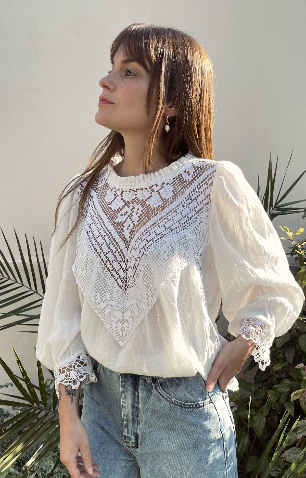 Blusa con recortes de tejido en crochet, filé frances y puntillas de encaje de bolillos.