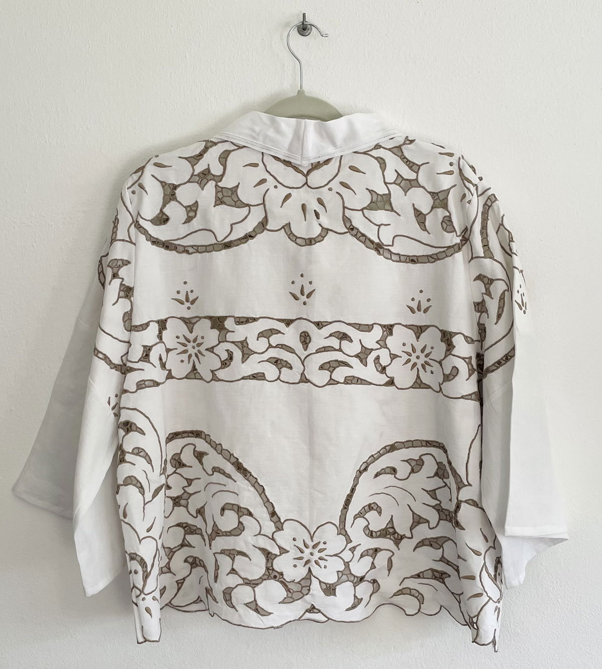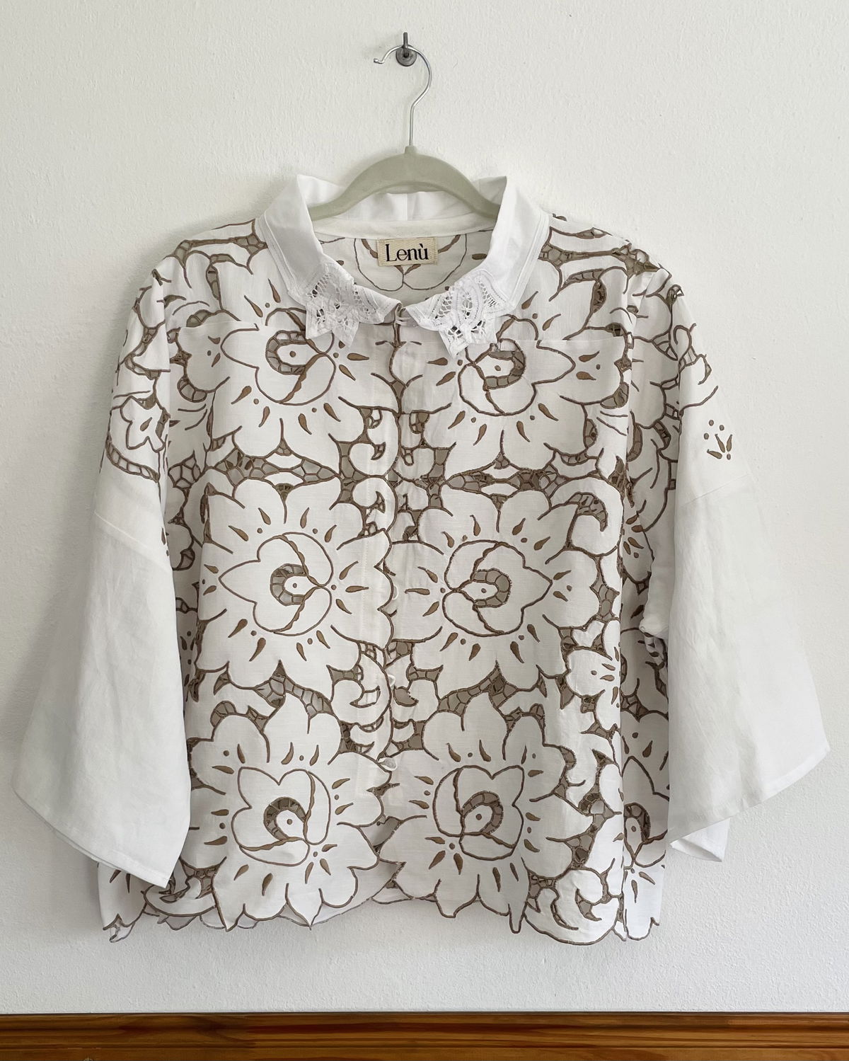 Camisa de algodón bordado español con cuello de encaje ingles y mangas amplias.
