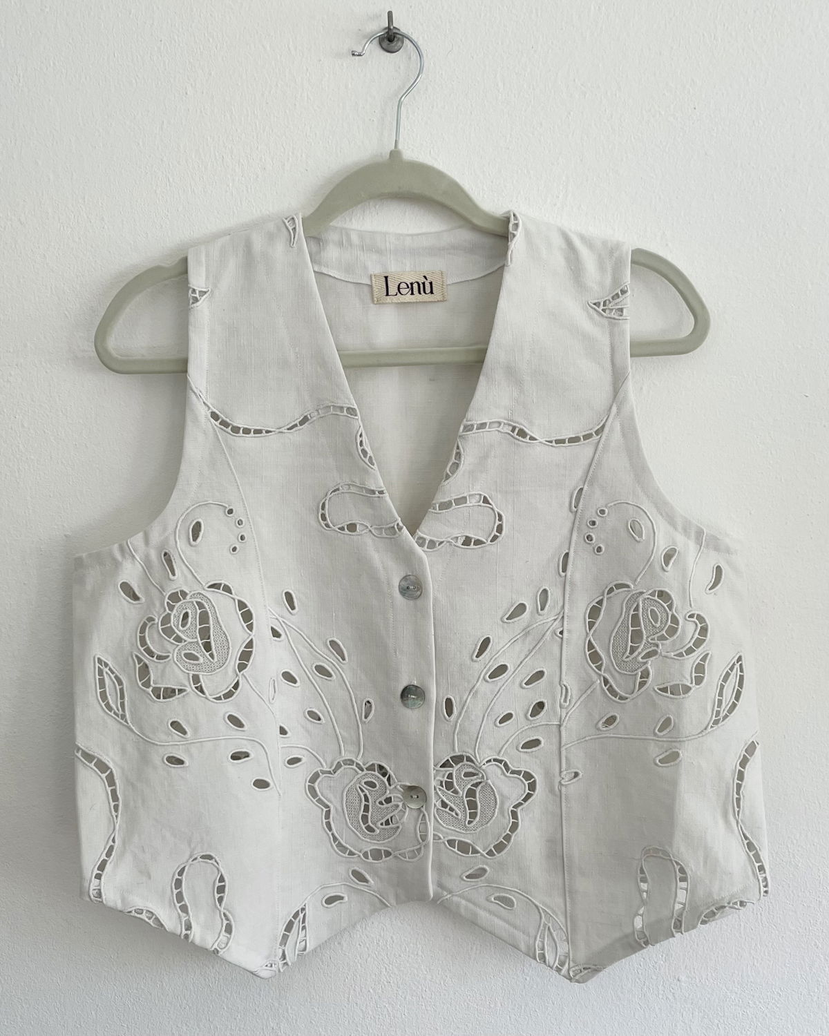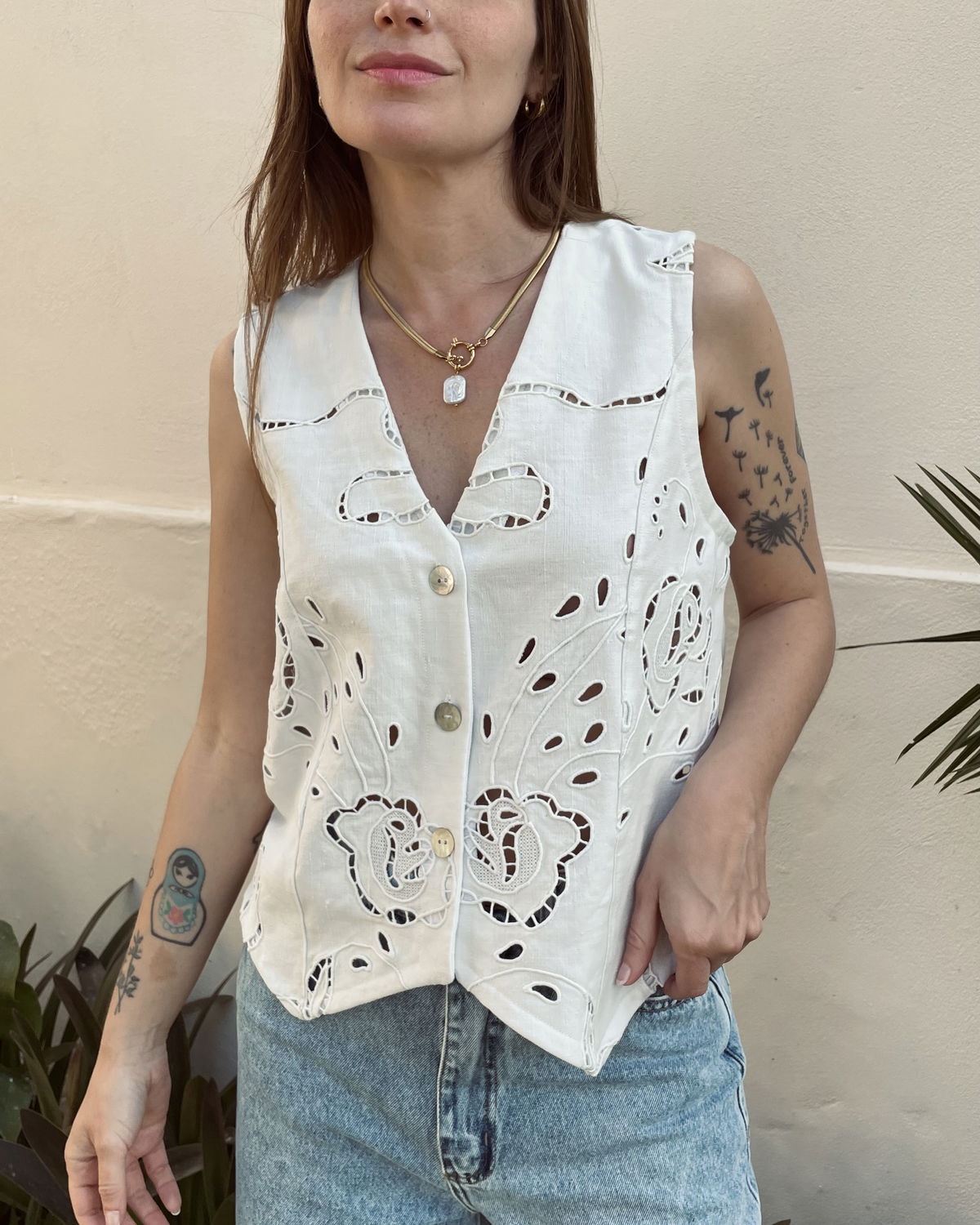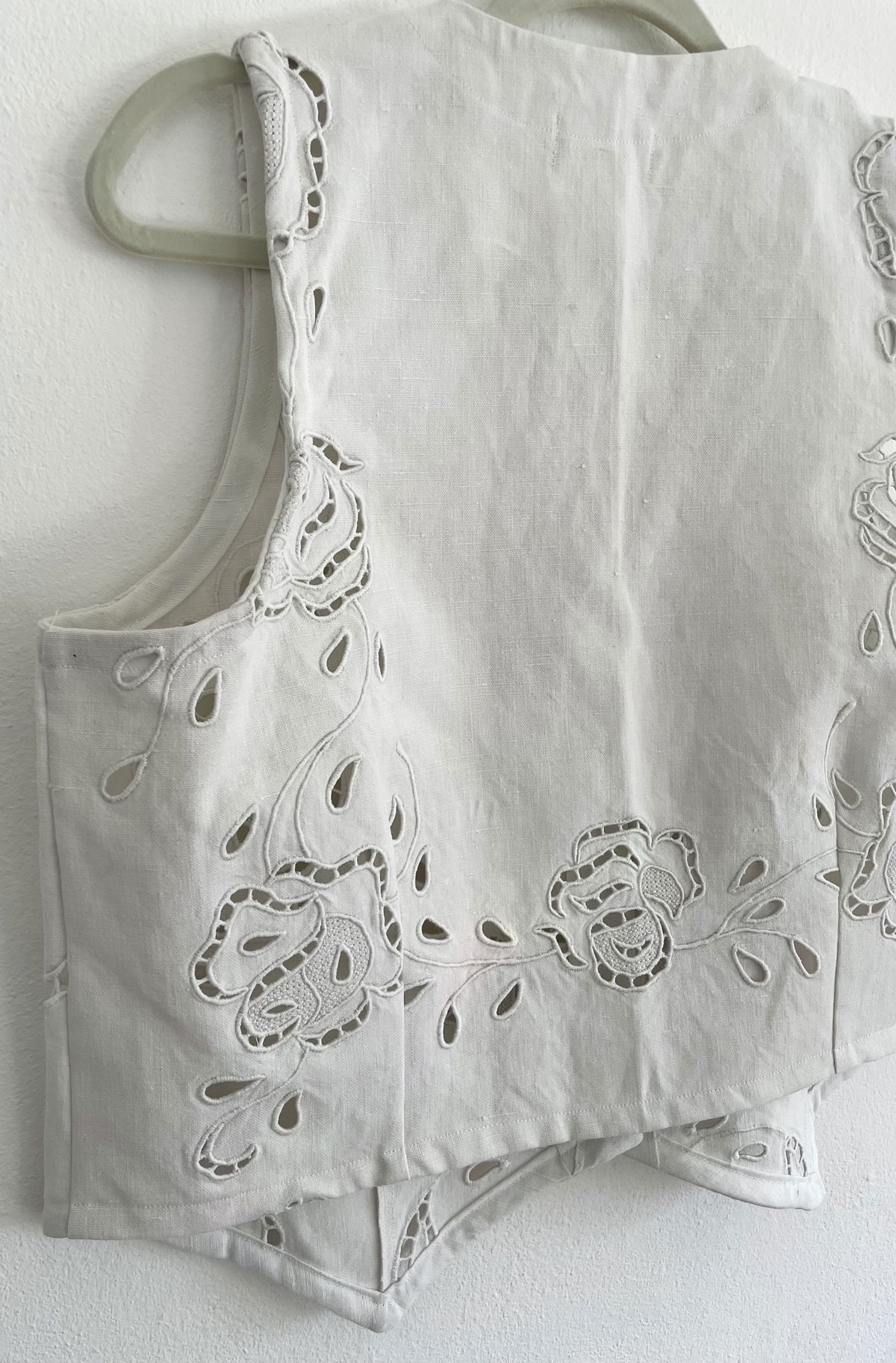 Chaleco sastrero confeccionado en granité (tela de algodón con cuerpo estilo gabardina o Jean) con bordado richelieu y calados