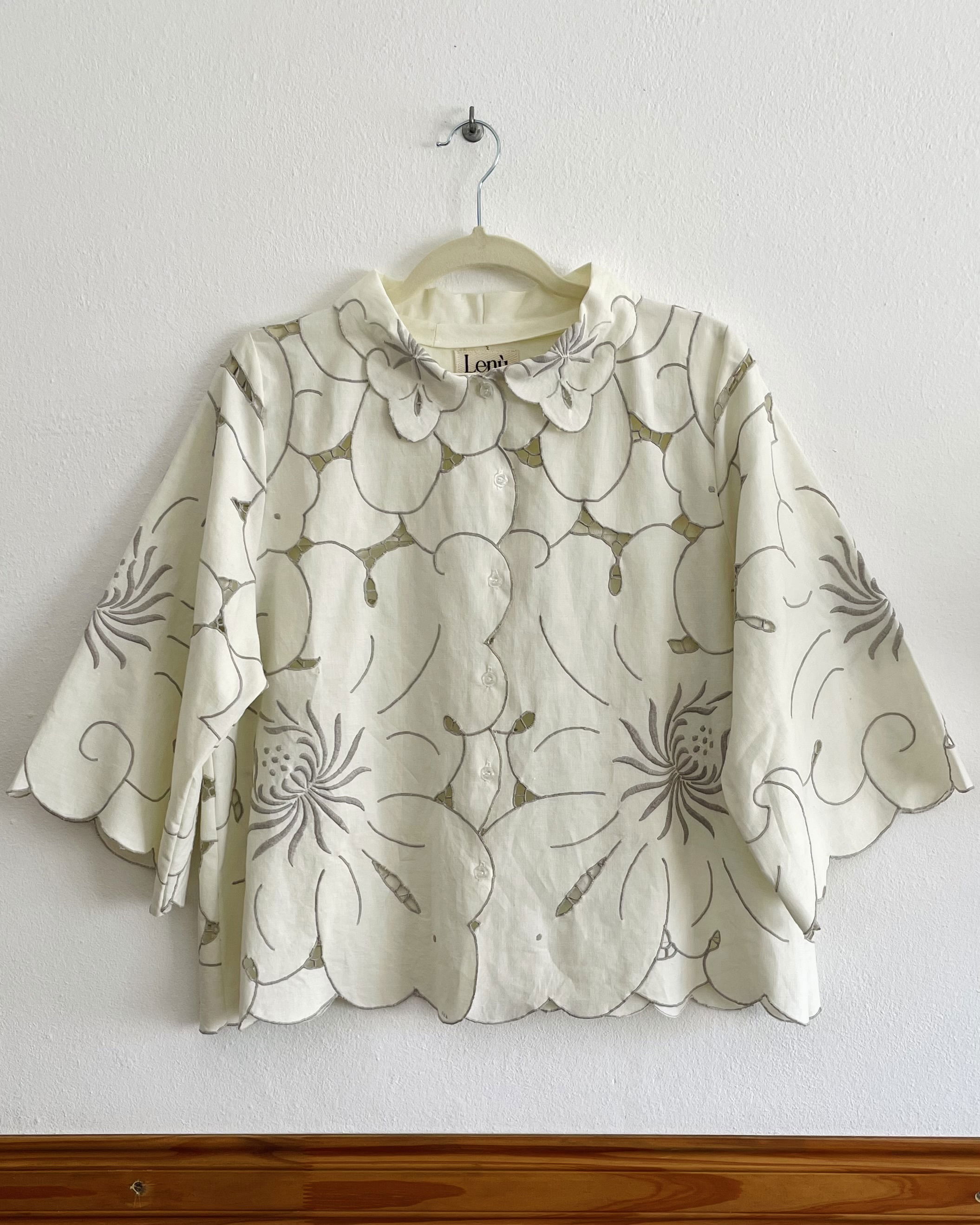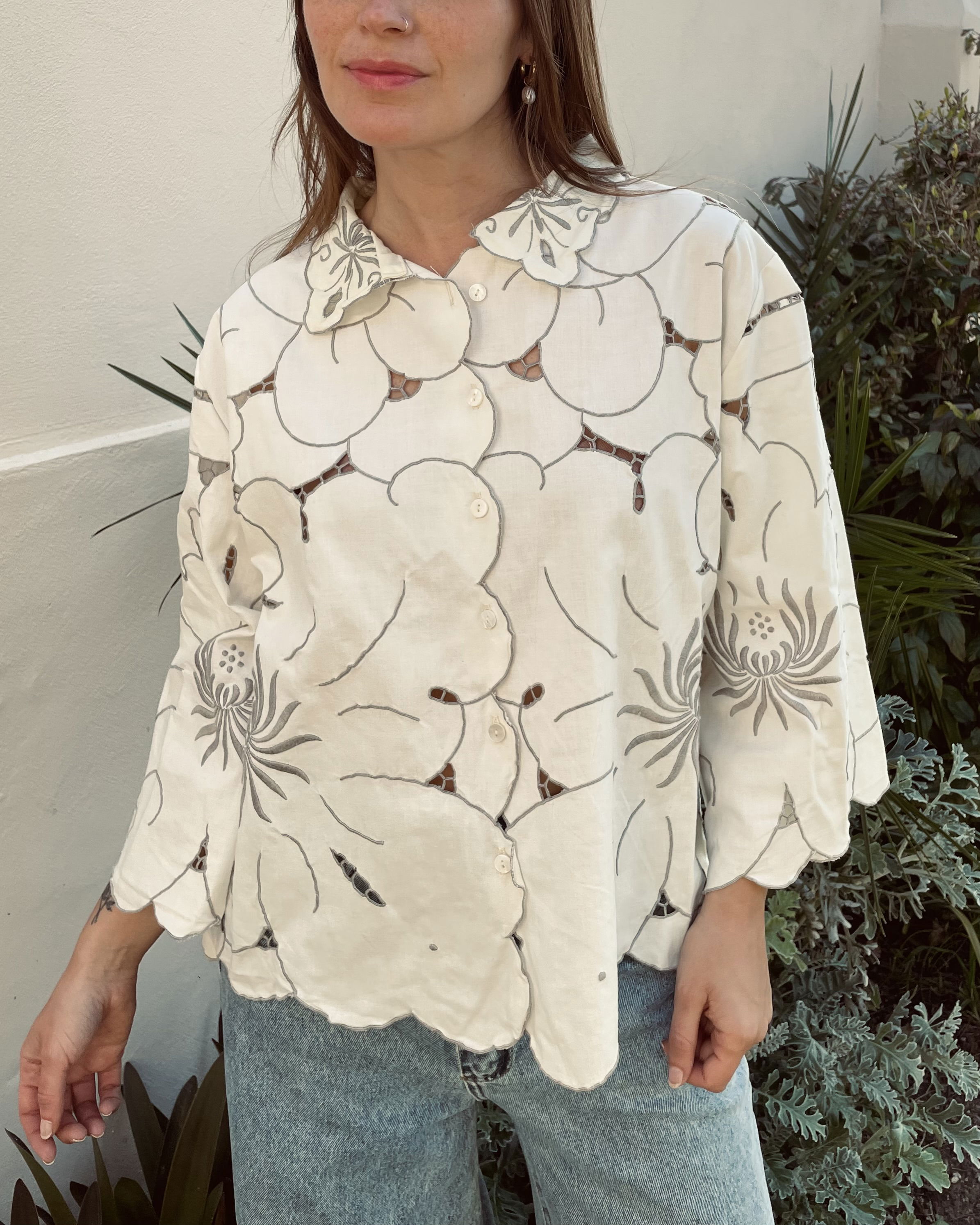 Camisa de algodón bordado y calado con cuello y mangas amplias.