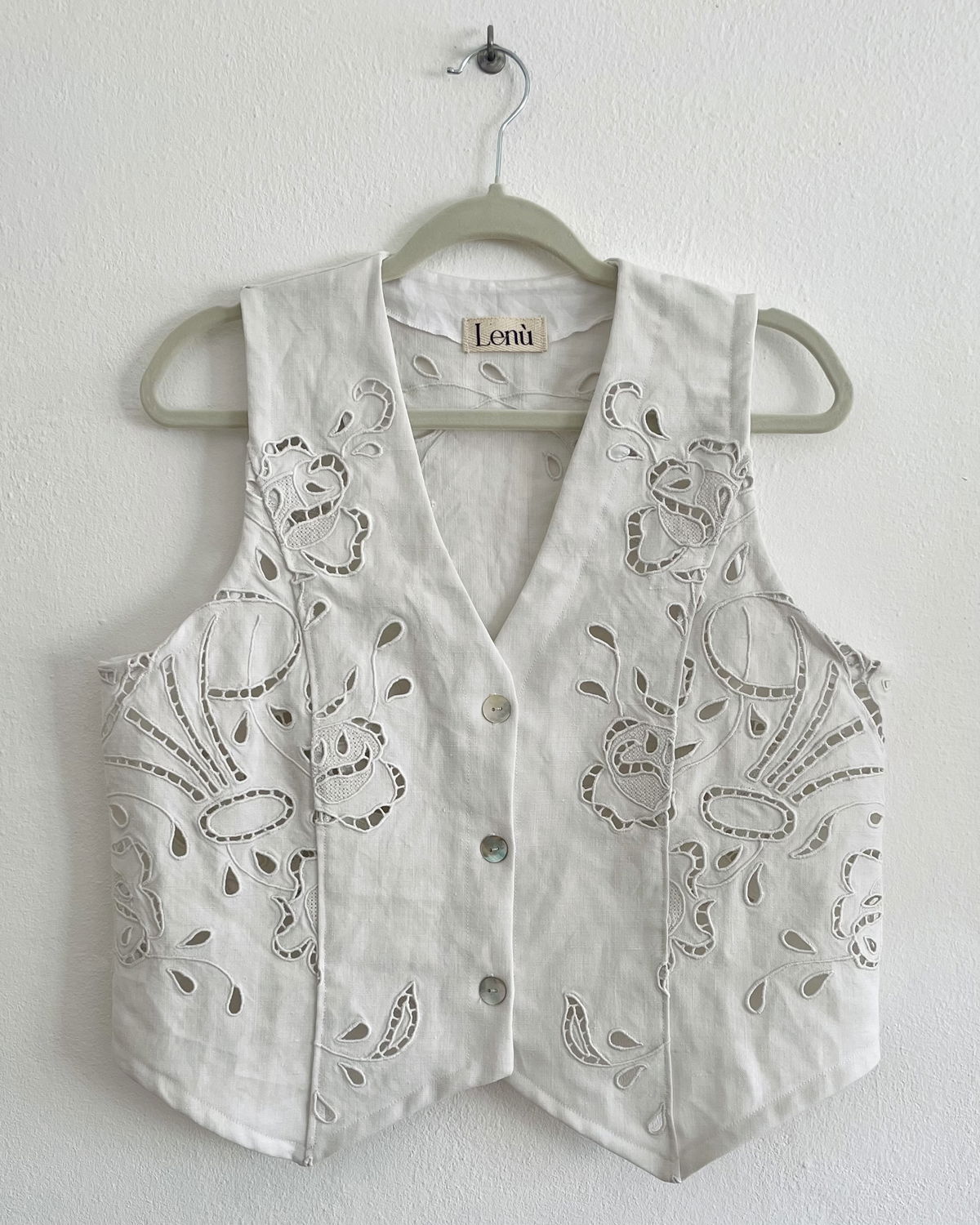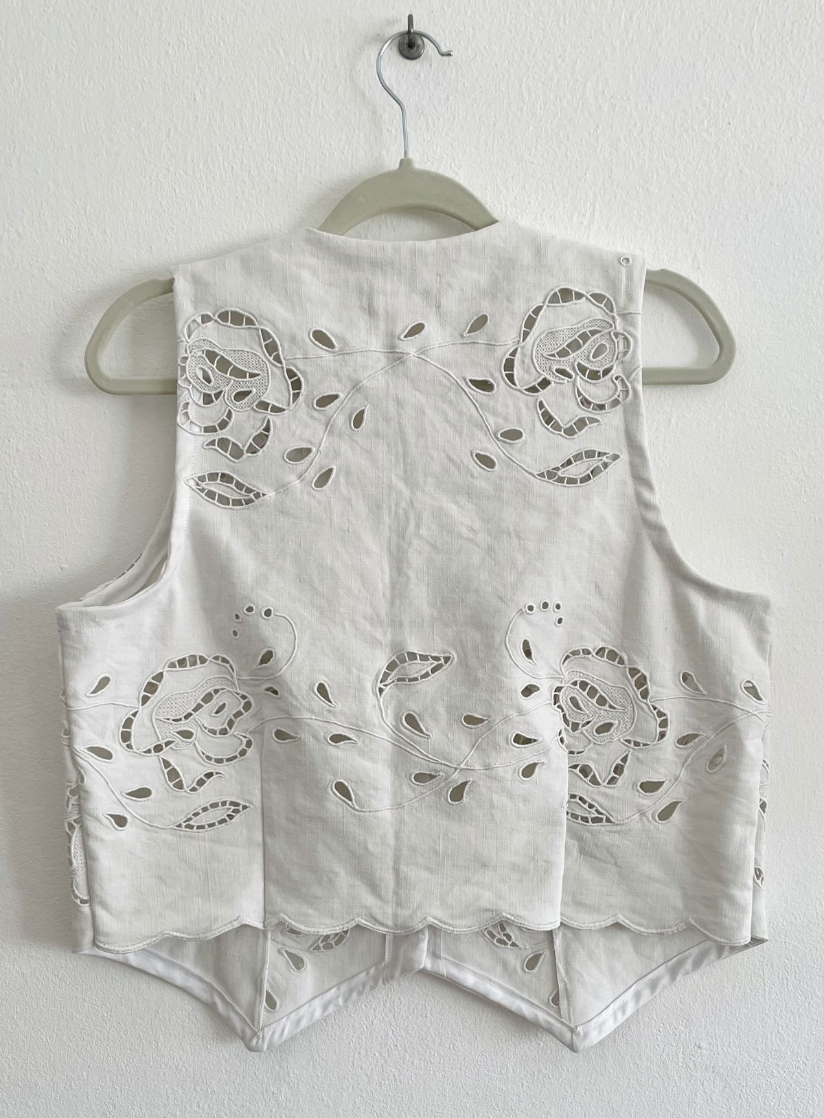 Chaleco sastrero confeccionado en granité (tela de algodón con cuerpo estilo gabardina o Jean) con bordado richelieu y calados