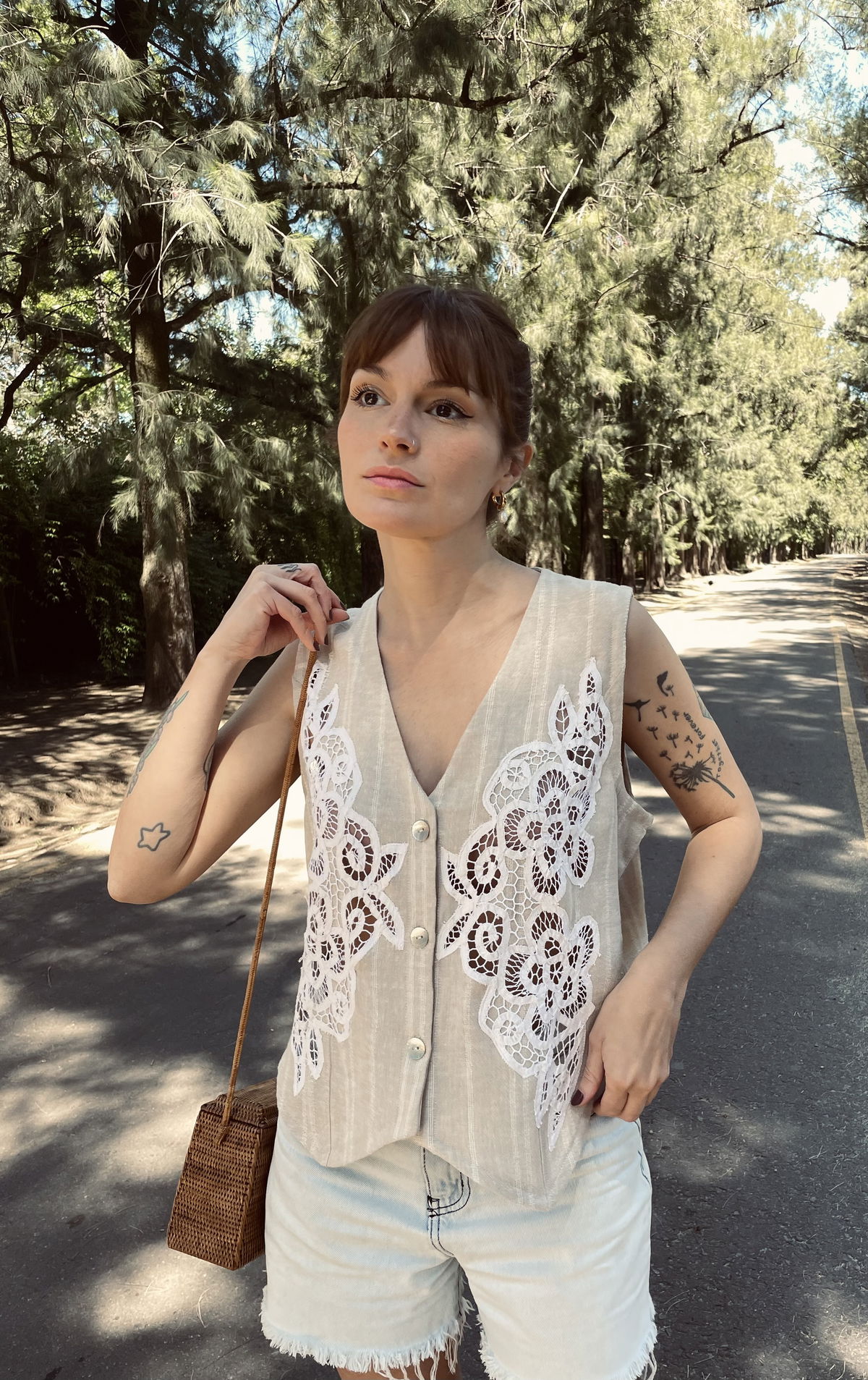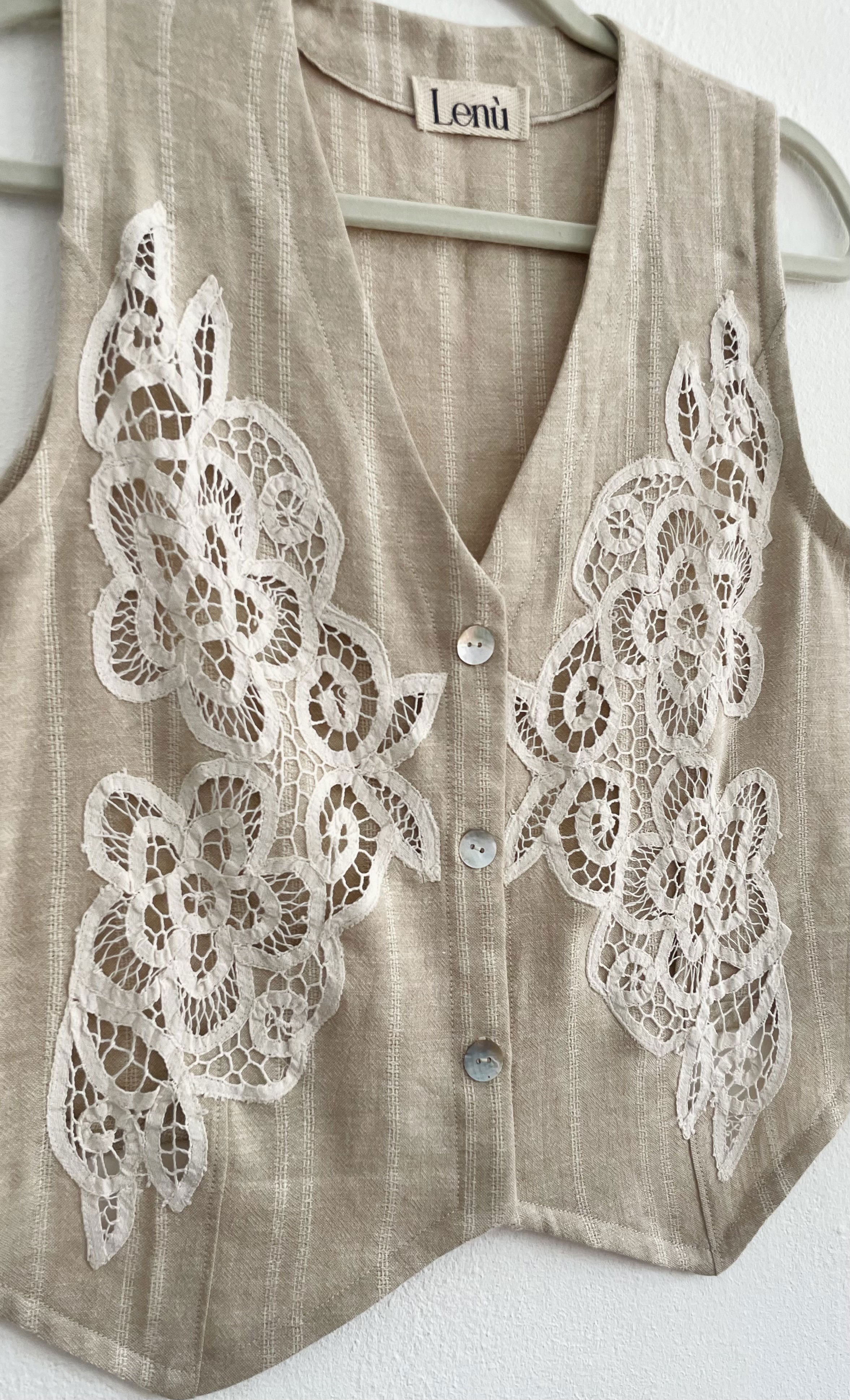 Chaleco de lino rayado con apliques de encaje inglés (hecho con cintas de algodón)