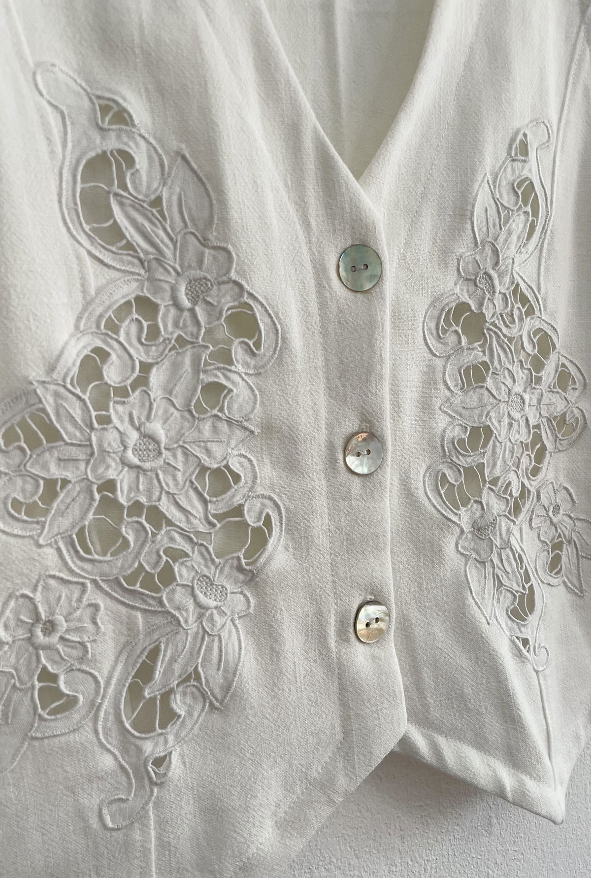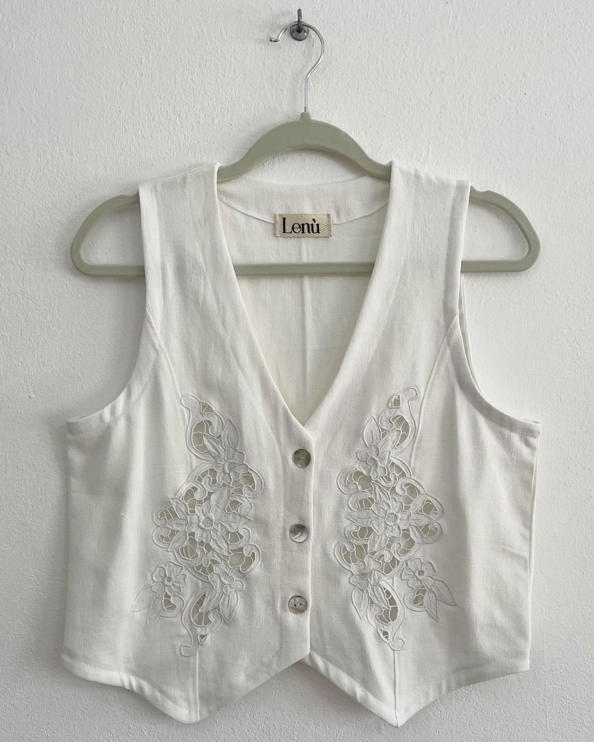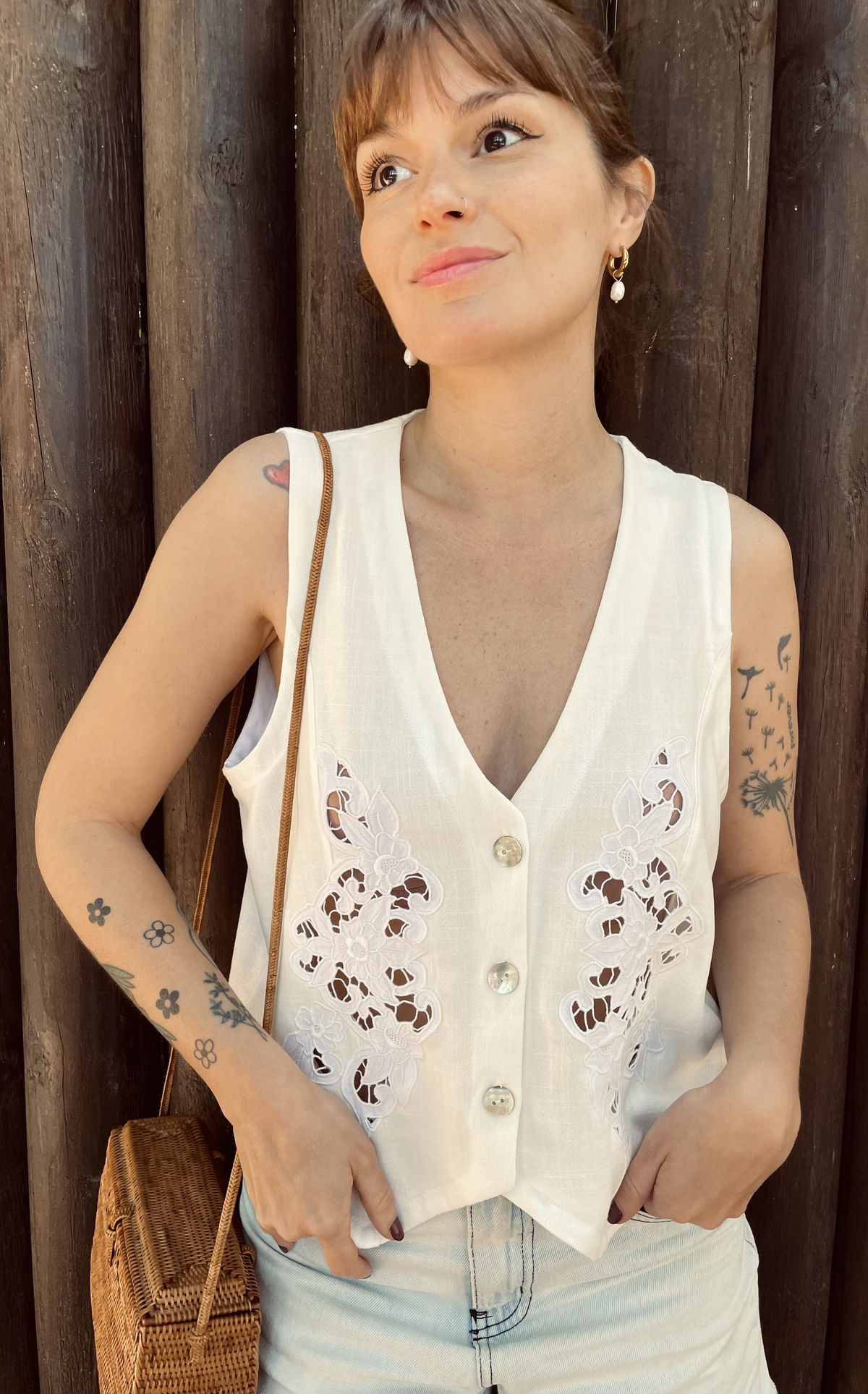 Chaleco de lino con apliques de bordado richelieu y calados.