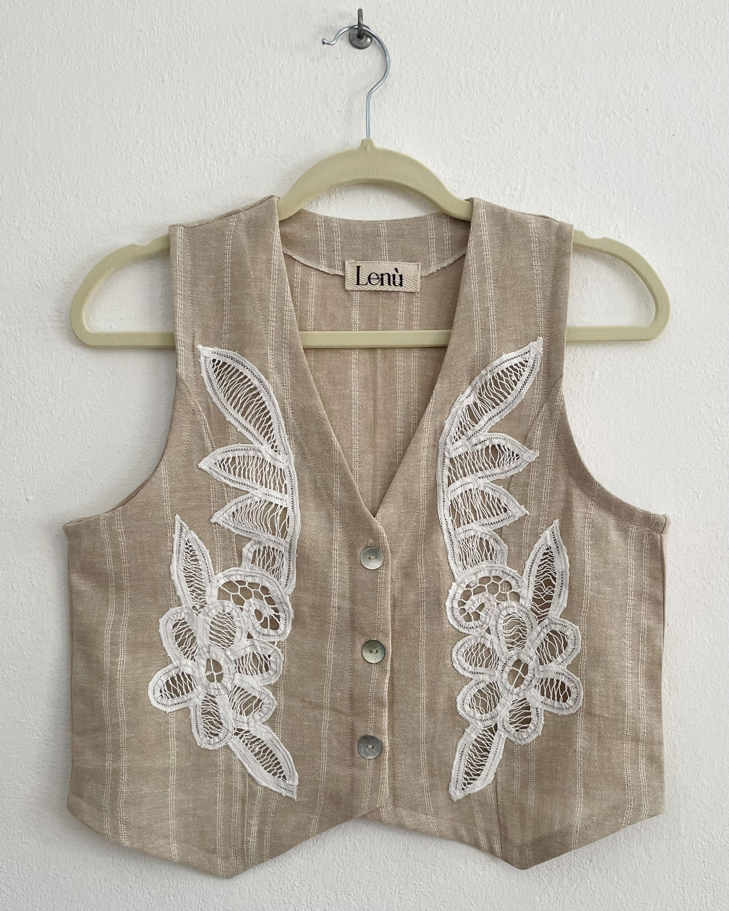 Chaleco de lino rayado con apliques de encaje inglés (hecho con cintas de algodón)