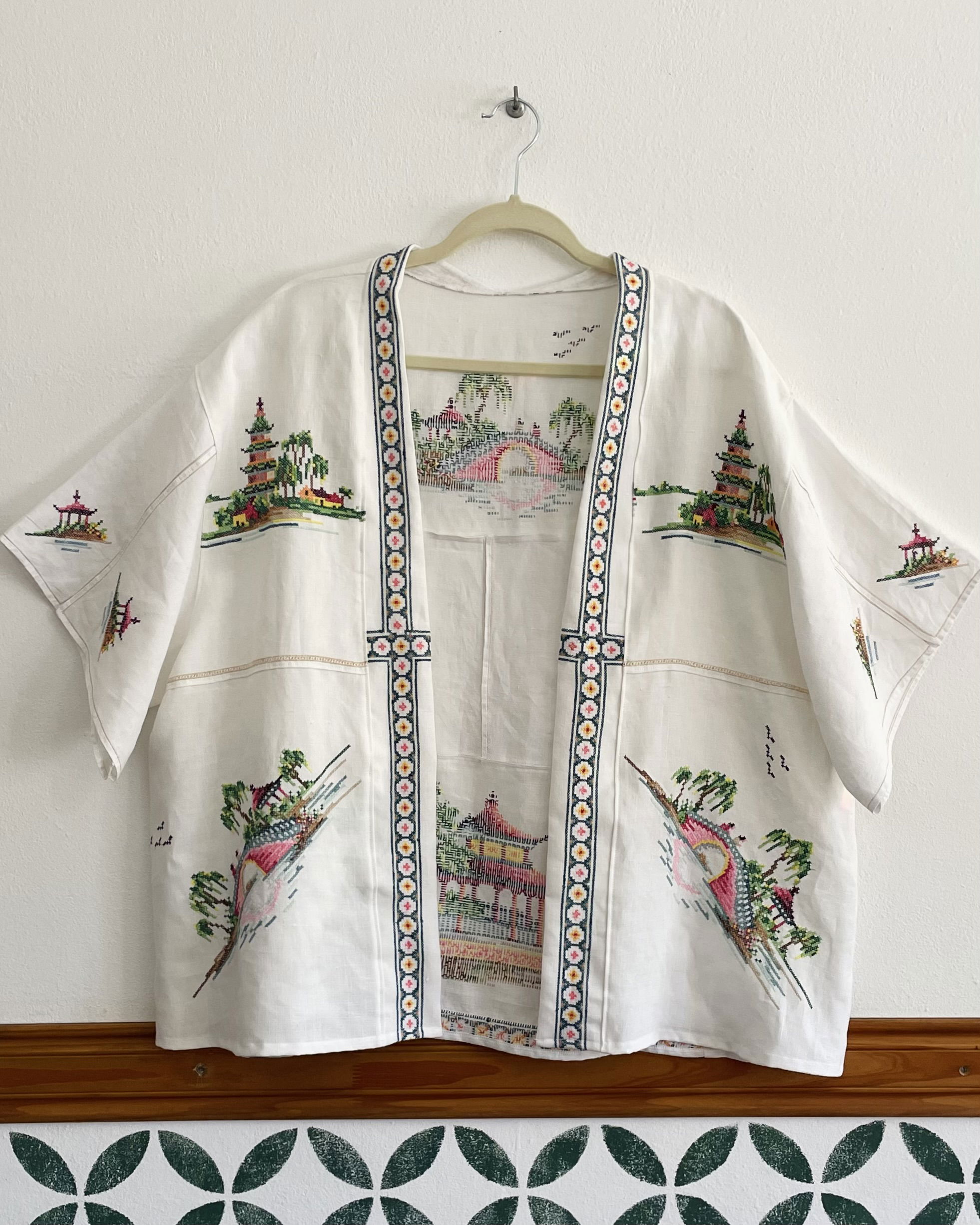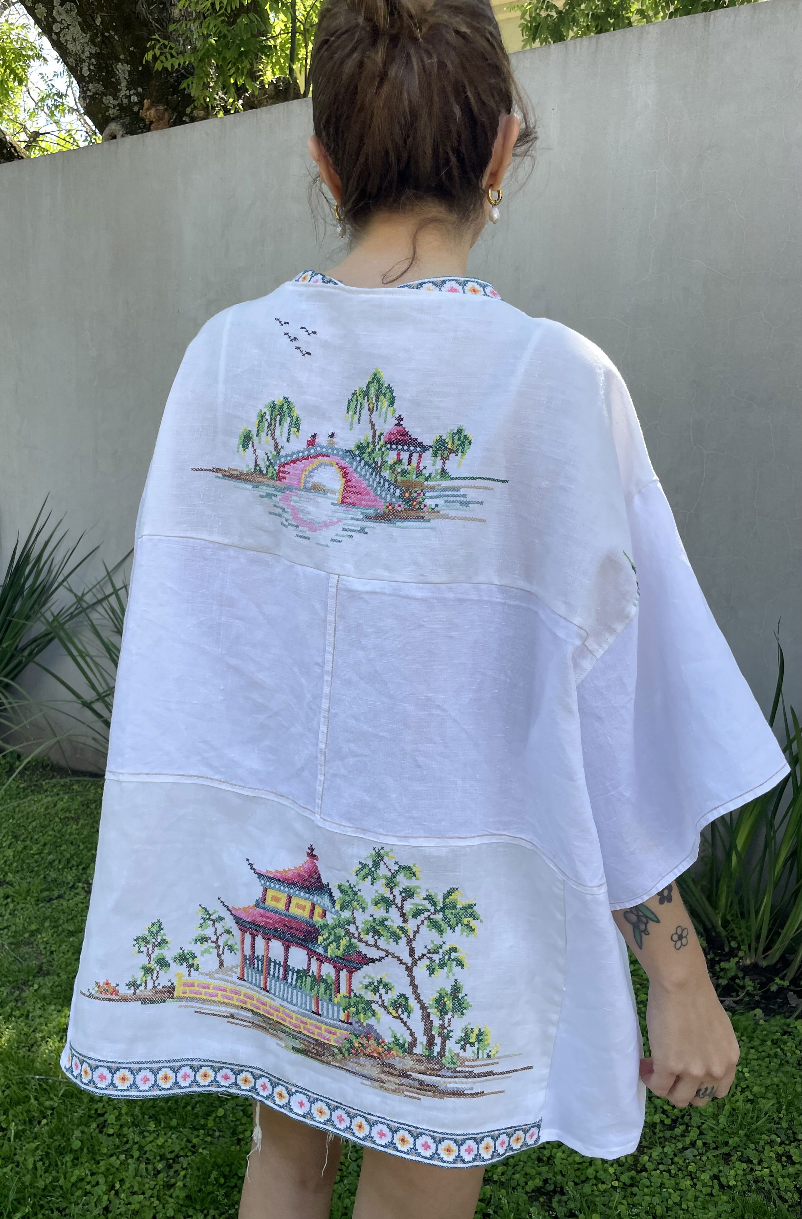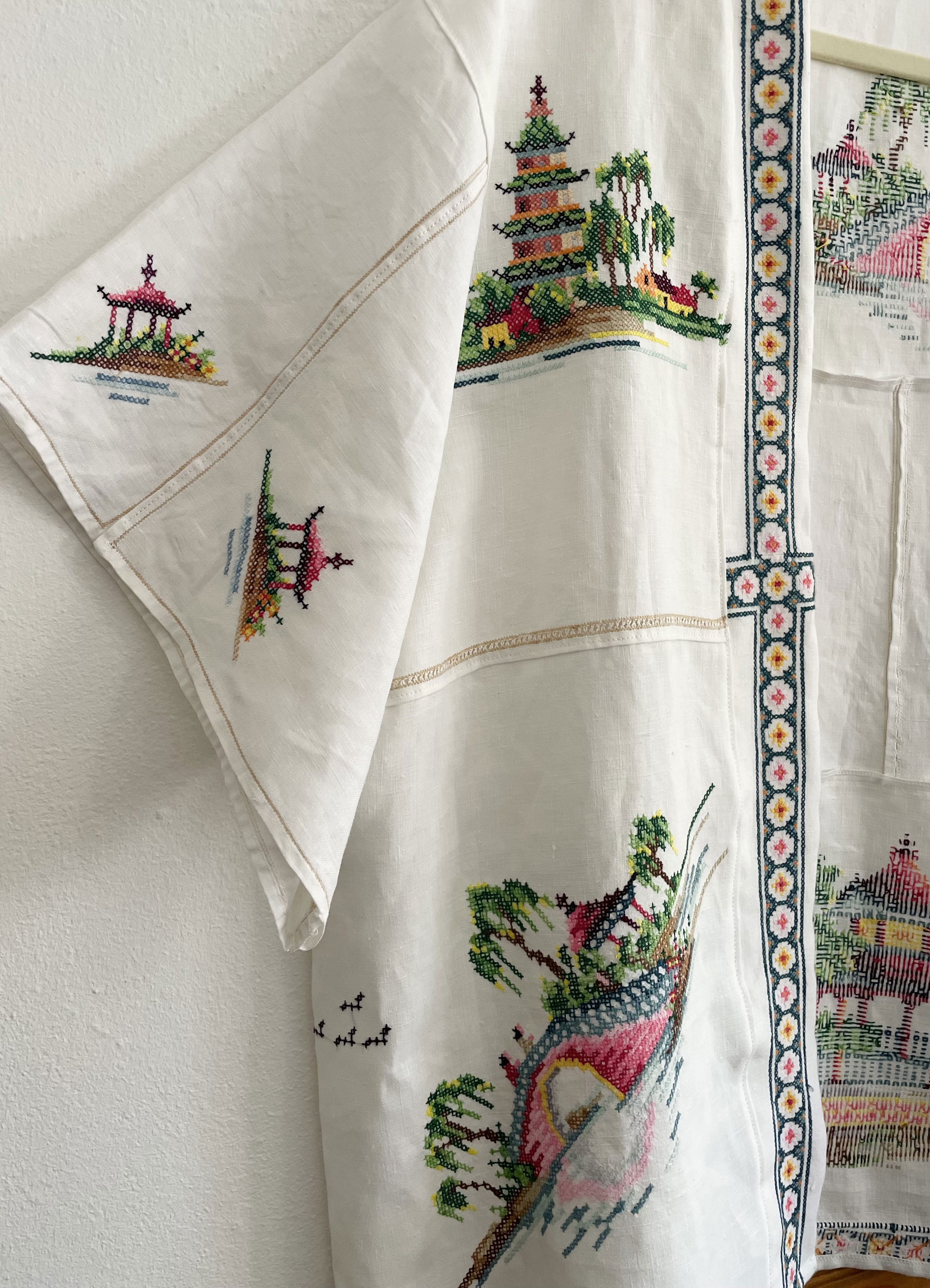 Kimono amplio hecho a partir de mantel de hilo con bordados orientales en punto cruz Talle unico (equivale a un L)