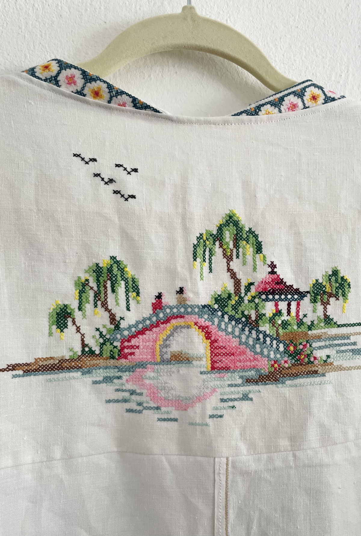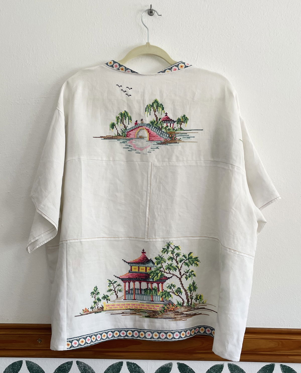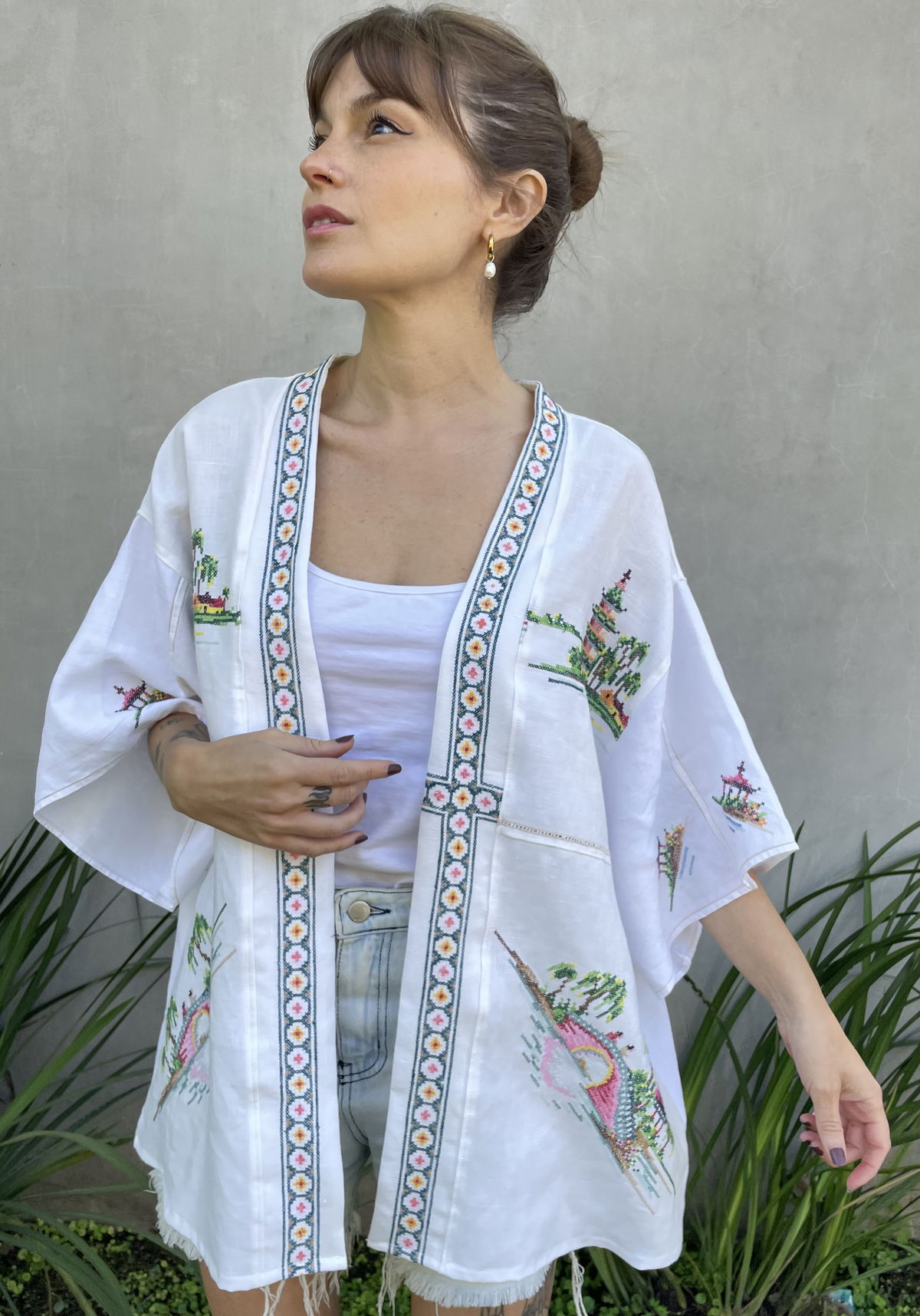 Kimono amplio hecho a partir de mantel de hilo con bordados orientales en punto cruz Talle unico (equivale a un L)