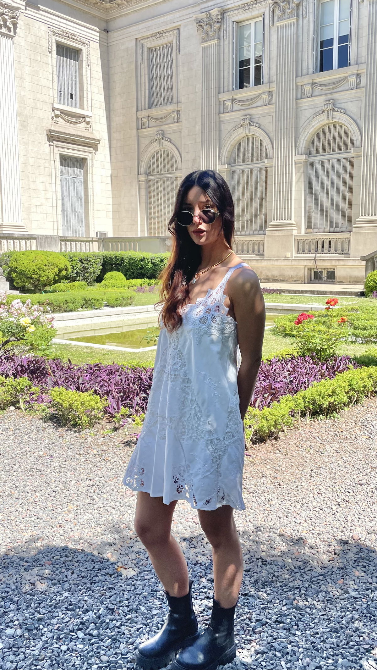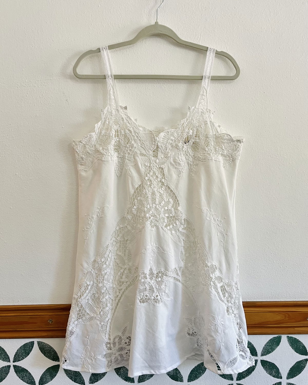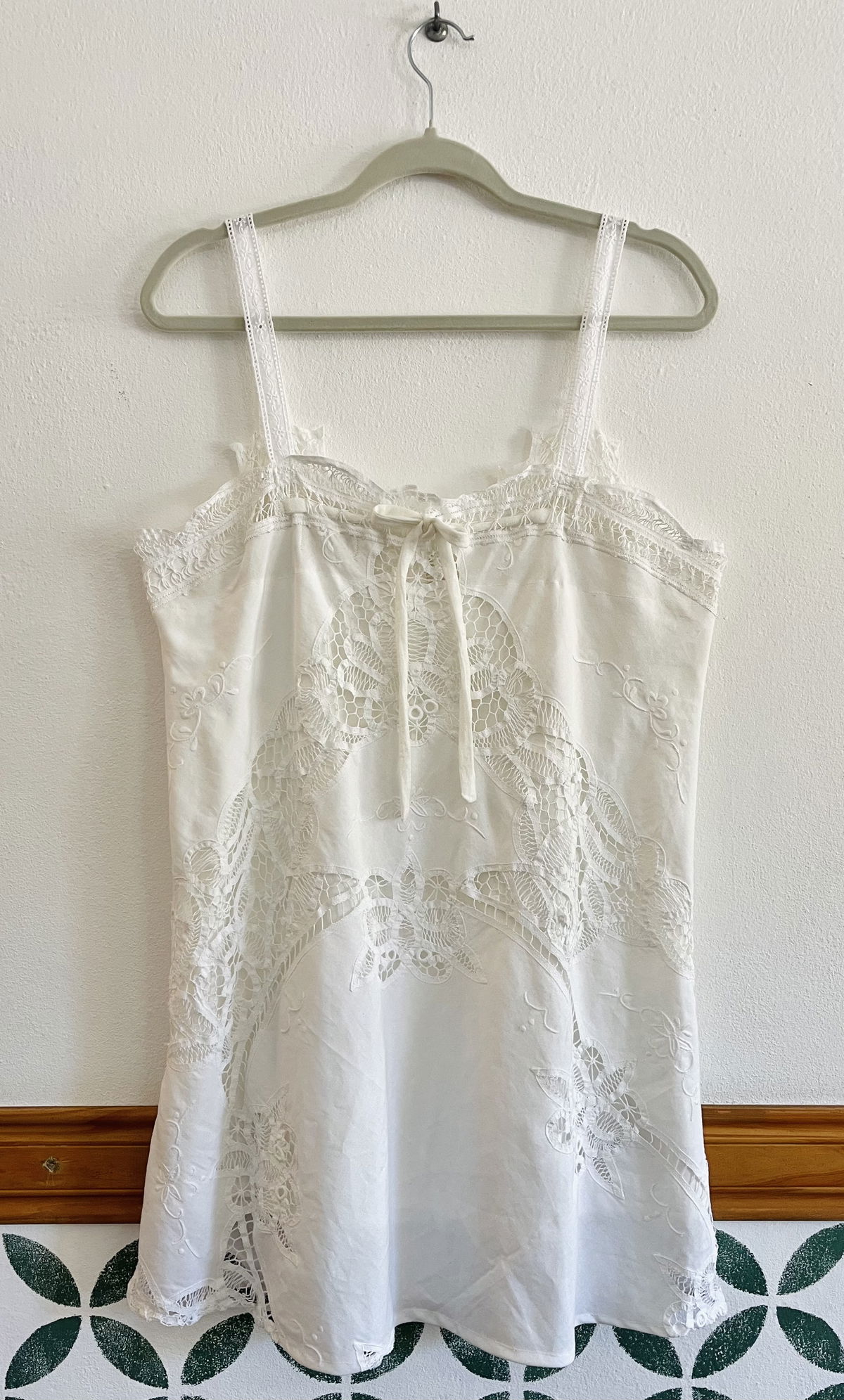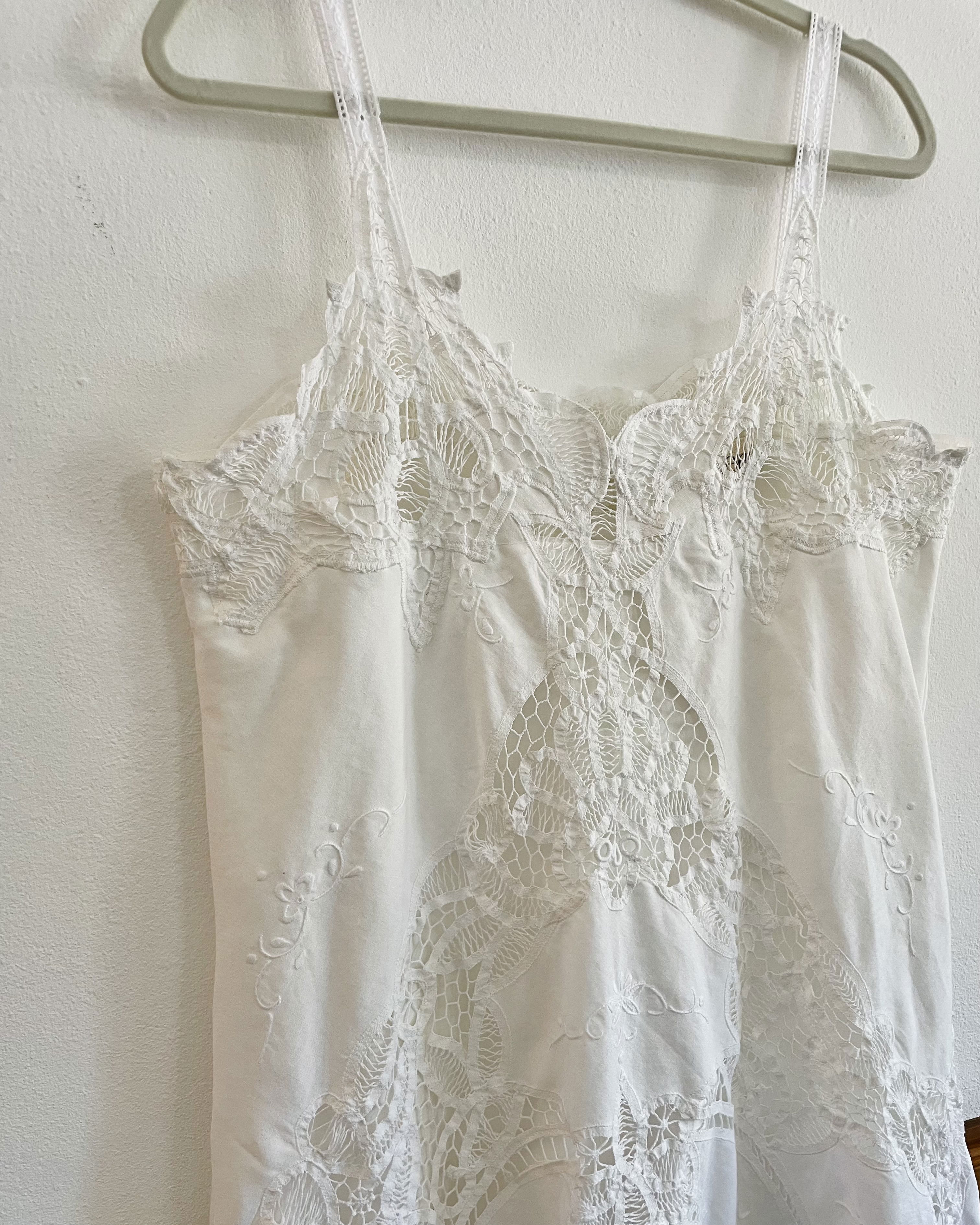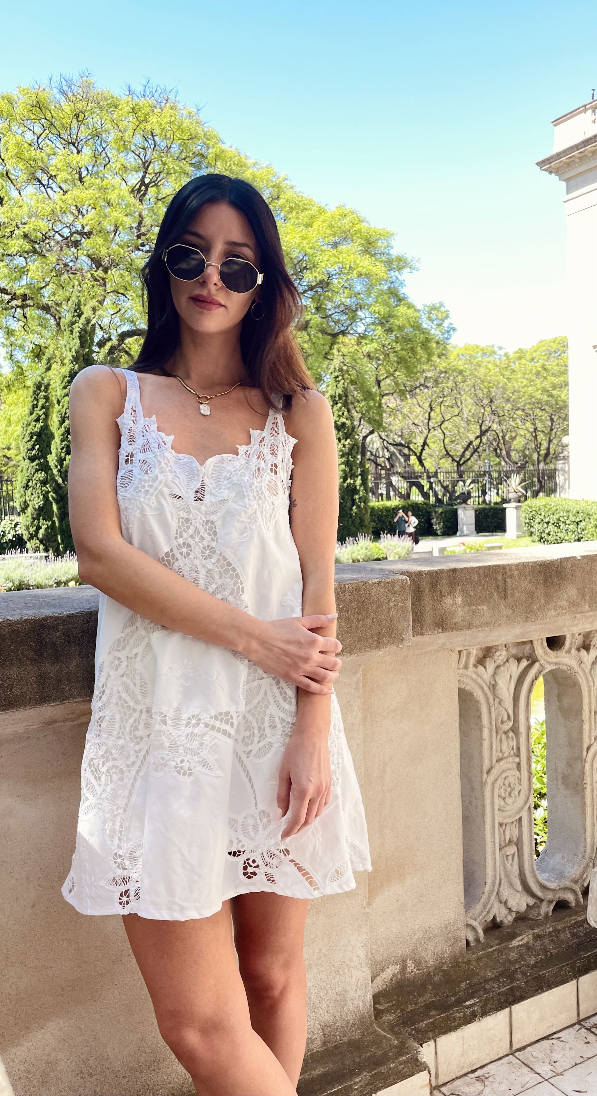 Vestido de algodón y encaje inglés. Con forro a tono y tiras para regular el ancho en la espalda.