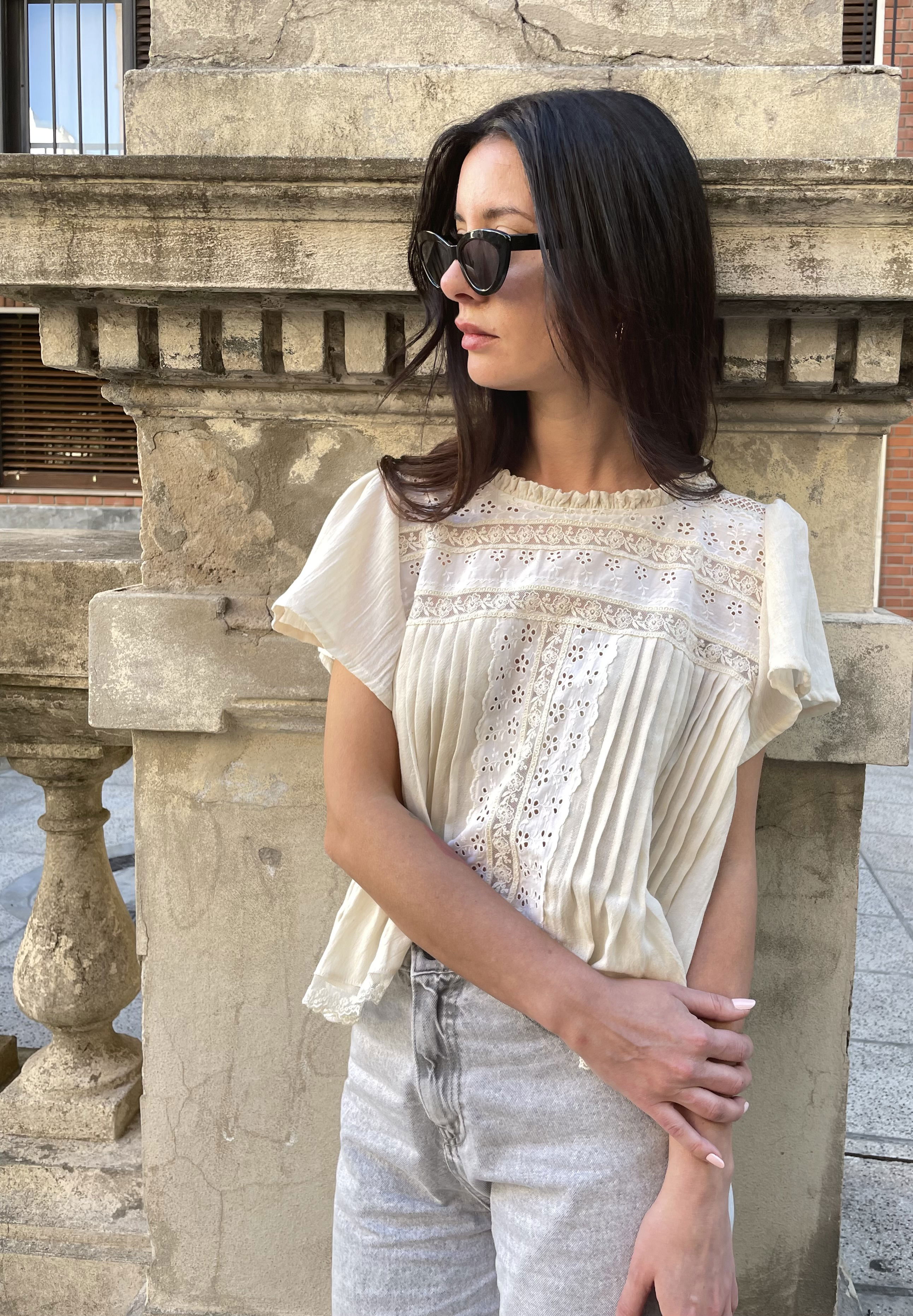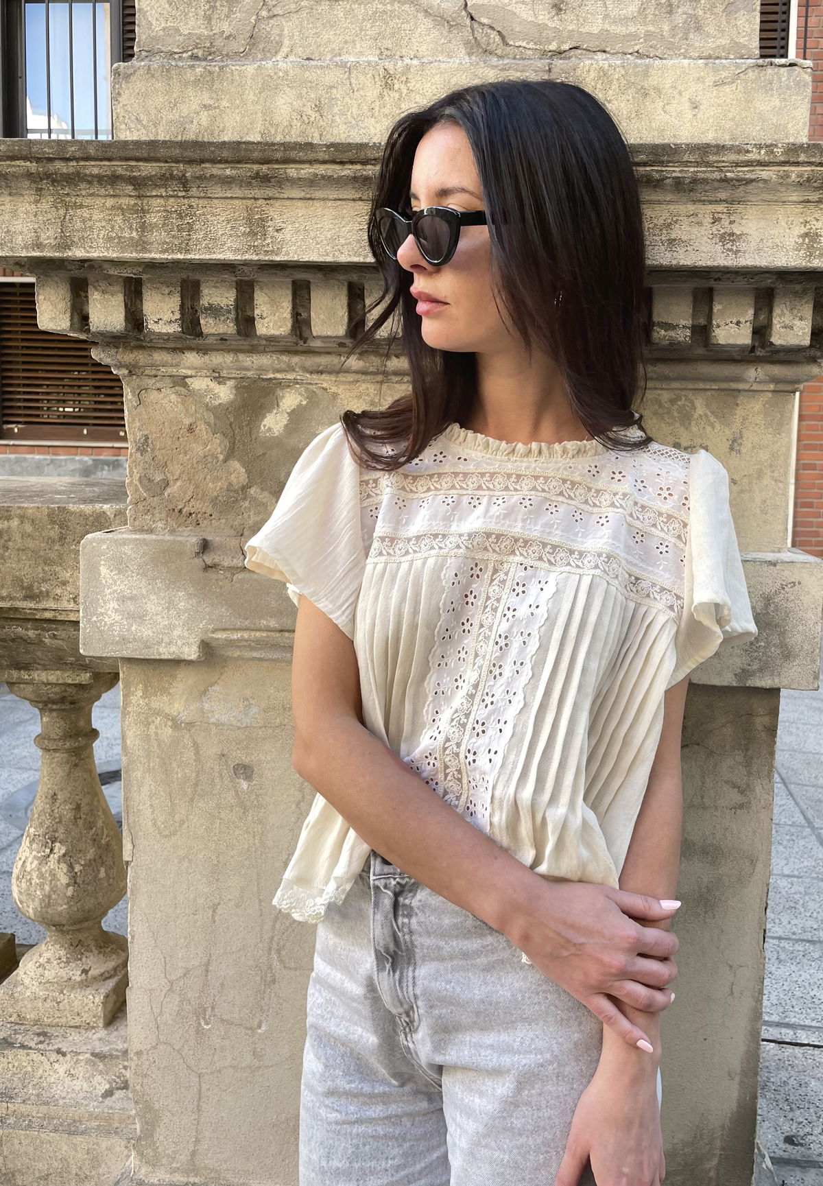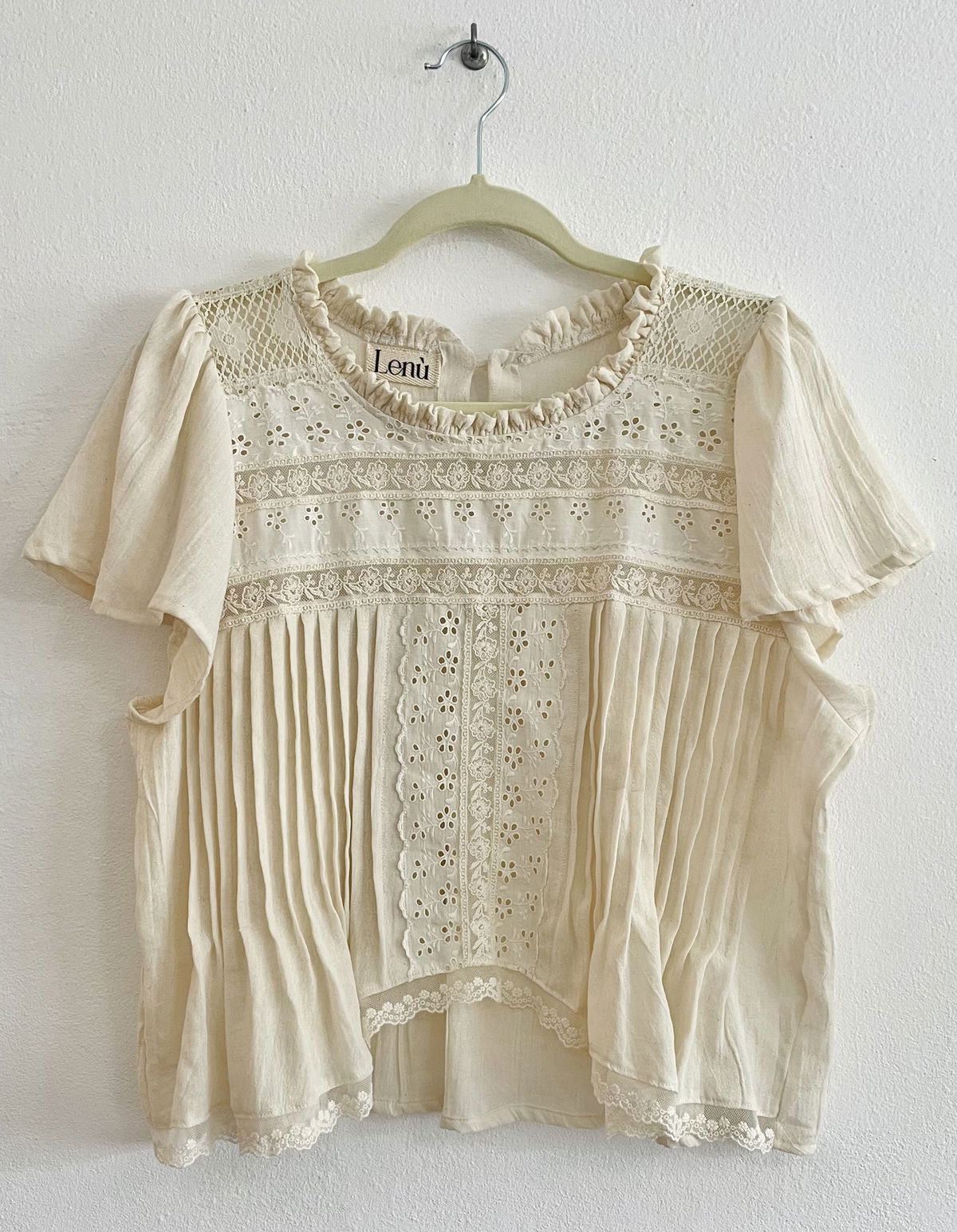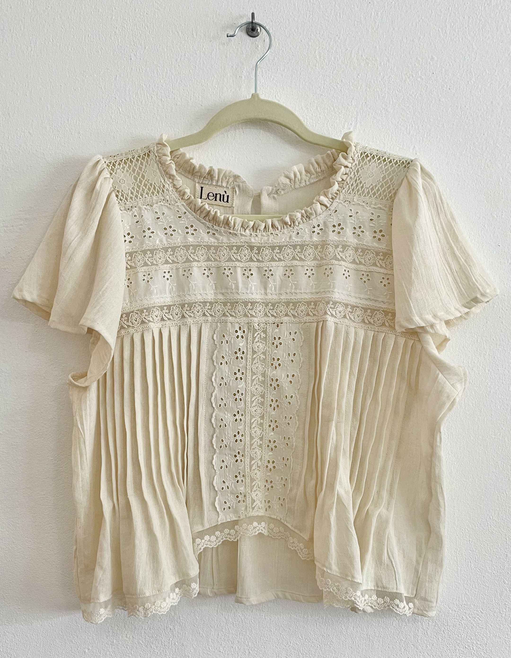 Blusa de algodón con detalles de puntillas antiguas y alforzas.