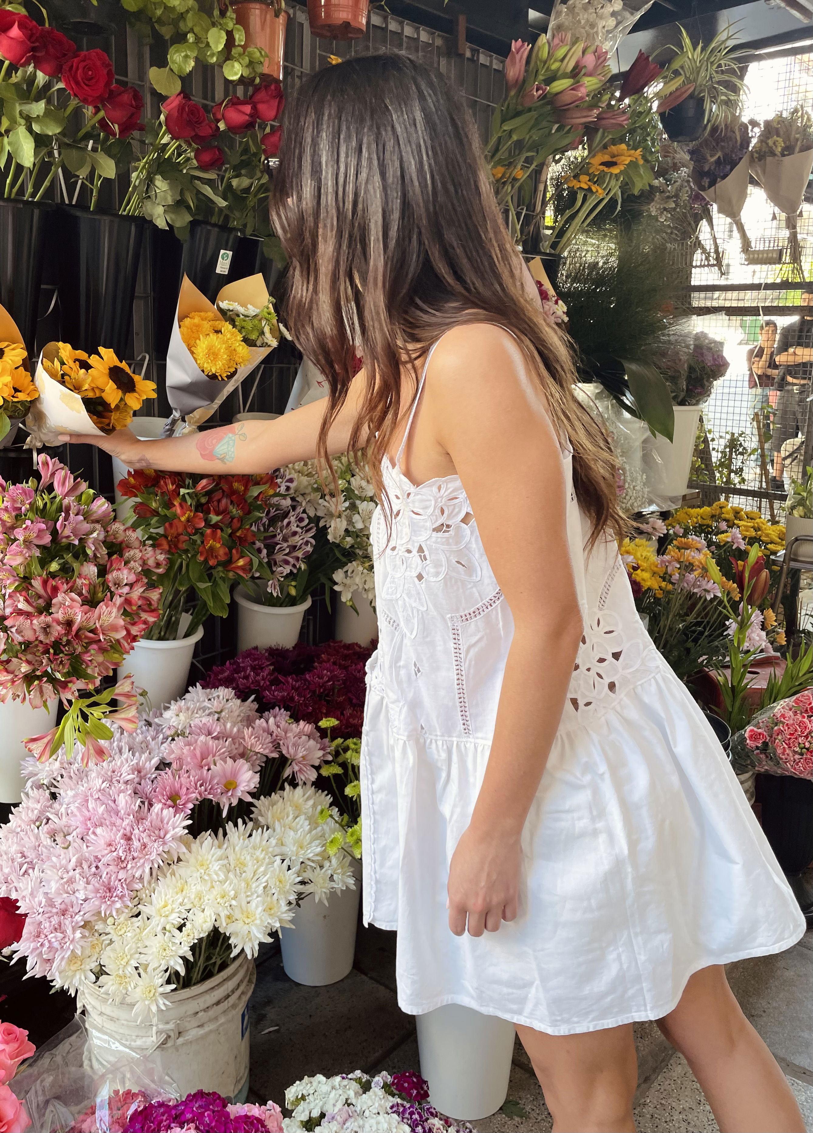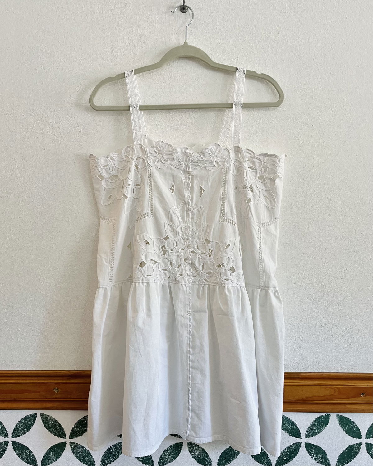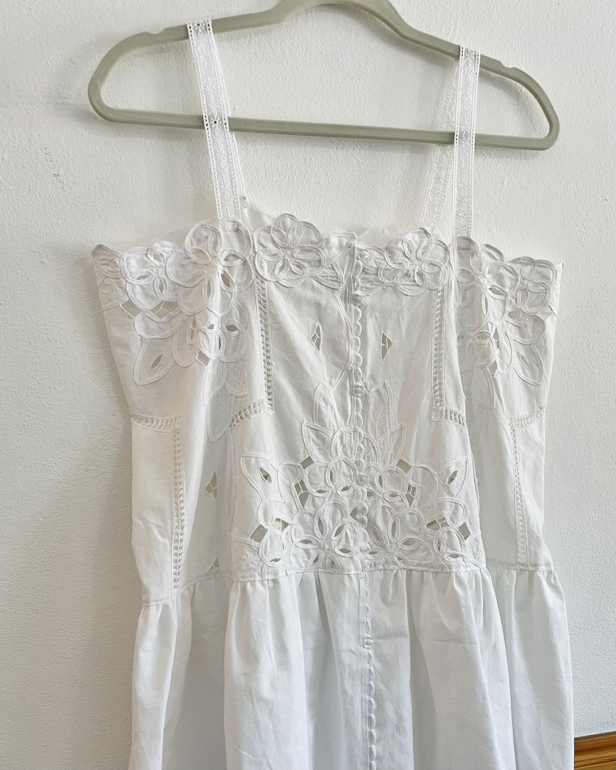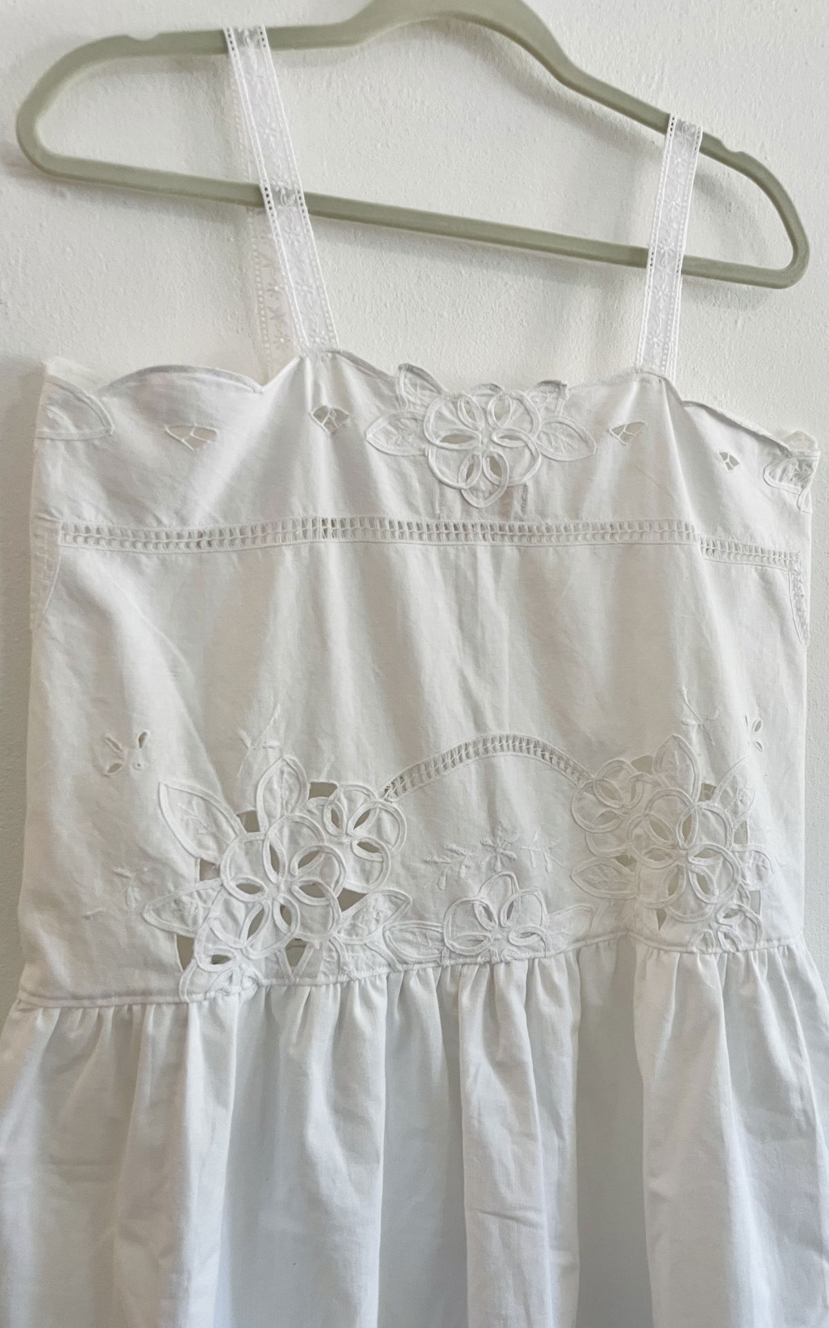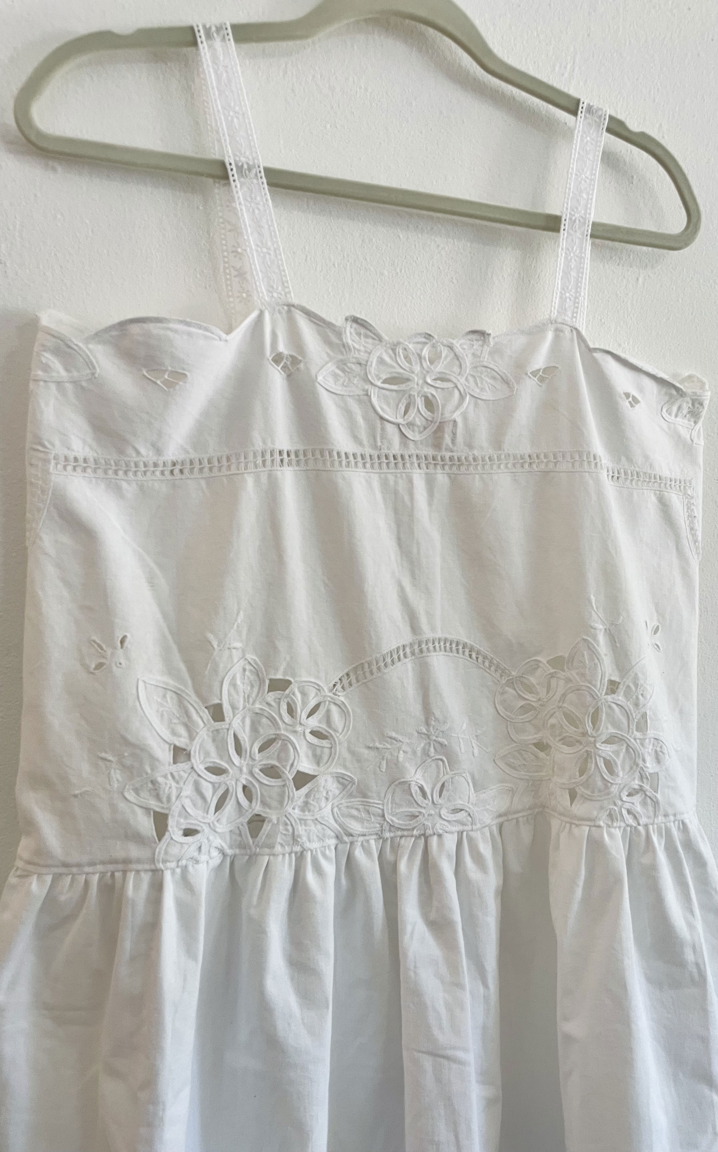 Vestido de algodón bordado y calado, con vainillas. Con breteles de broderie