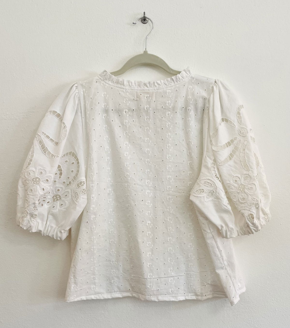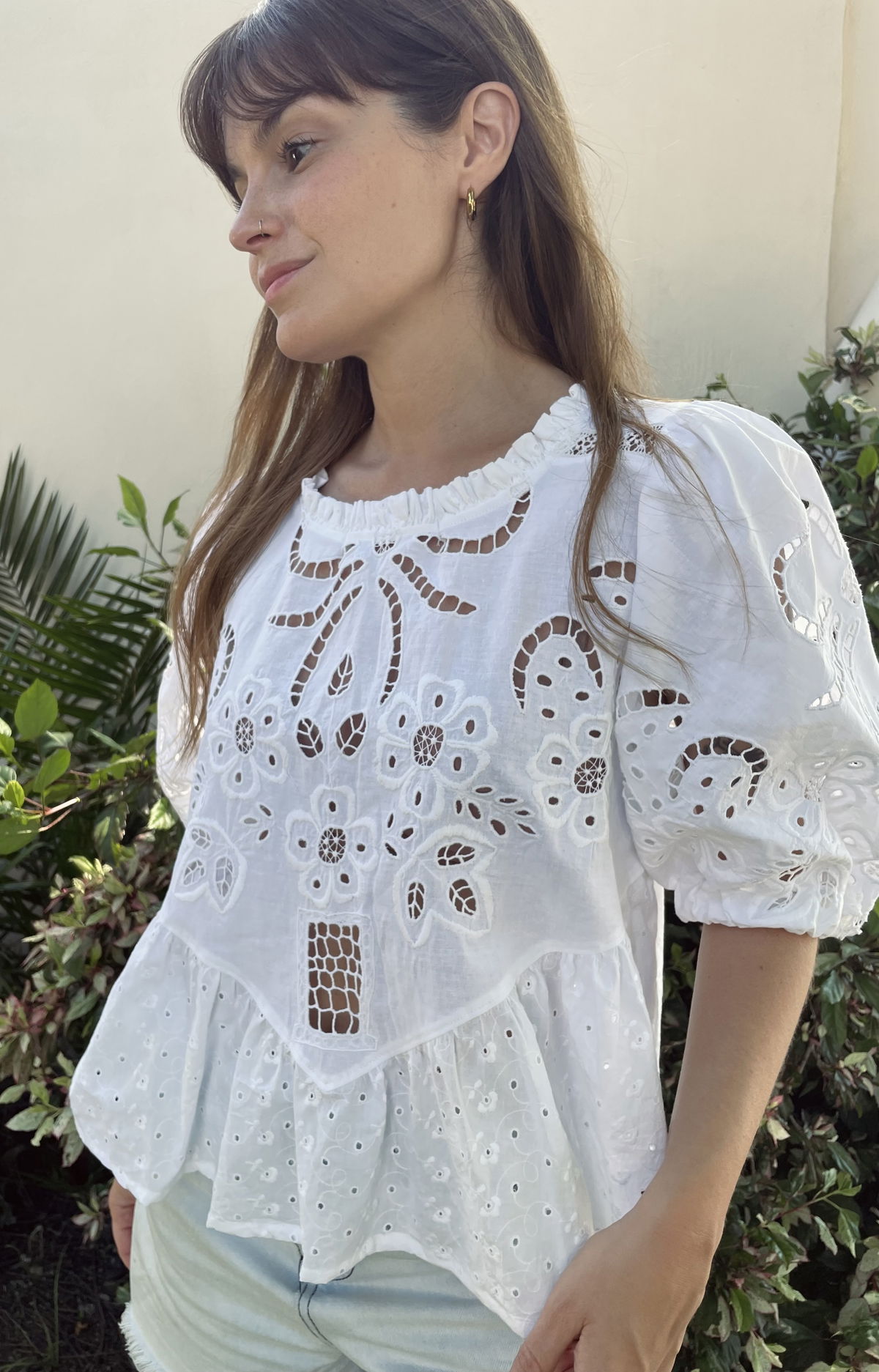 Blusa de algodón bordado y calado, combinada con broderie