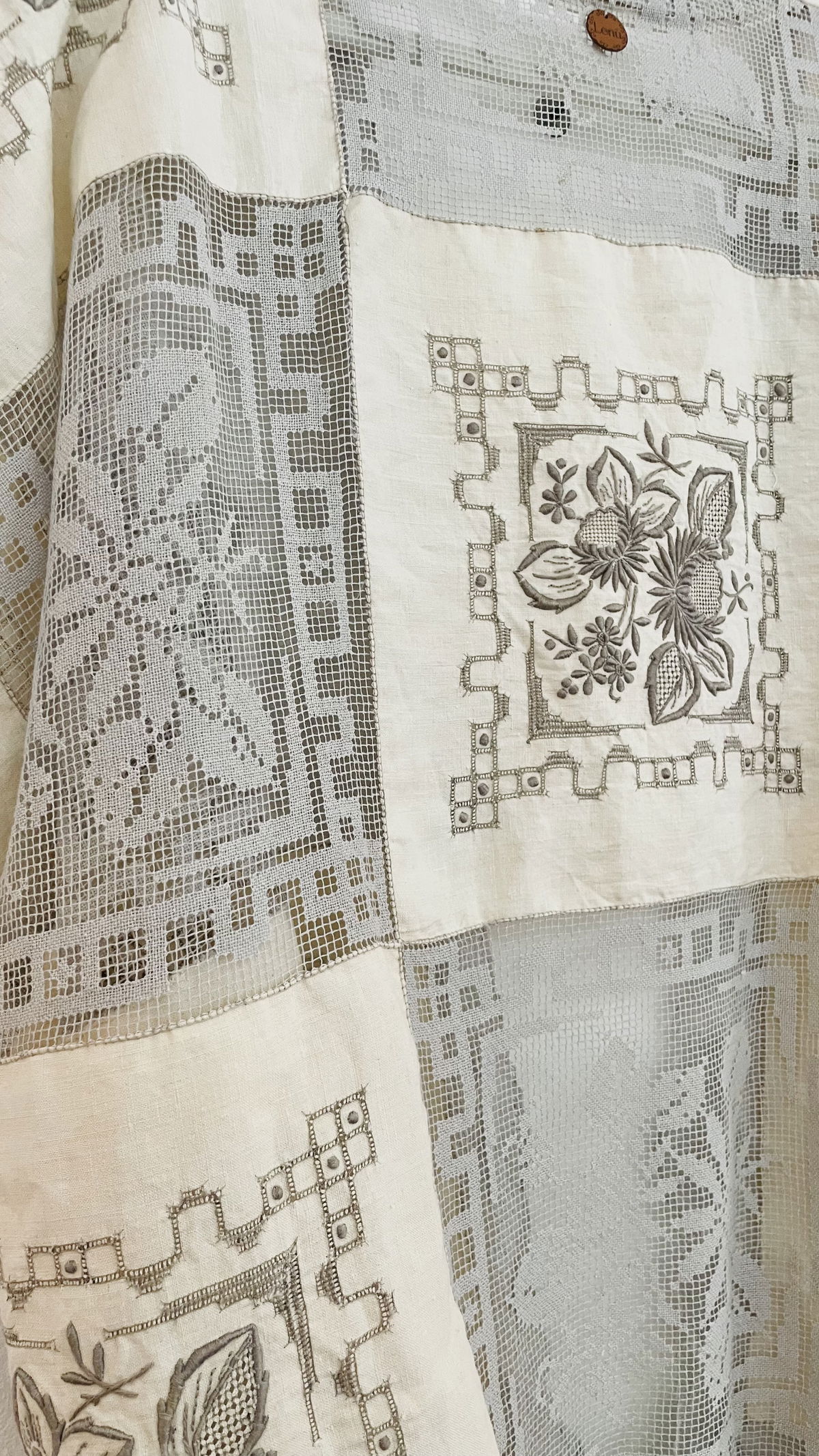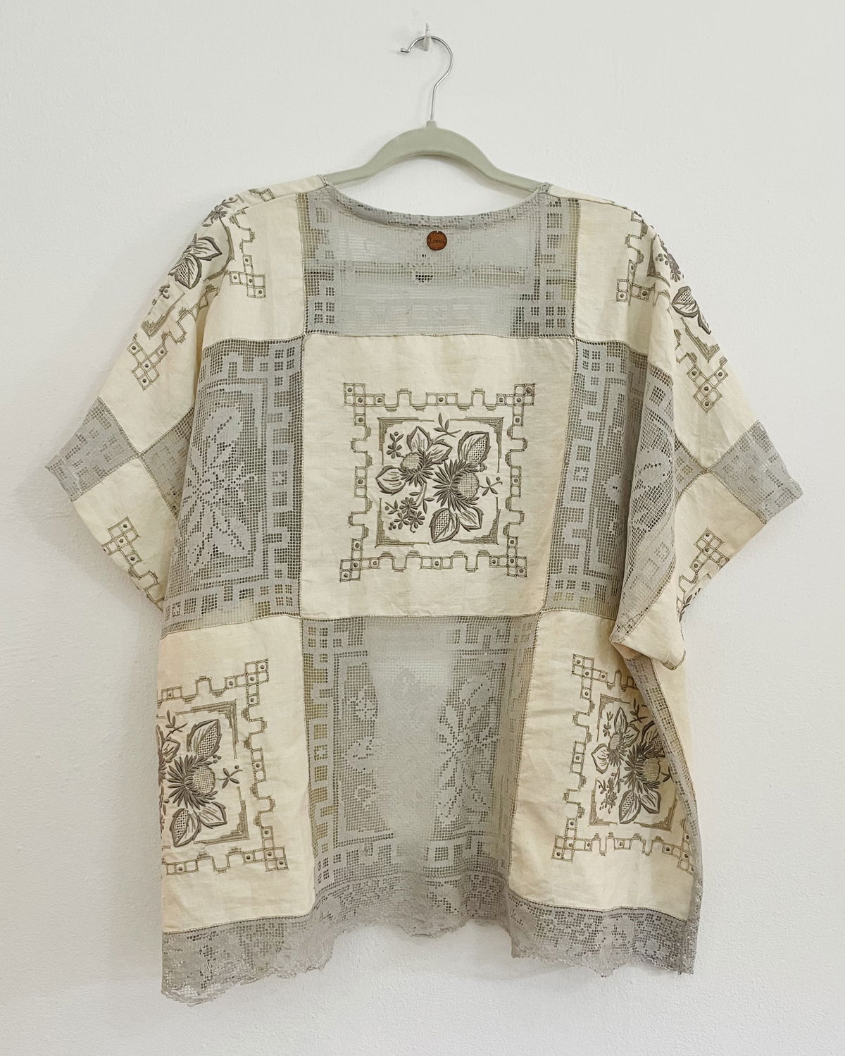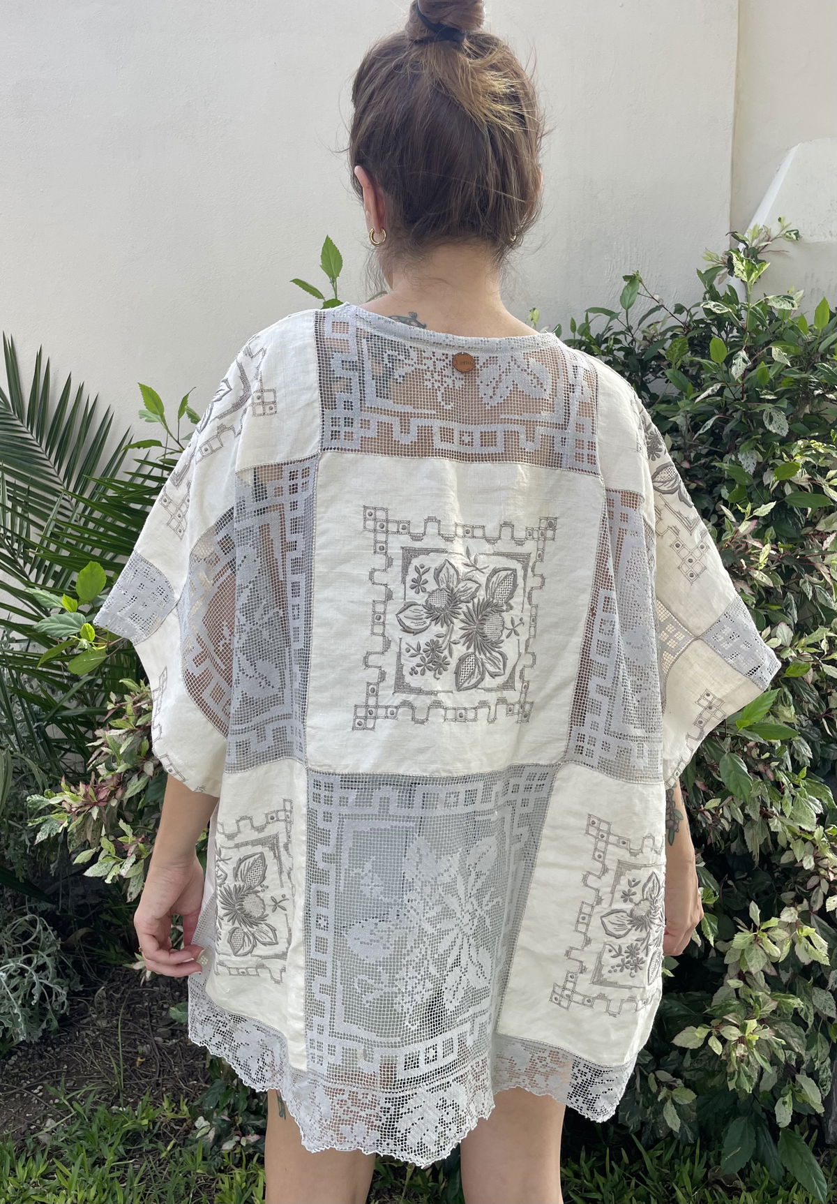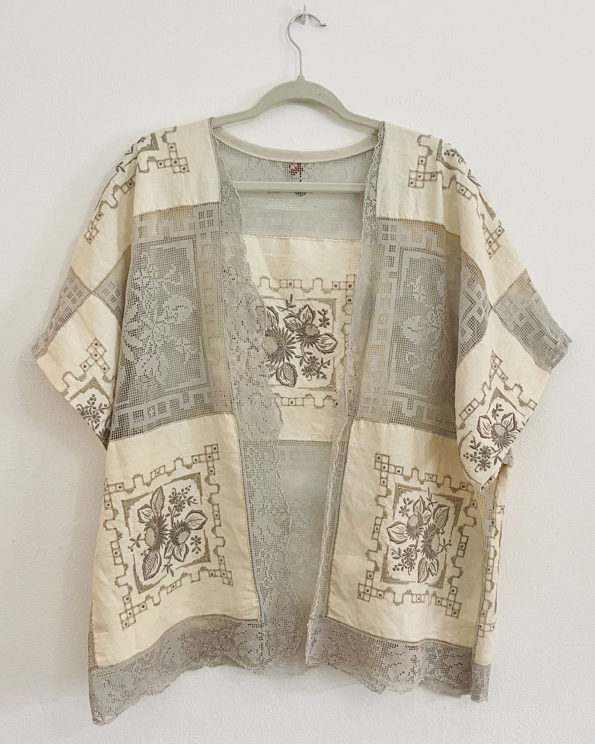 Kimono amplio hecho a partir de mantel de algodón bordado y filé frances