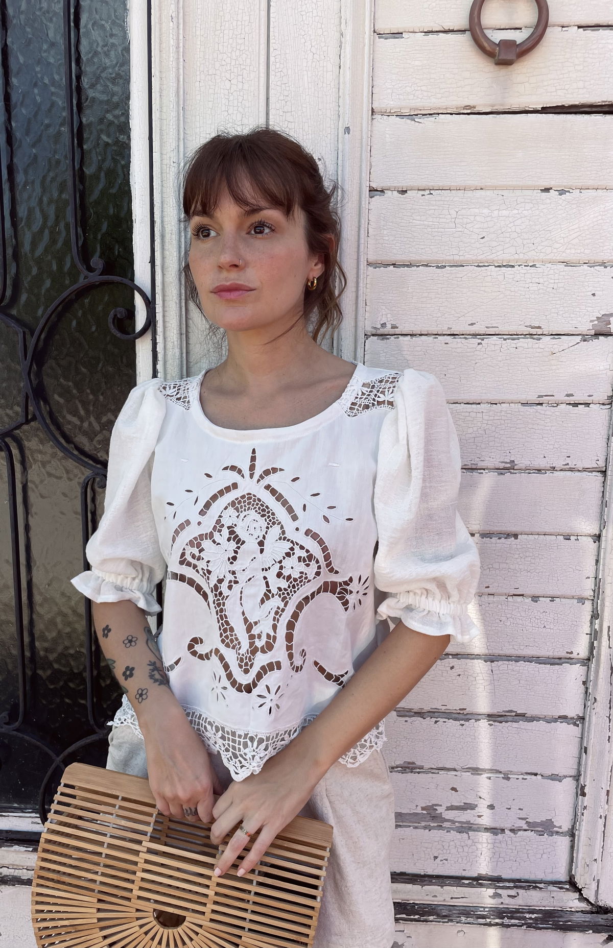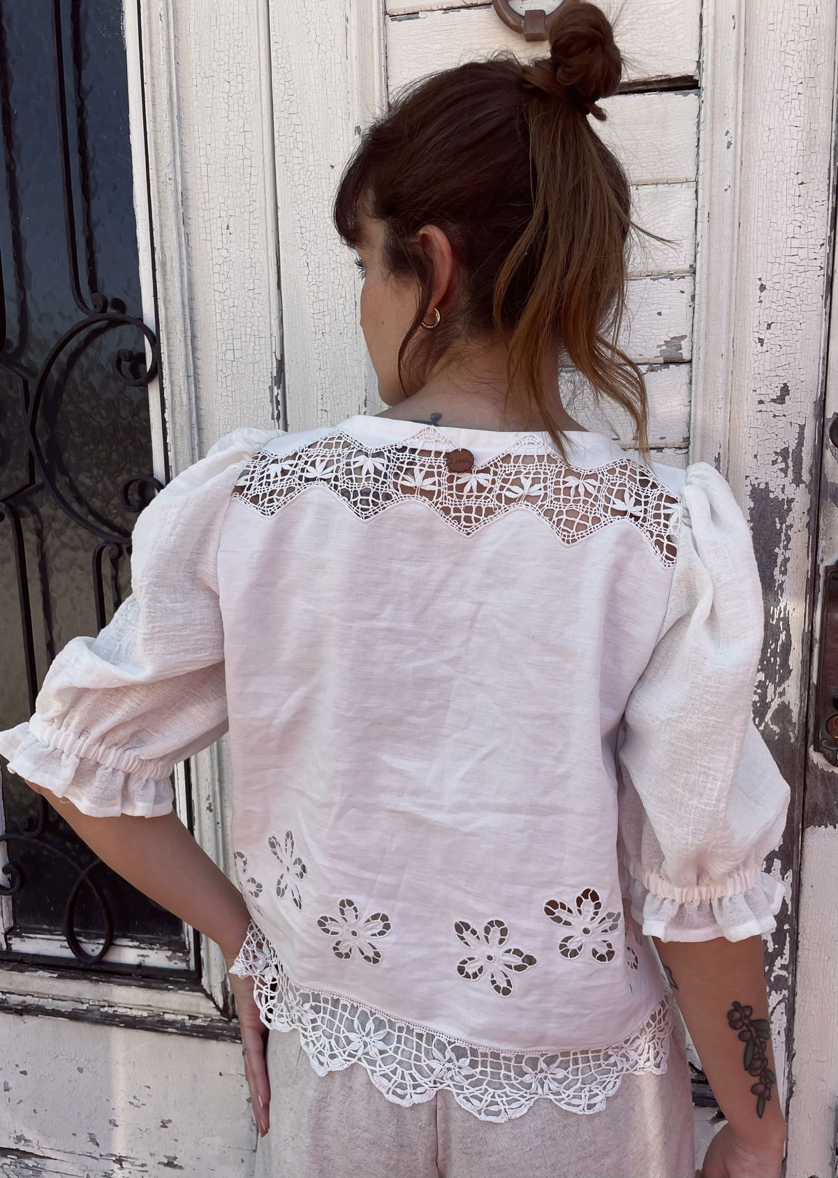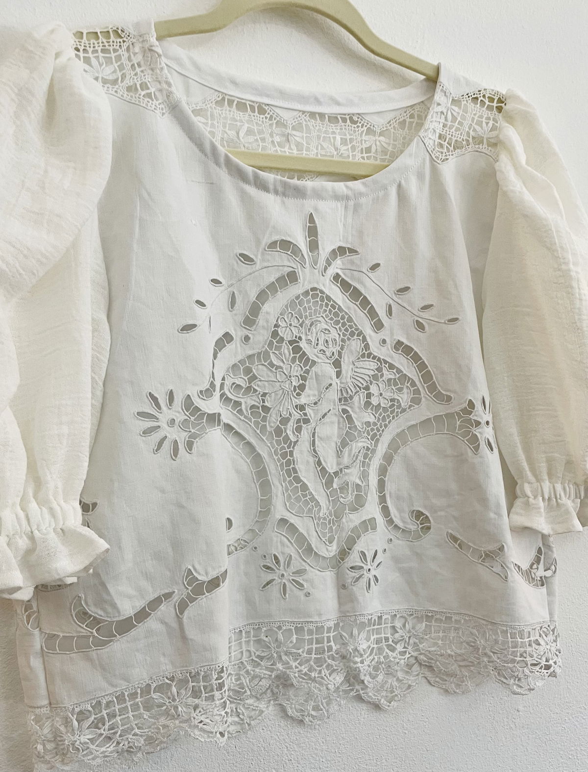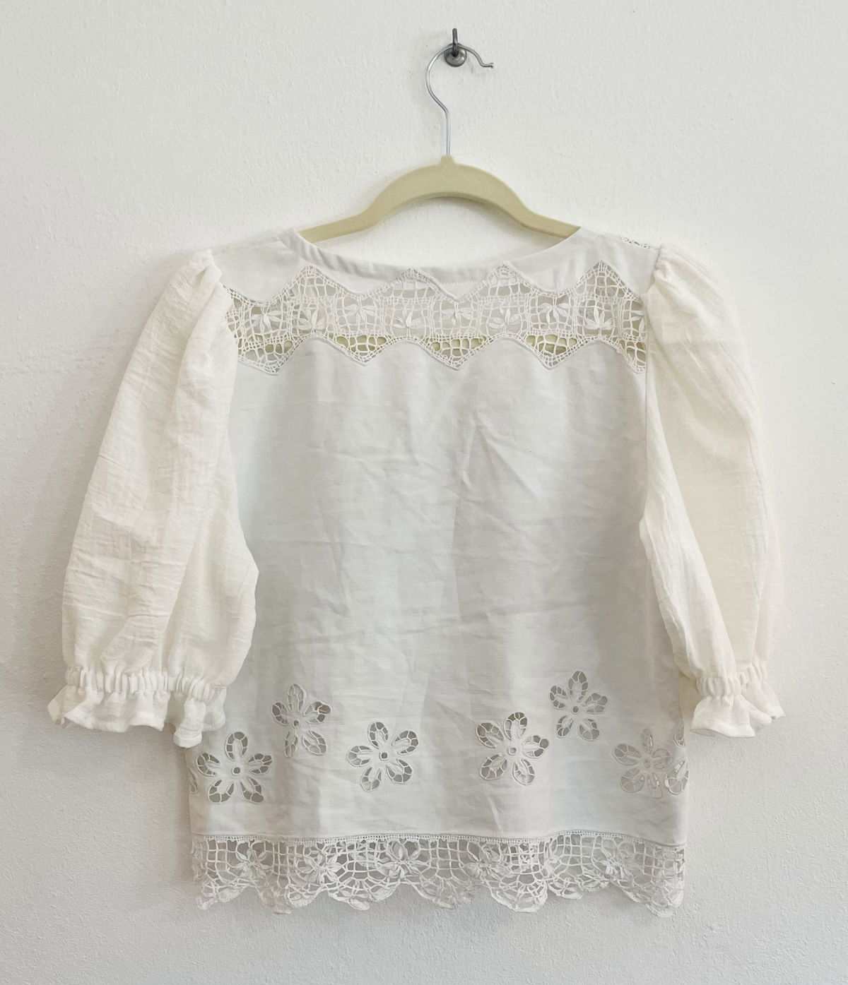 Blusa de algodón con bordado richelieu y detalles de encaje de bolillos