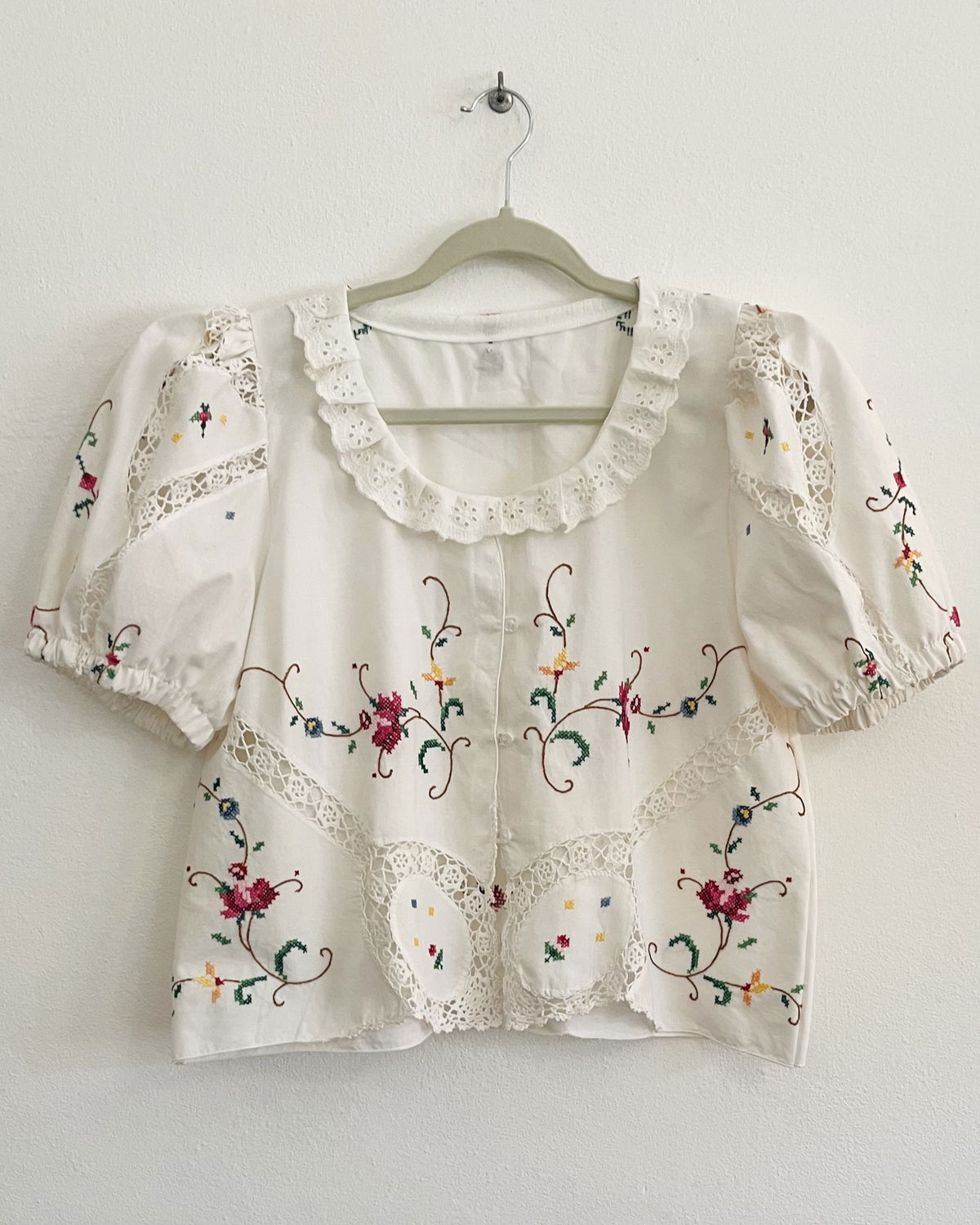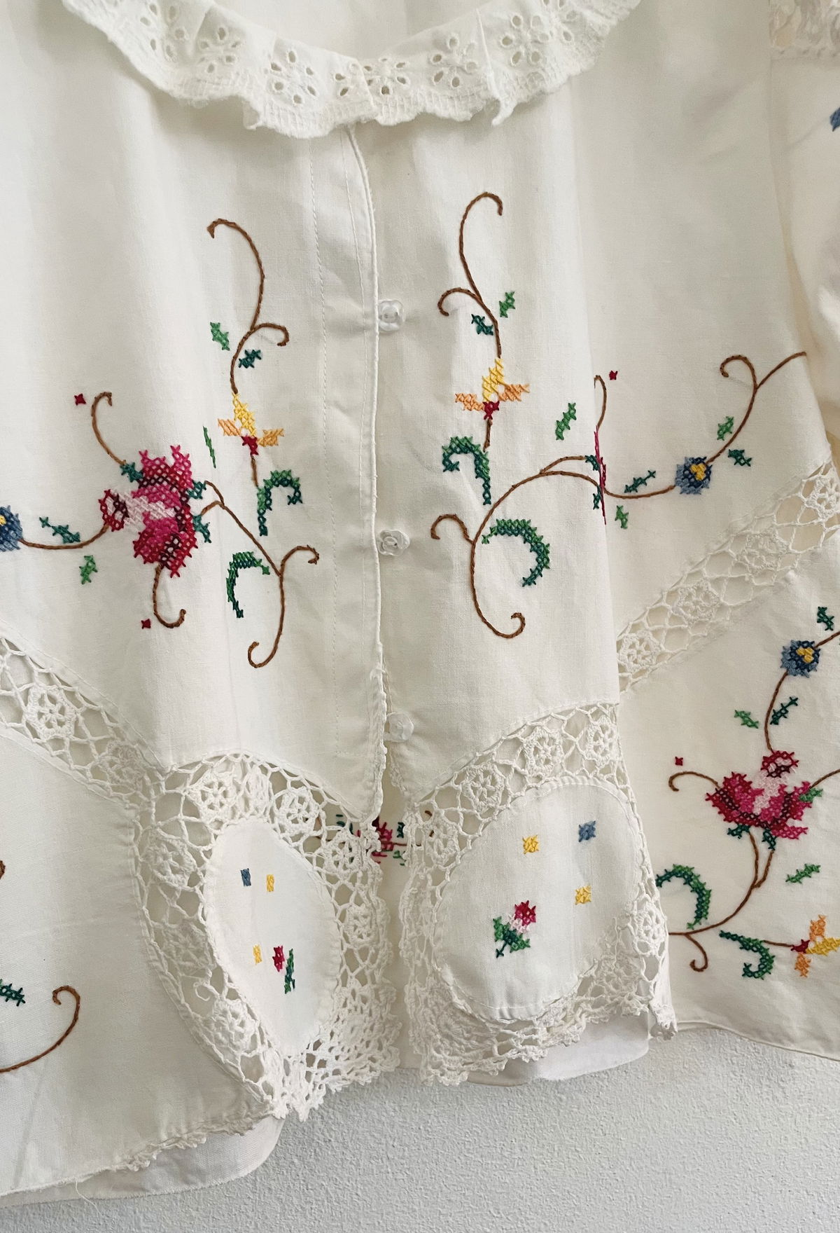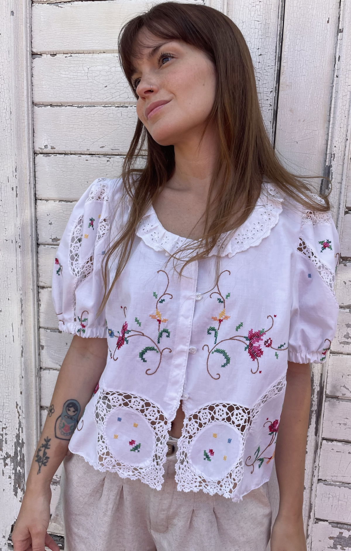 Blusa de algodón con bordados en punto cruz y volado de broderie en cuello.