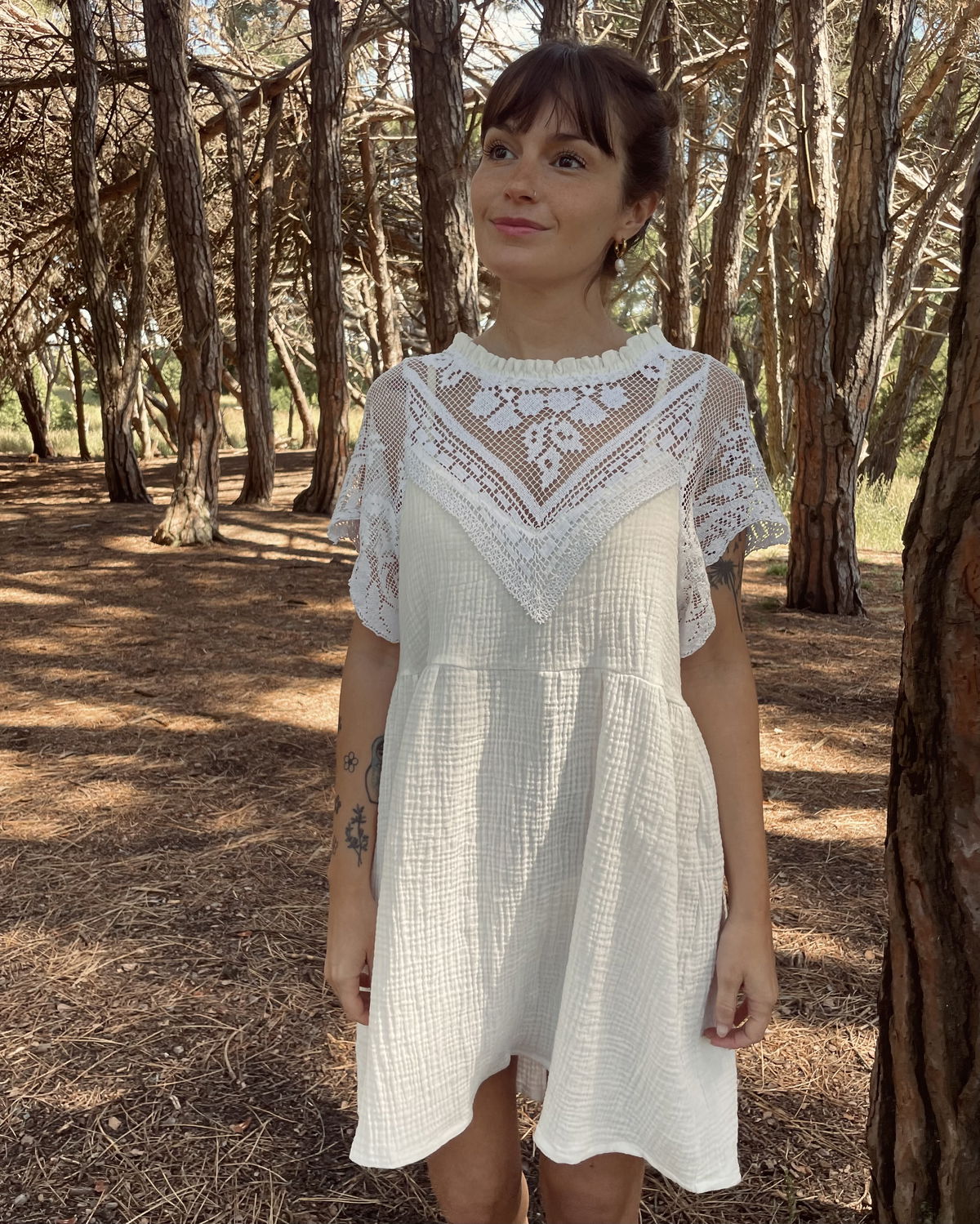 Vestido de baby cotton (gasa de algodón con textura) con apliques de filé francés y volado en cuello. Medidas: