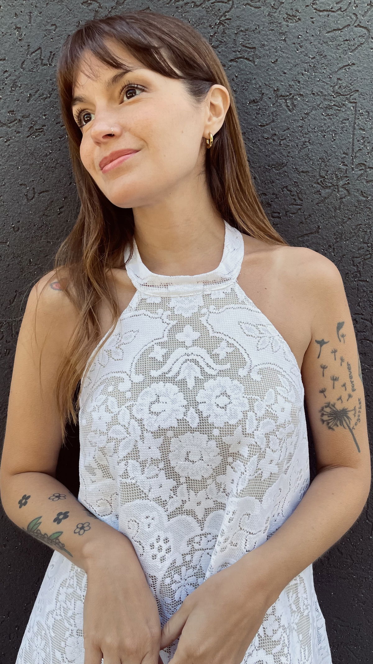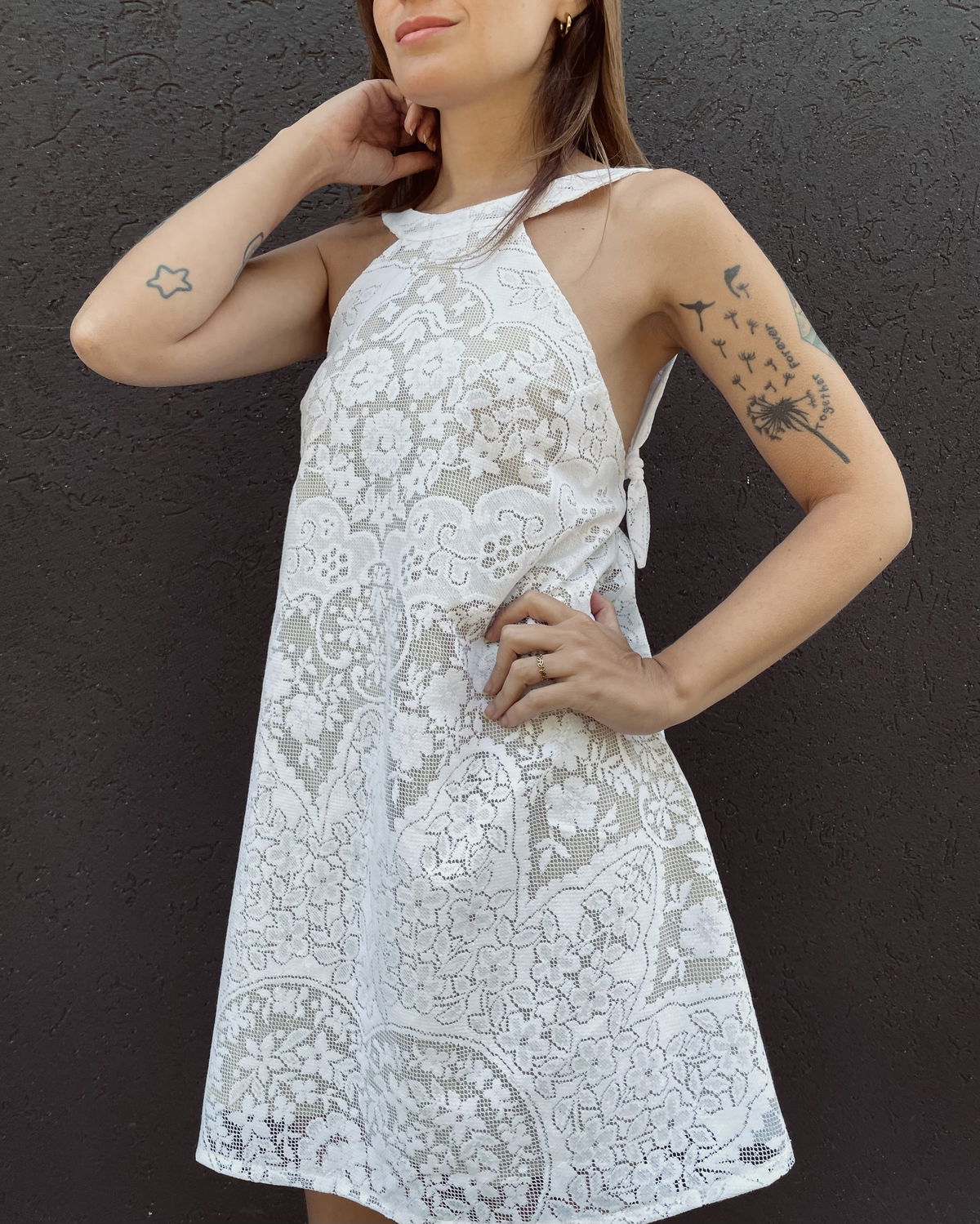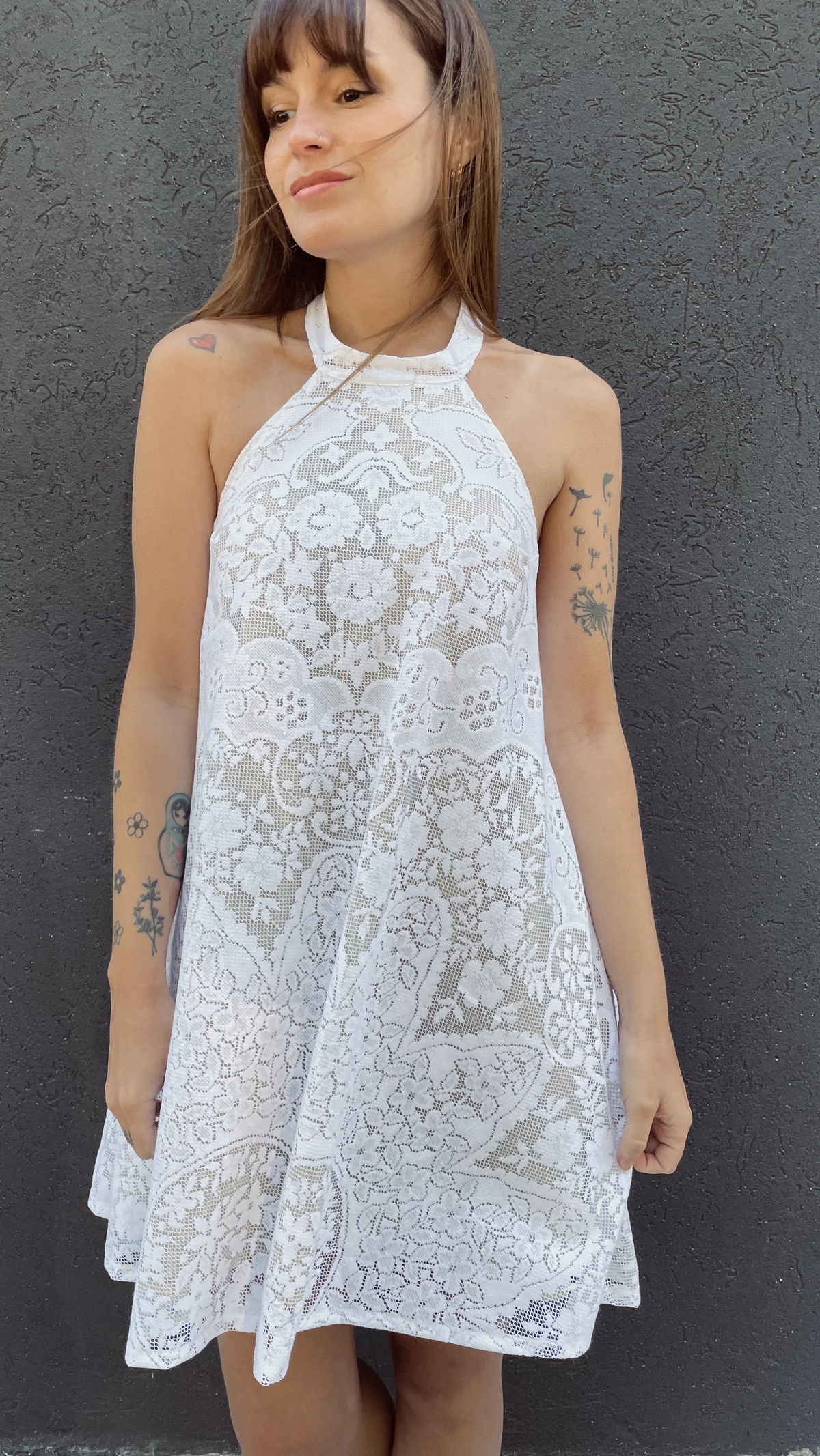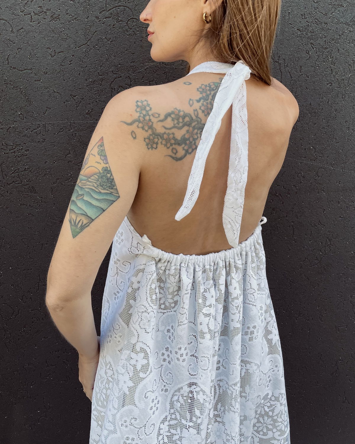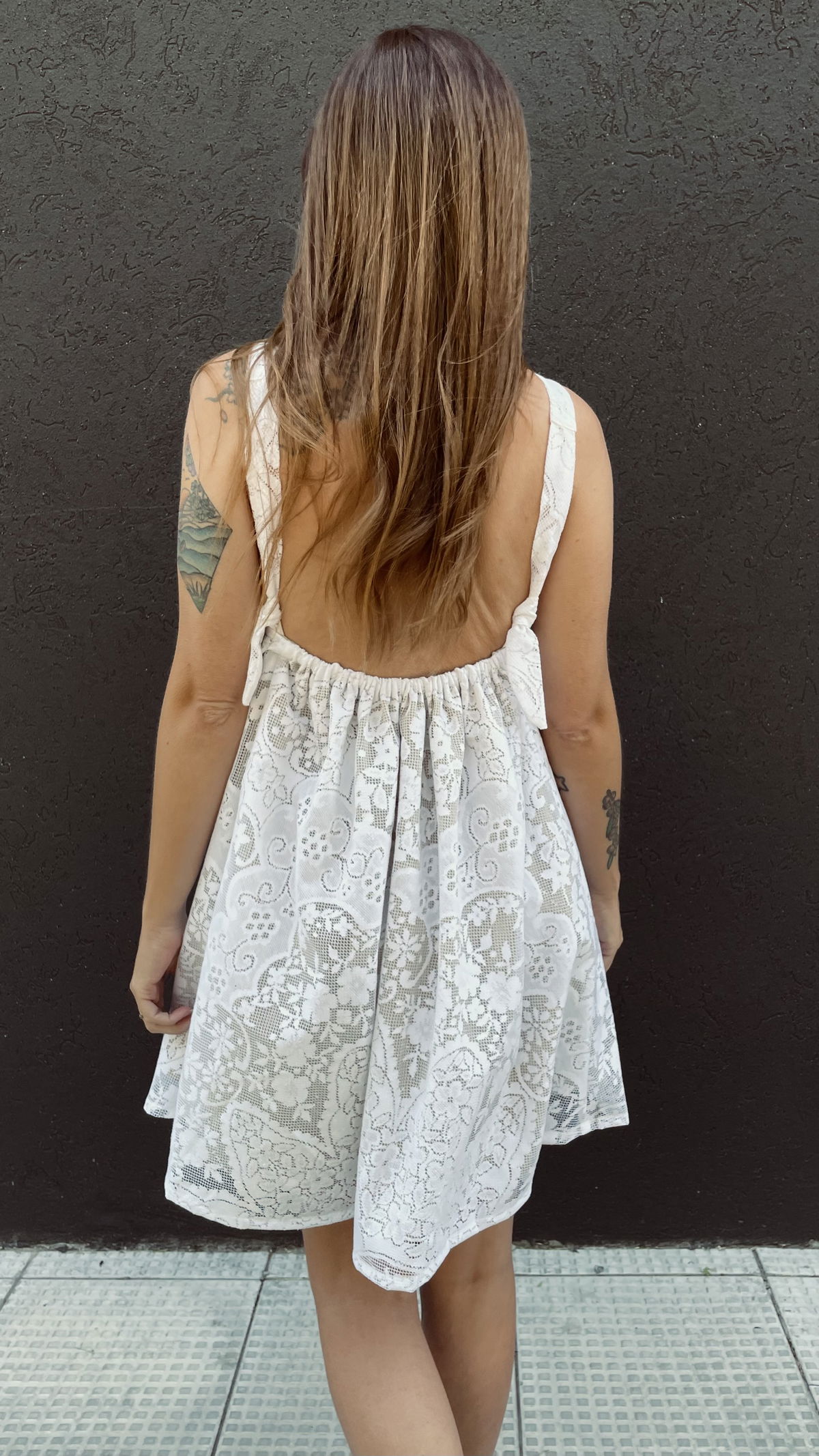 Vestido escote halter, hecho a partir de mantel calado íntegramente forrado en gasa de algodón. Las tiras se pueden atar al cuello o a media espalda ya que tiene unos ojales. (Ver últimas 2 fotos)