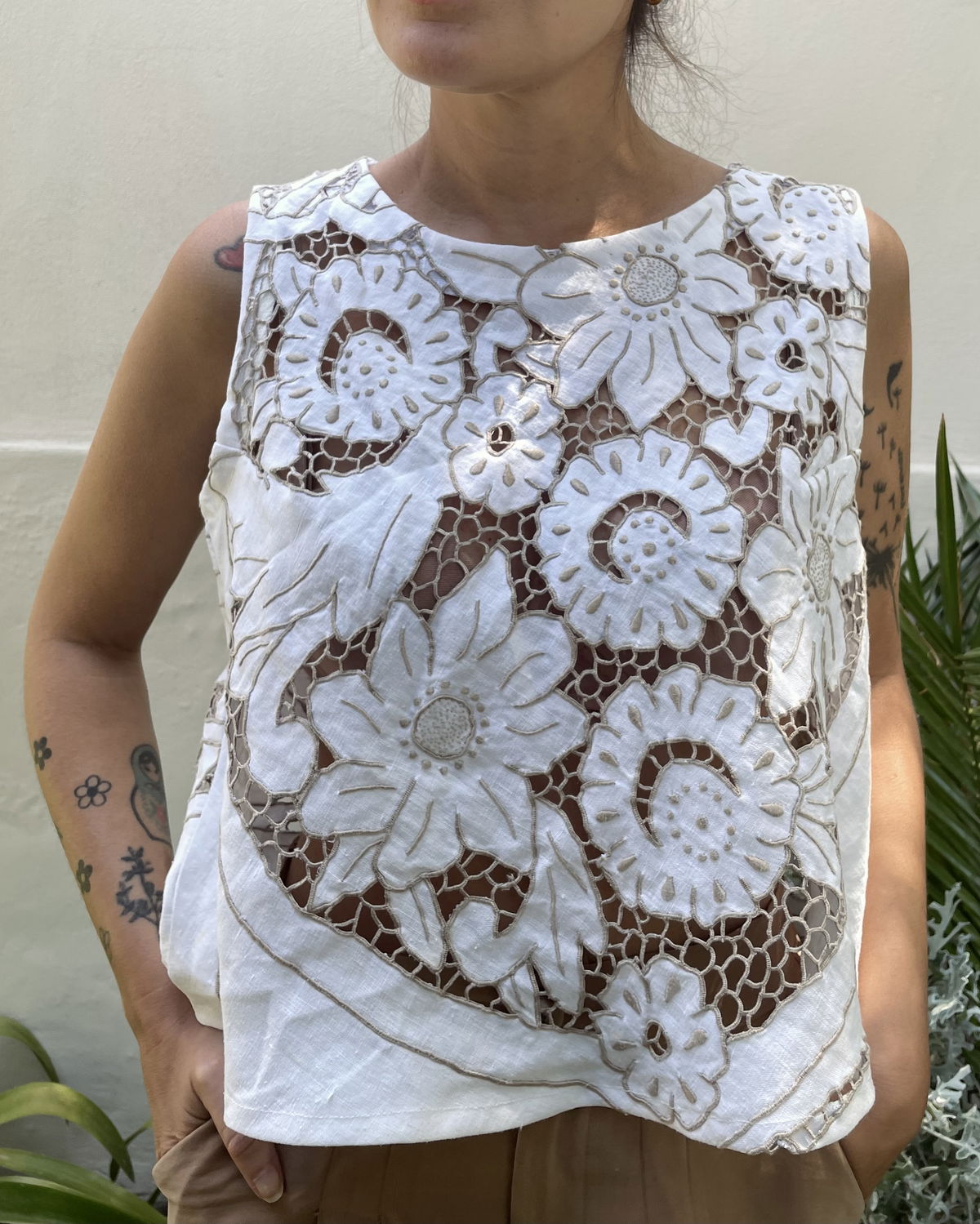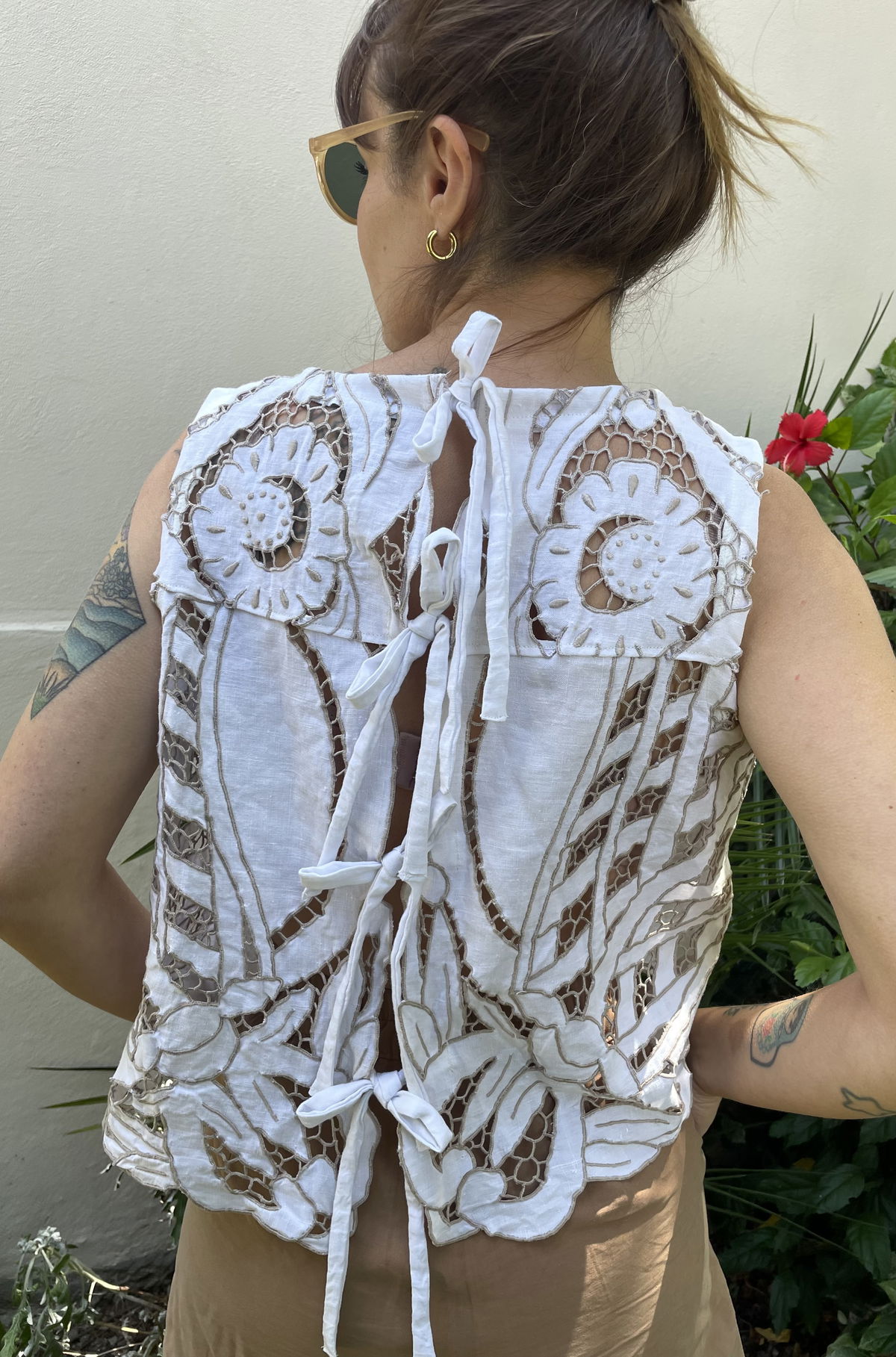 Blusa sin mangas de algodón con bordado español y calados. Espalda abierta con lazos para atar