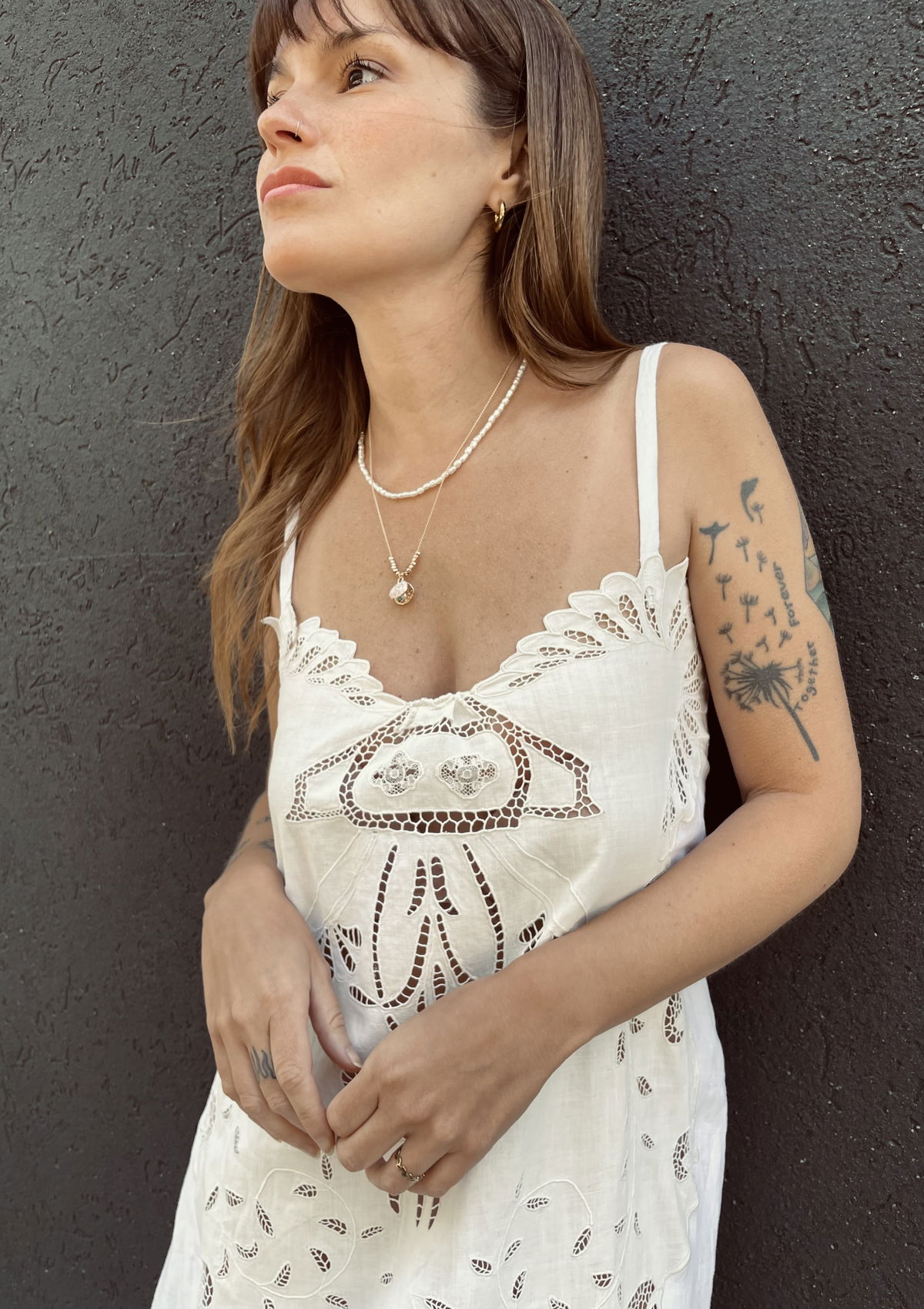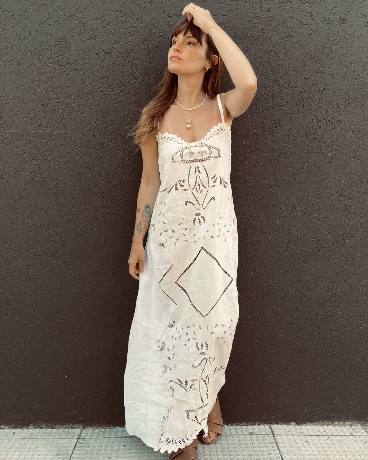 Vestido largo confeccionado con camino de algodón con bordado richelieu combinado con algodon vainillado. Fruncido en la espalda que lo hace adaptable a un talle S o M. (hasta 90 de busto aprox)