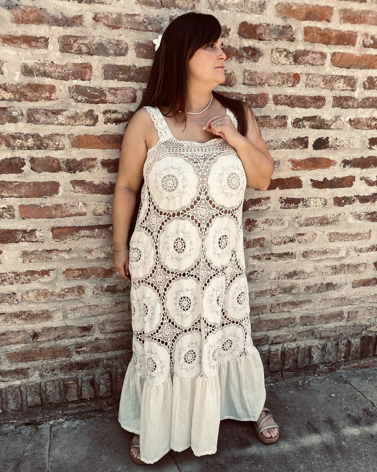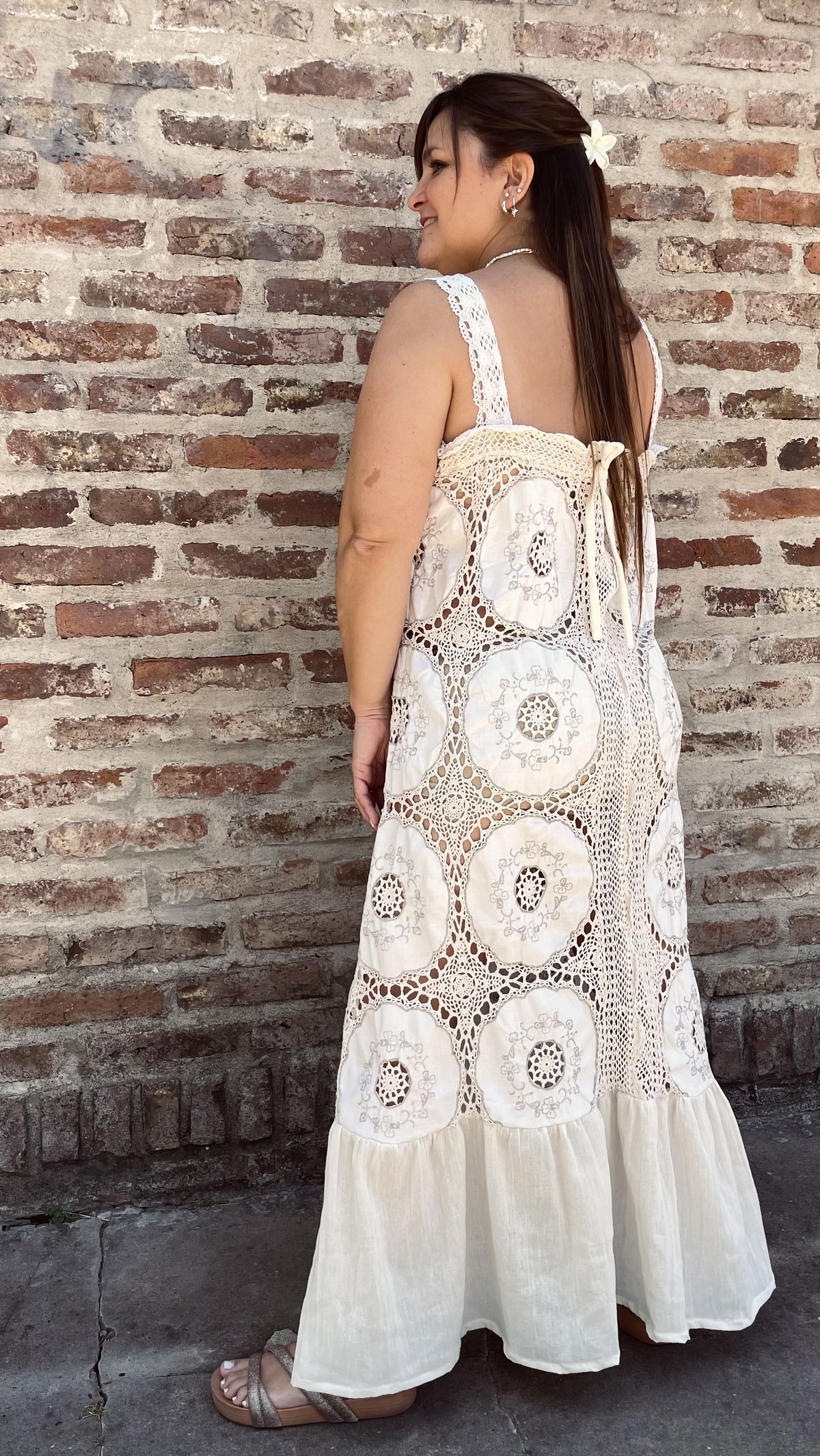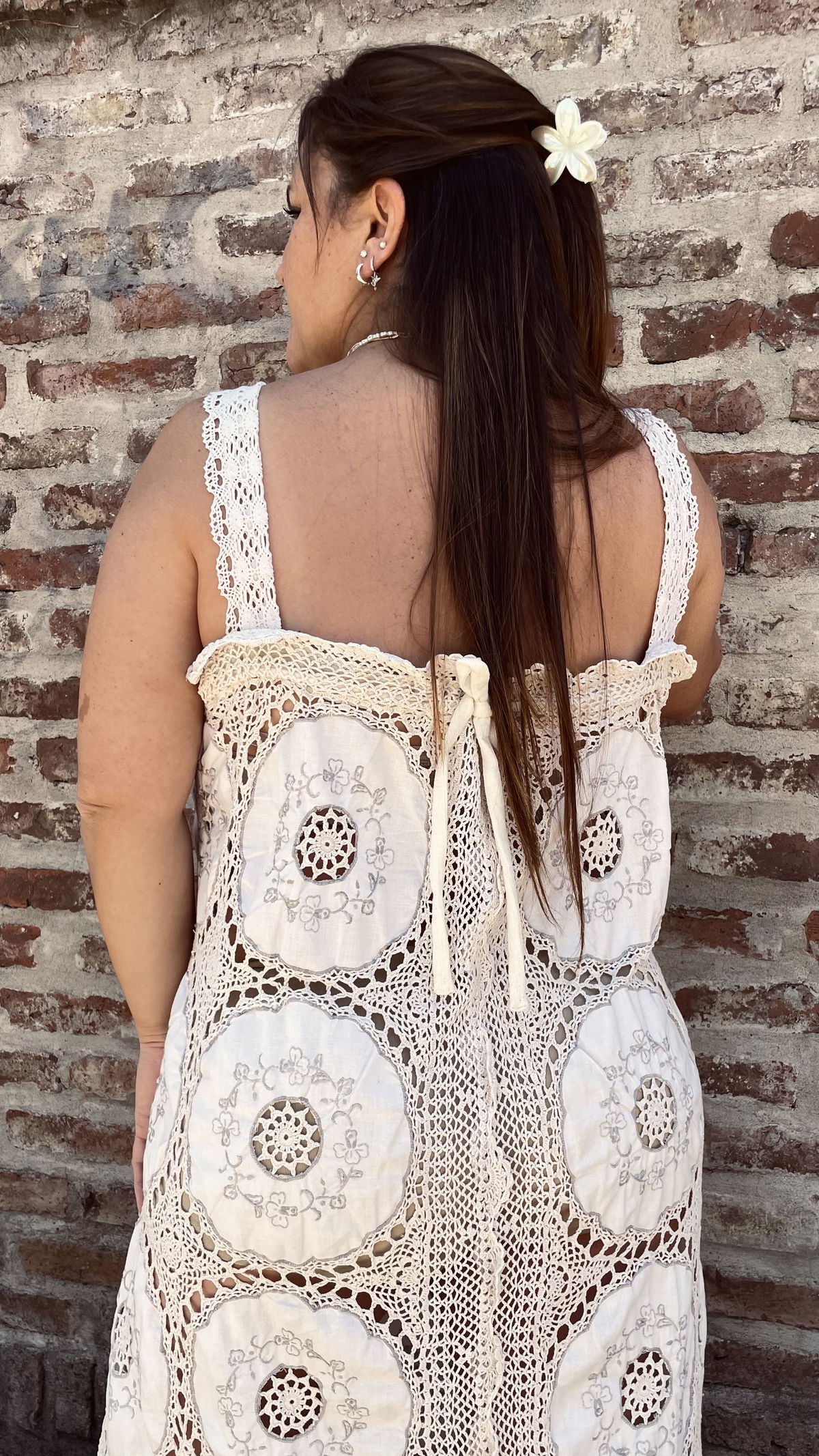 Vestido hecho a partir de mantel combinado de algodón bordado y crochet. Se adapta a distintos talles ya que tiene ajuste a elección en la espalda. La primer modelo tiene 110 cm de contorno de busto y la segunda 85 cm