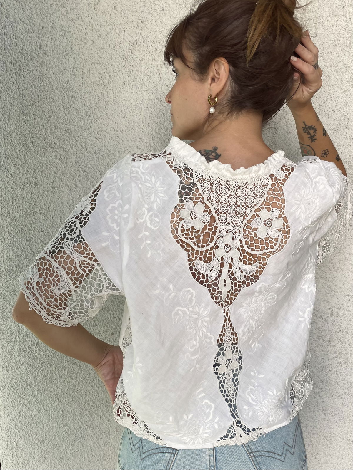 Blusa hecha con mantel de algodón bordado y encaje veneciano. Volado en cuello