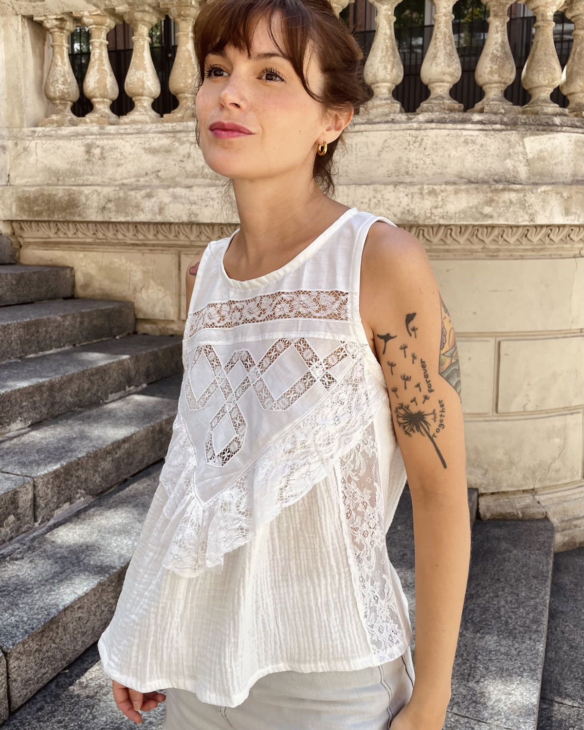 Blusa sin mangas confeccionada en algodón con recortes y detalles de entredós y puntillas
