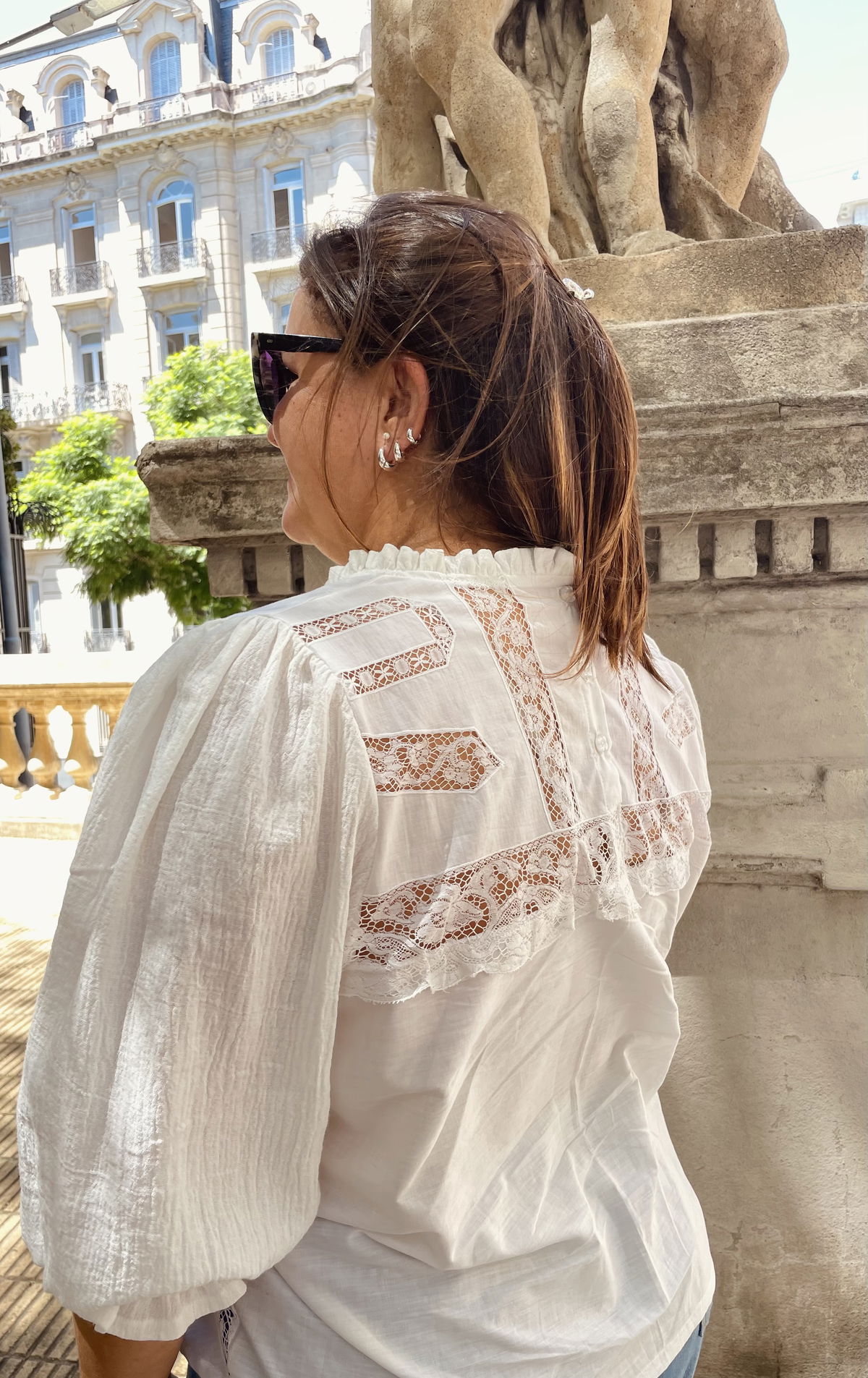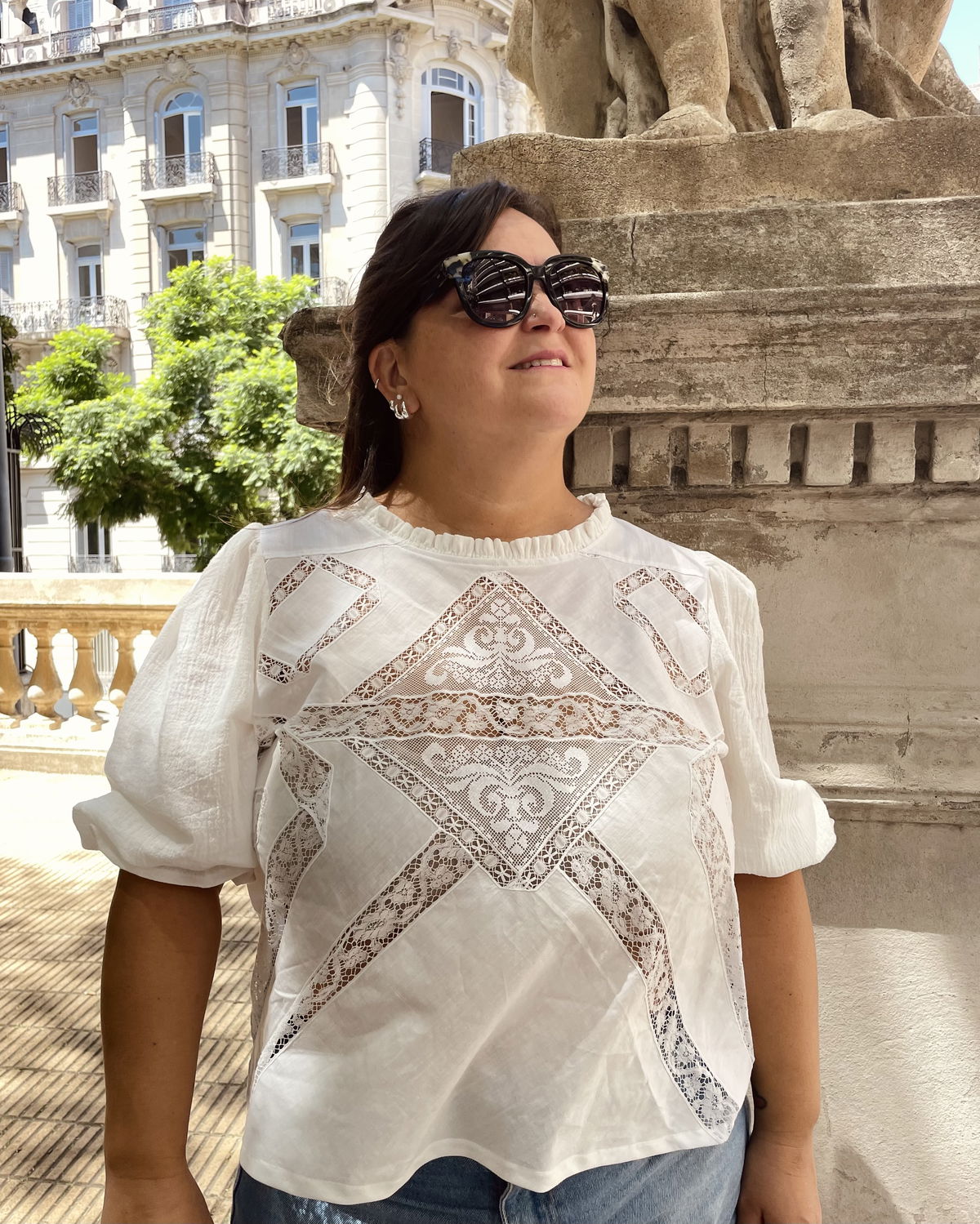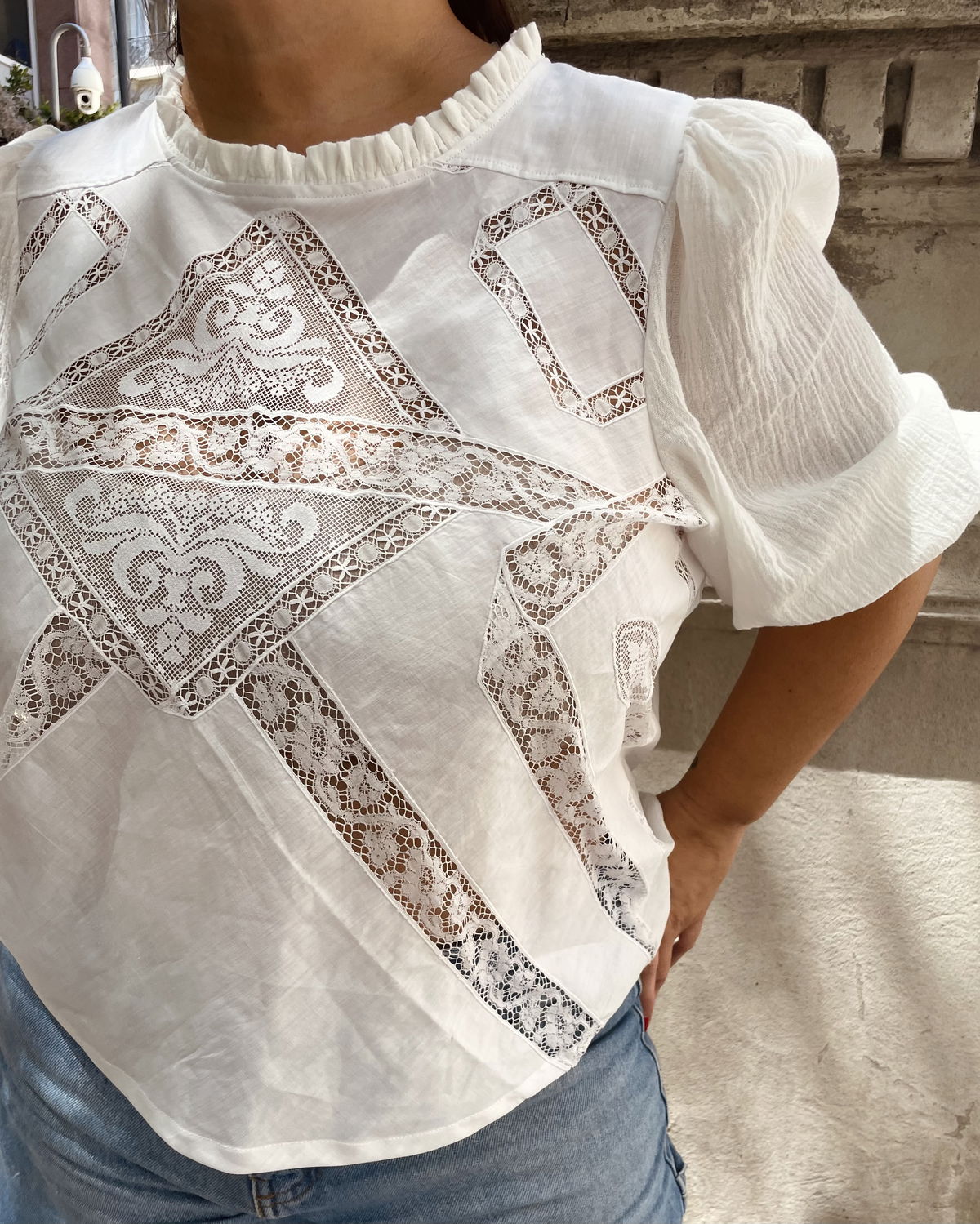 Blusa confeccionada en algodón liviano con recortes y detalles de entredós y puntillas. Mangas globo de gasa de algodón
