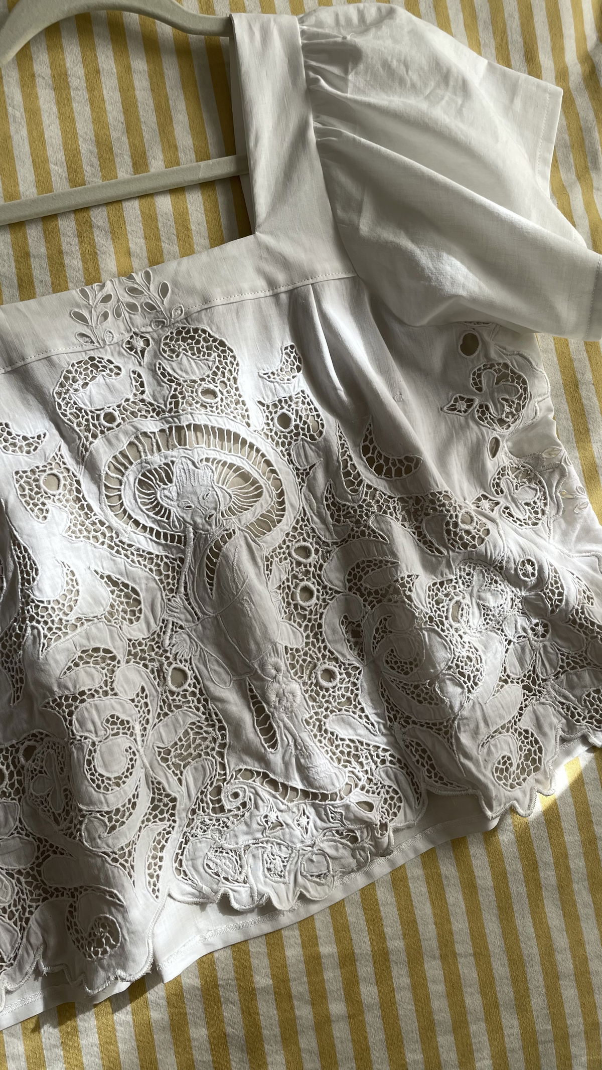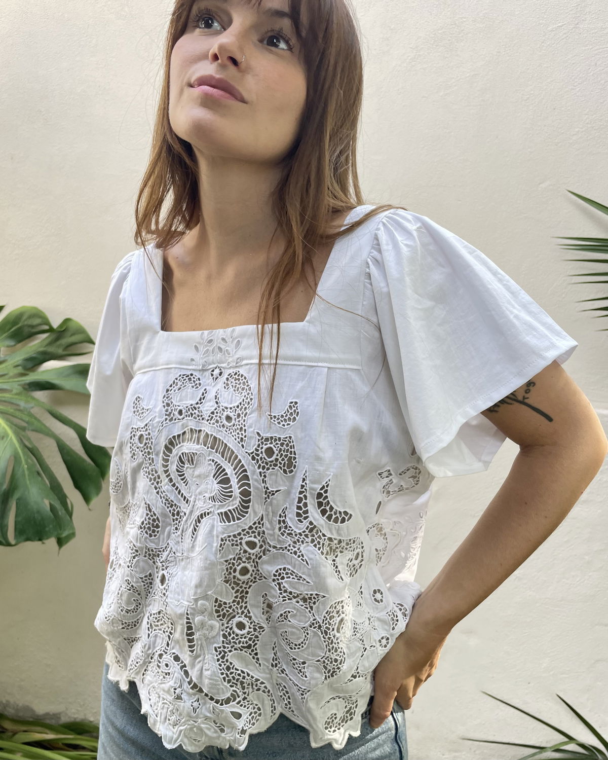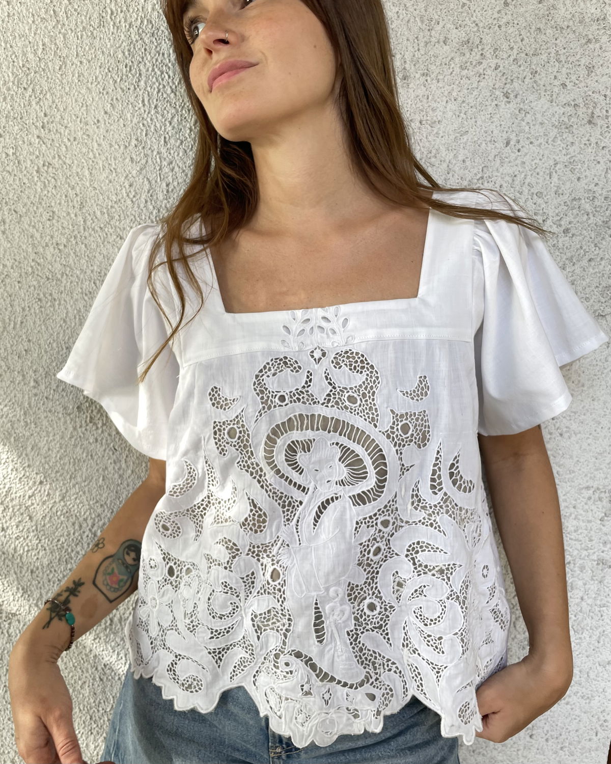 Blusa confeccionada en algodón liviano con bordado de geisha y calados. Tiene entretela color nude debajo del espacio calado con lo cual no trasluce