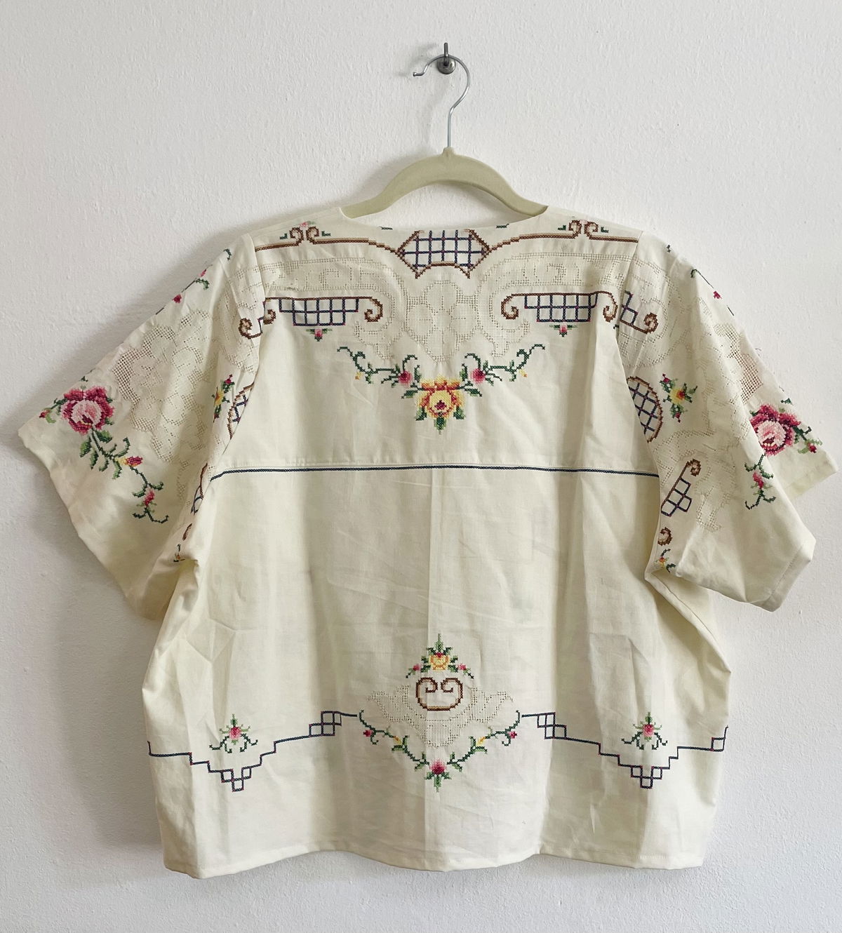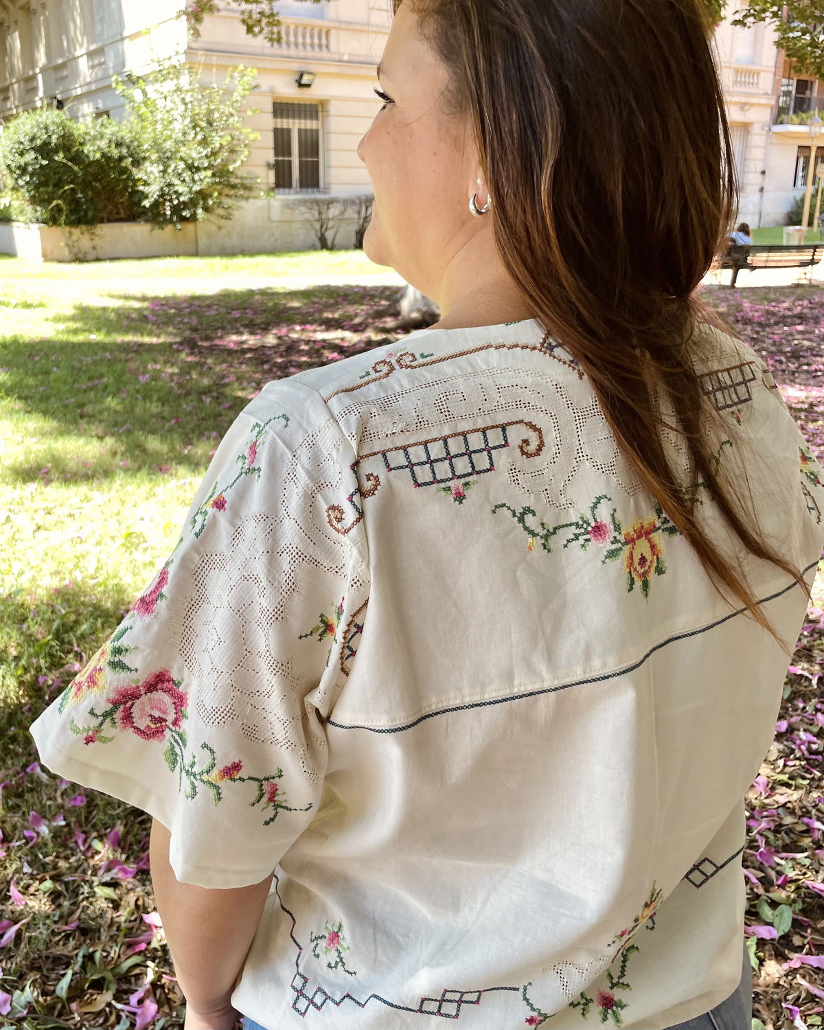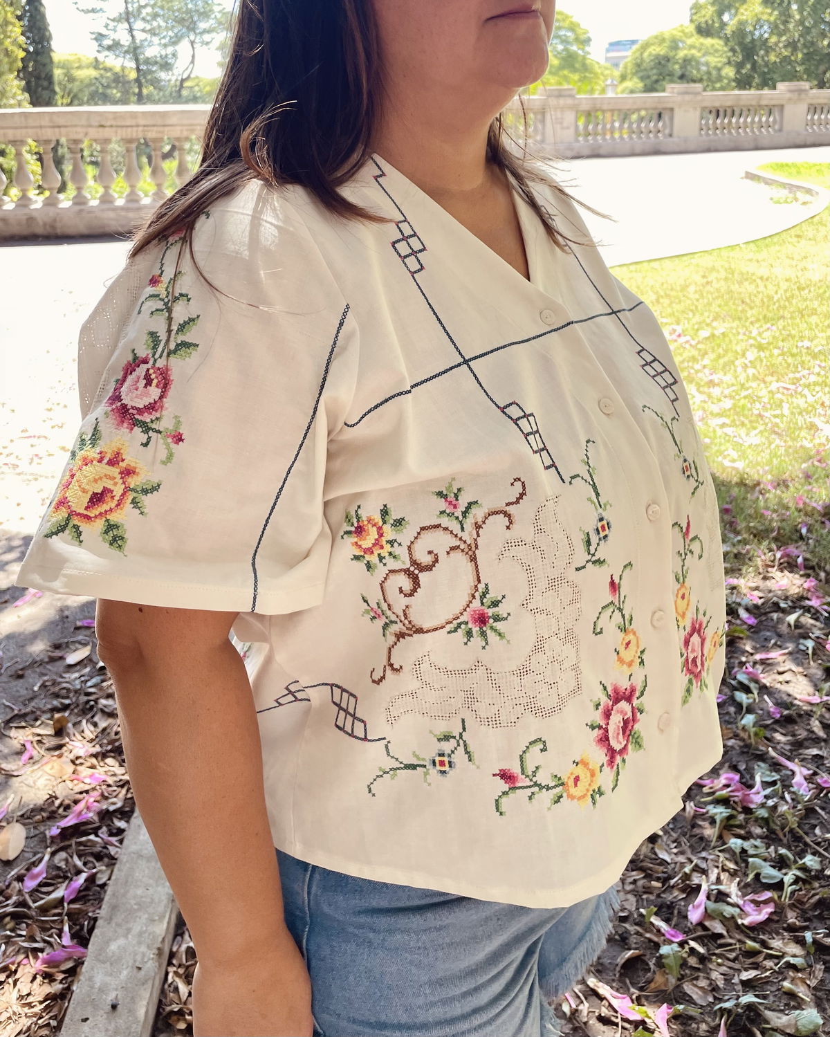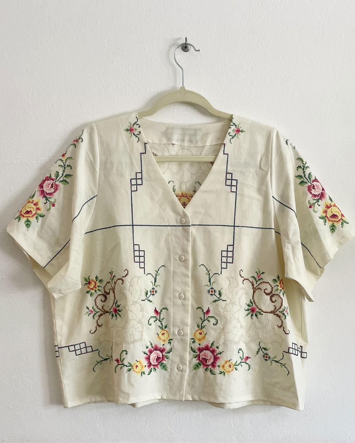 Blusa de algodón con bordados en punto cruz y cuello en V.