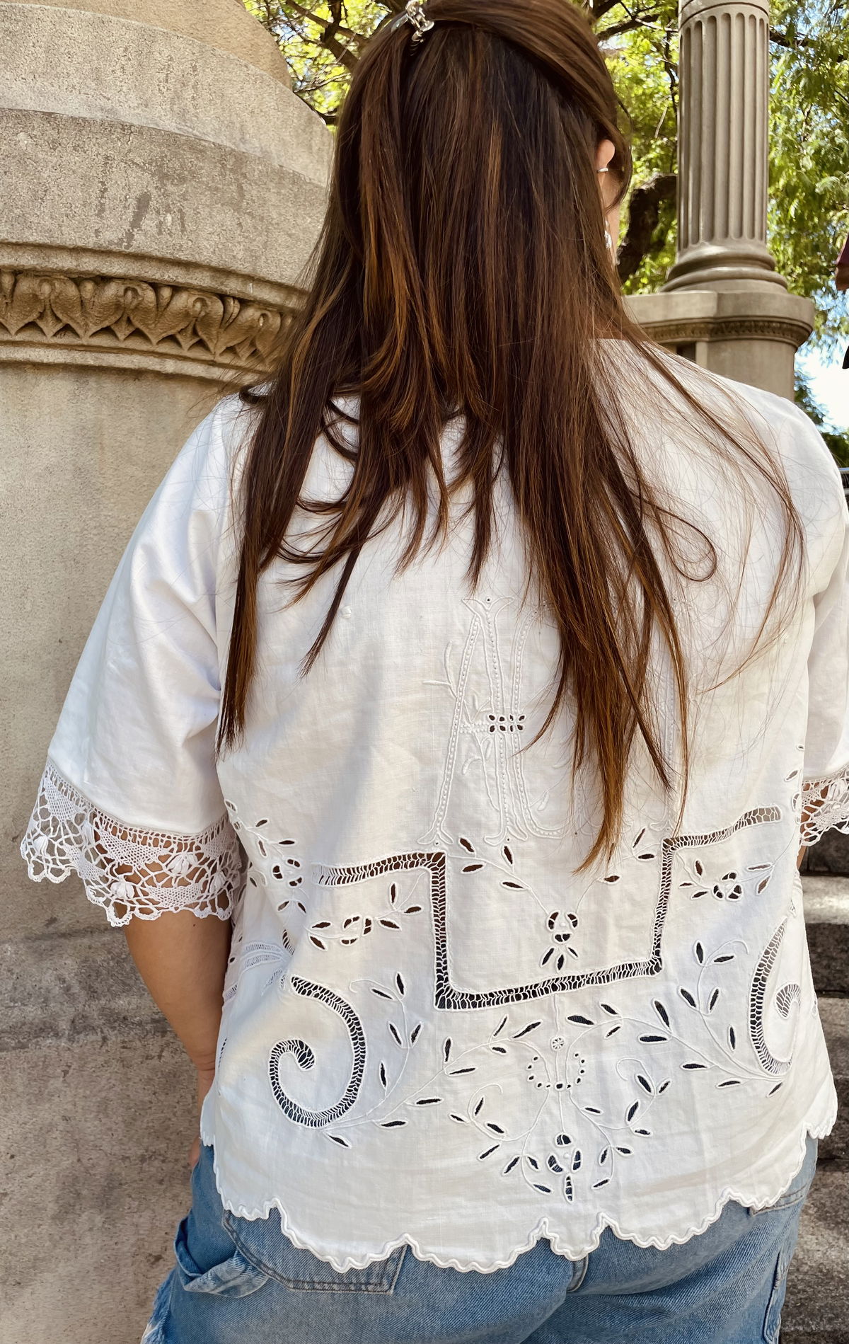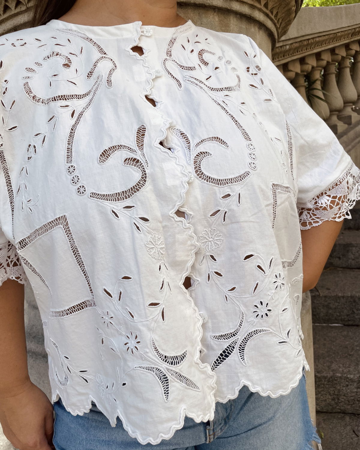 Blusa de algodón con bordado richelieu y calados. Manga acampanada con puntilla de bolillos