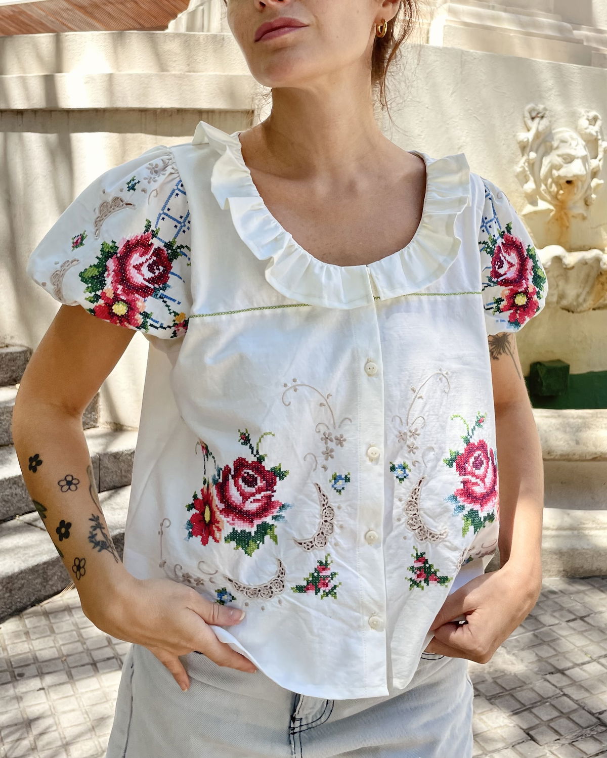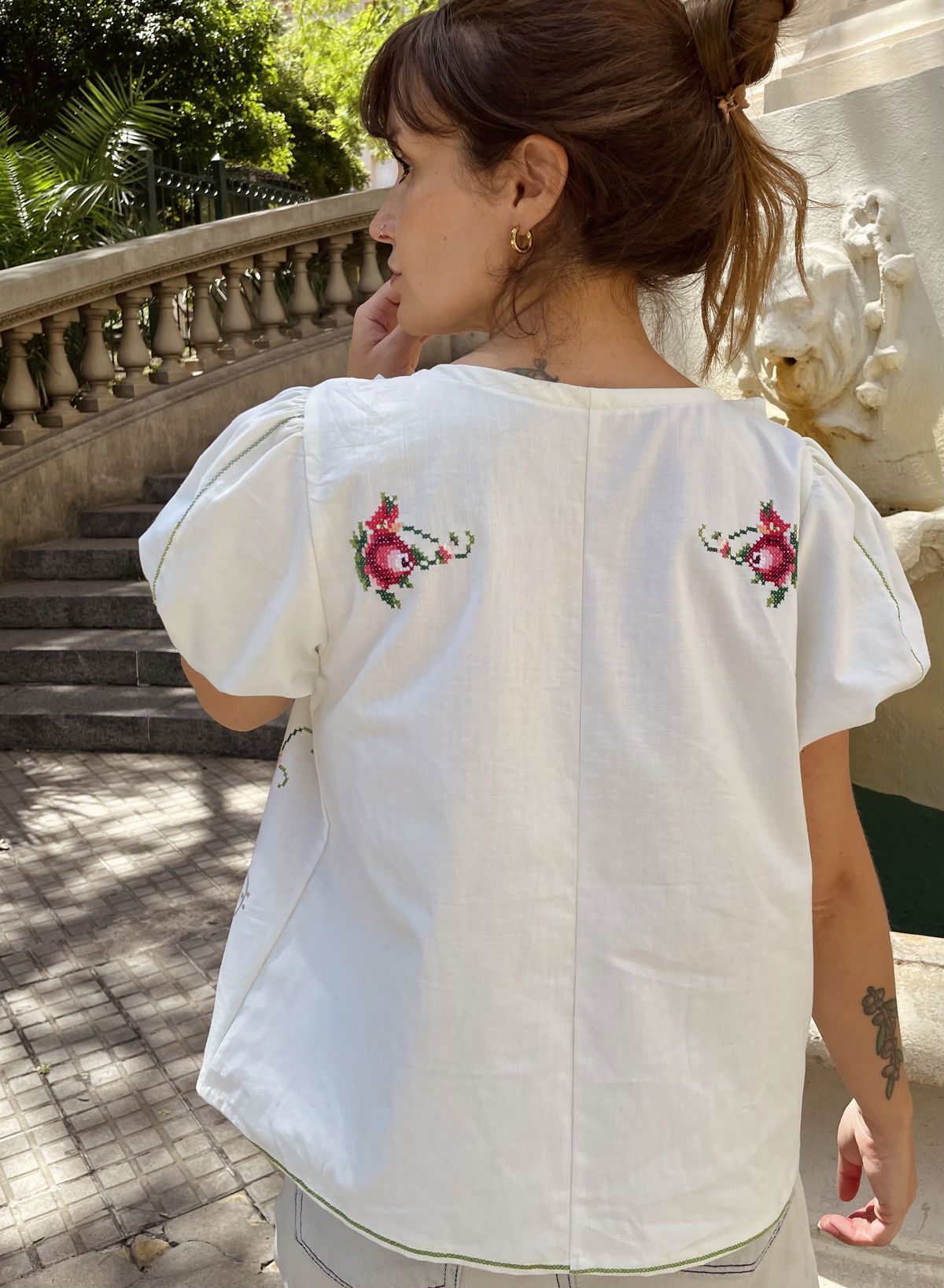 Blusa de algodón con bordados en punto cruz y volado en cuello. Mangas globo