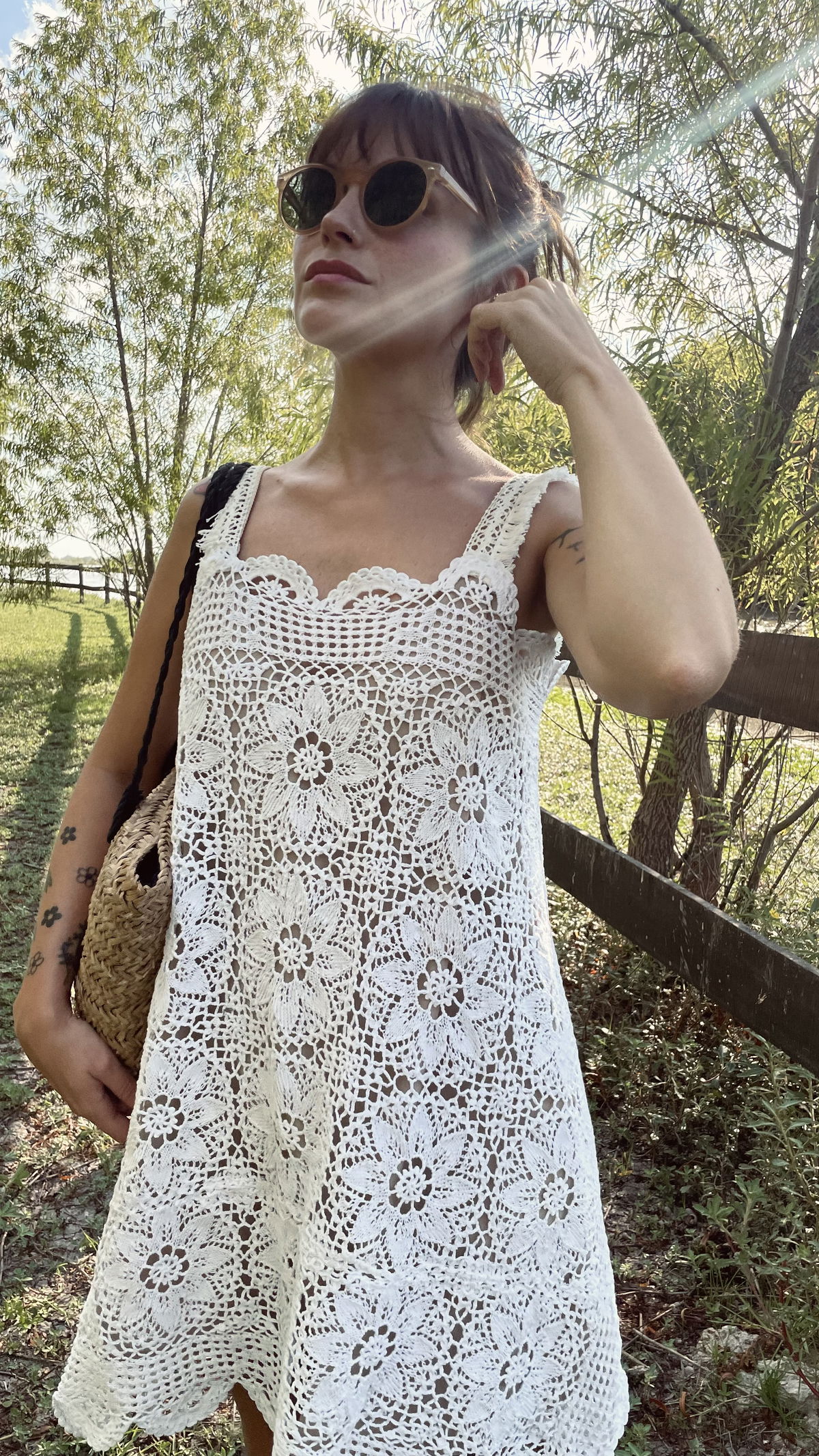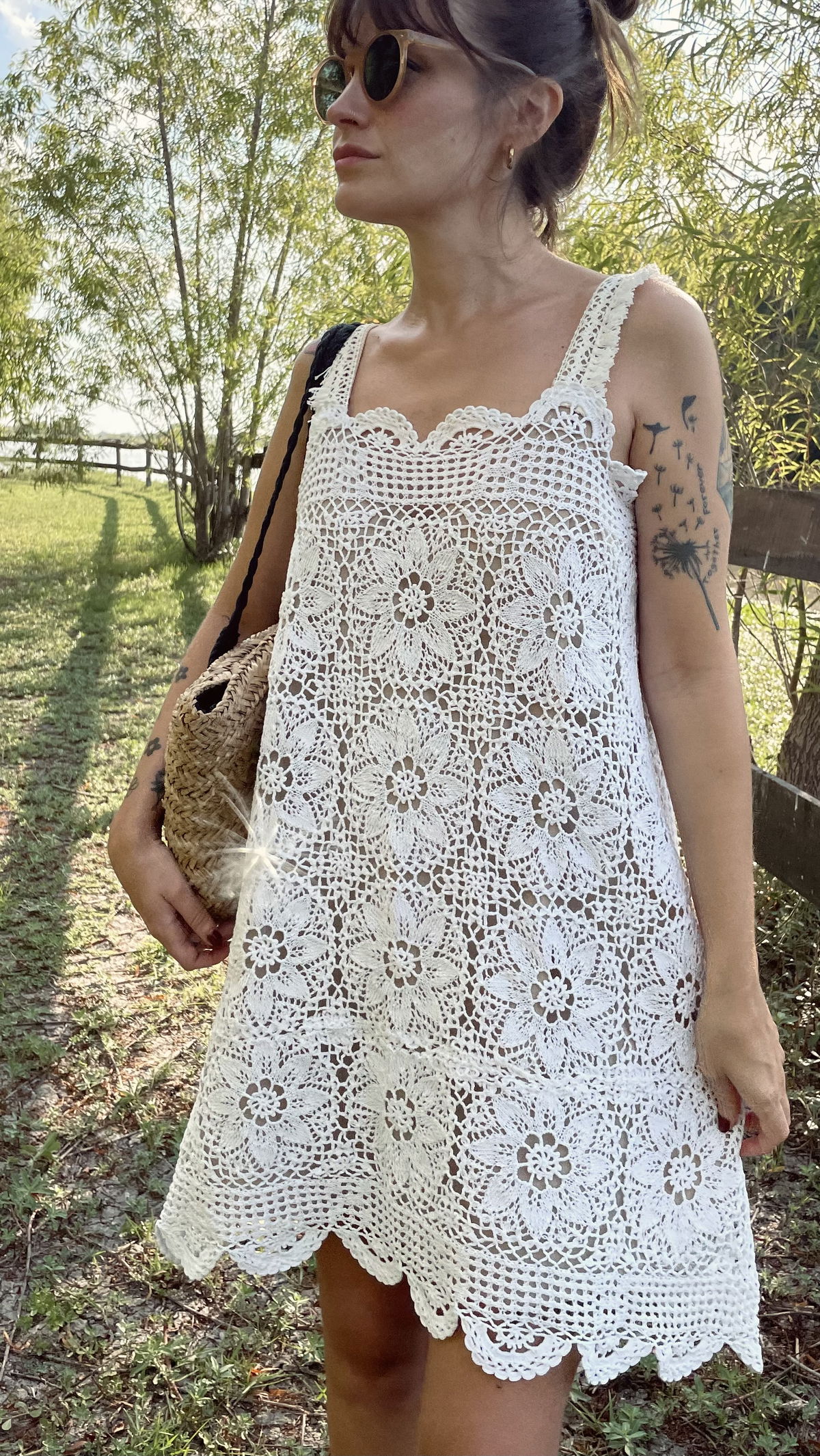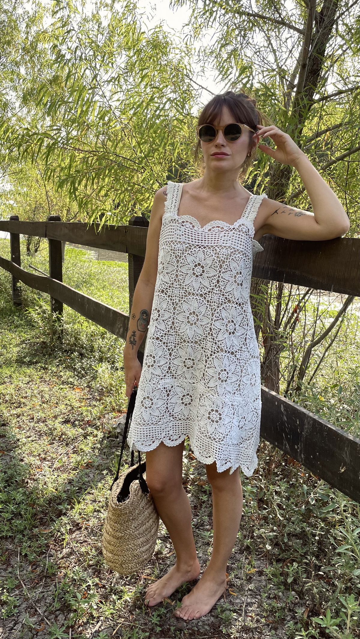Vestido confeccionado con piezas tejidas en crochet. Incluye otro vestido color nude que sirve de "enagua" para que no se trasluzca debajo o tambien se puede usar solo sobre un traje de baño