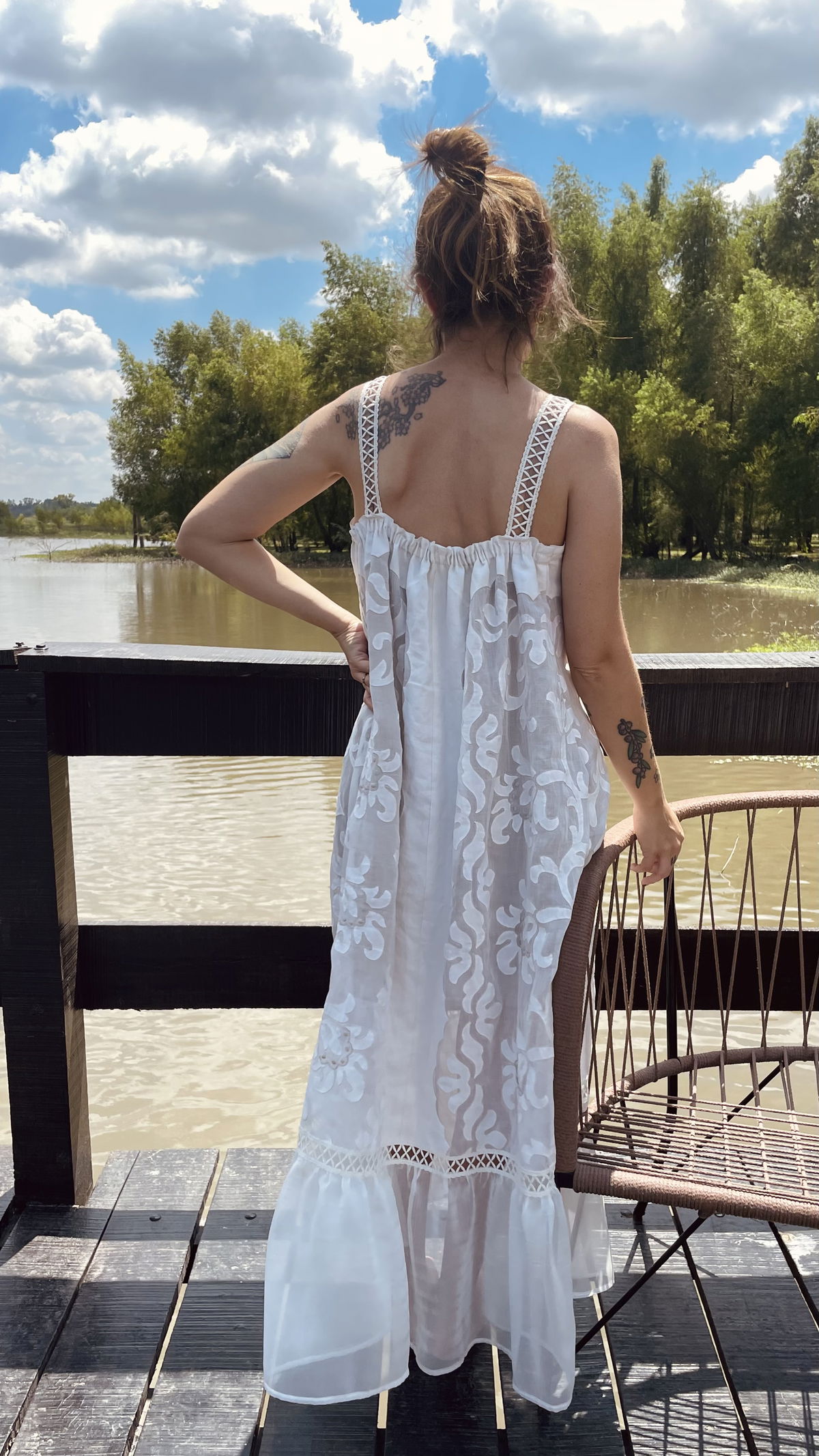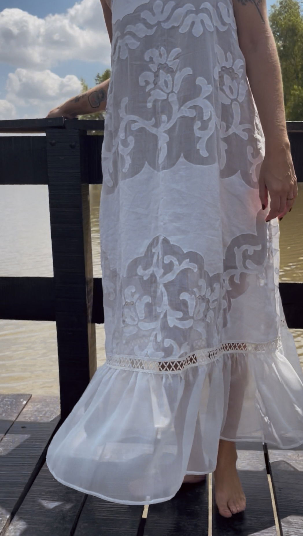 Vestido hecho con género antiguo de organza con aplicaciones en realce, bordado de motas, y volado de gasa de seda natural en ruedo. Tiene elástico en la espalda y forreria liviana color nude hasta arriba de las rodillas.