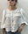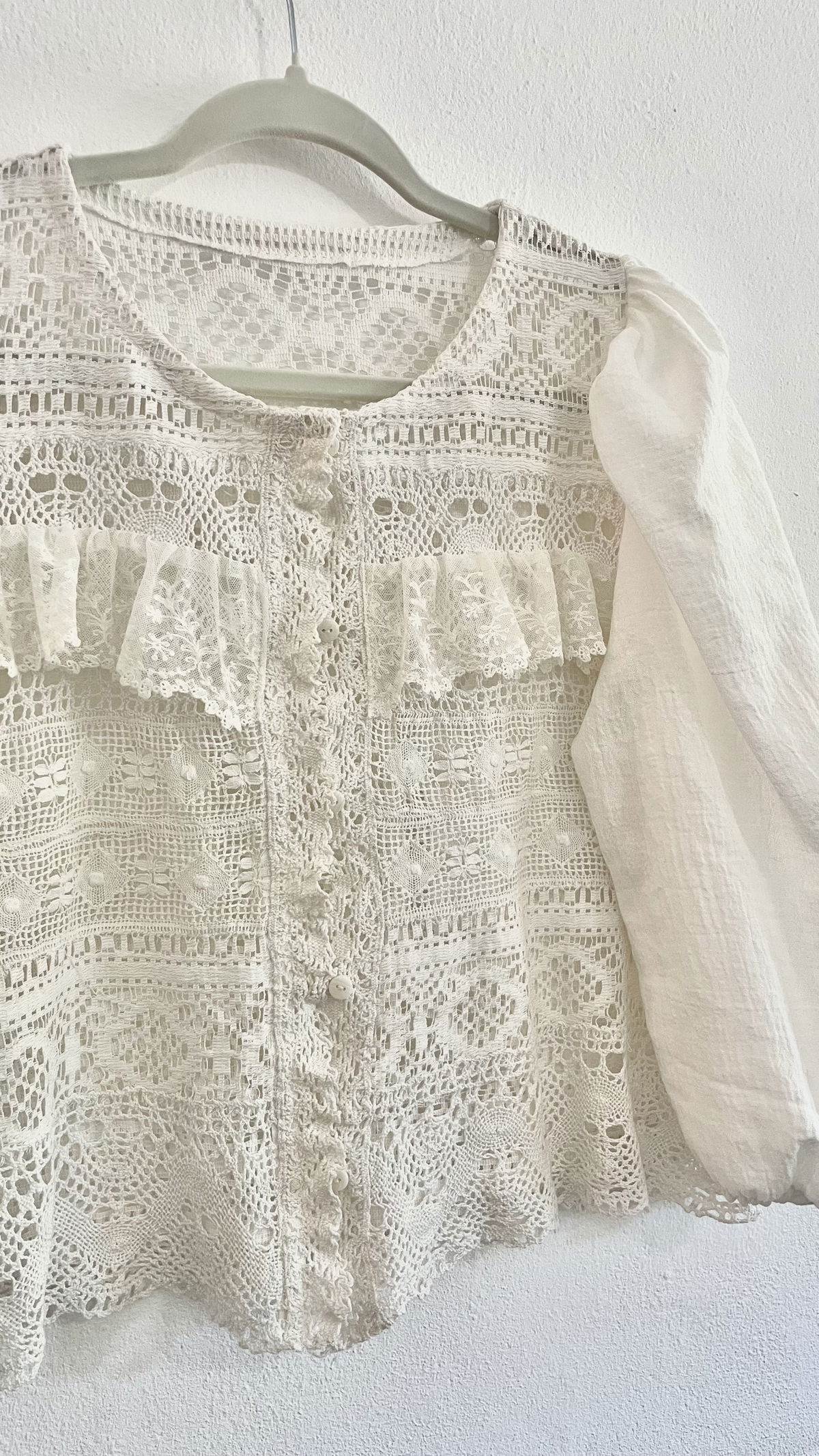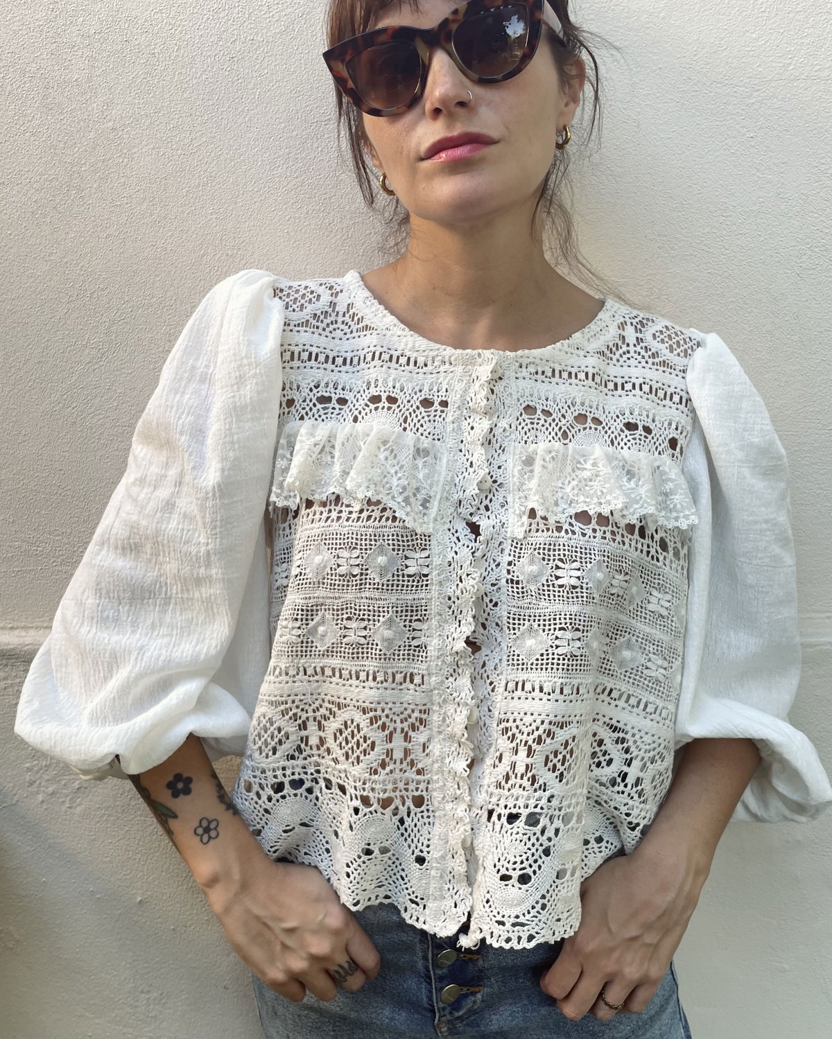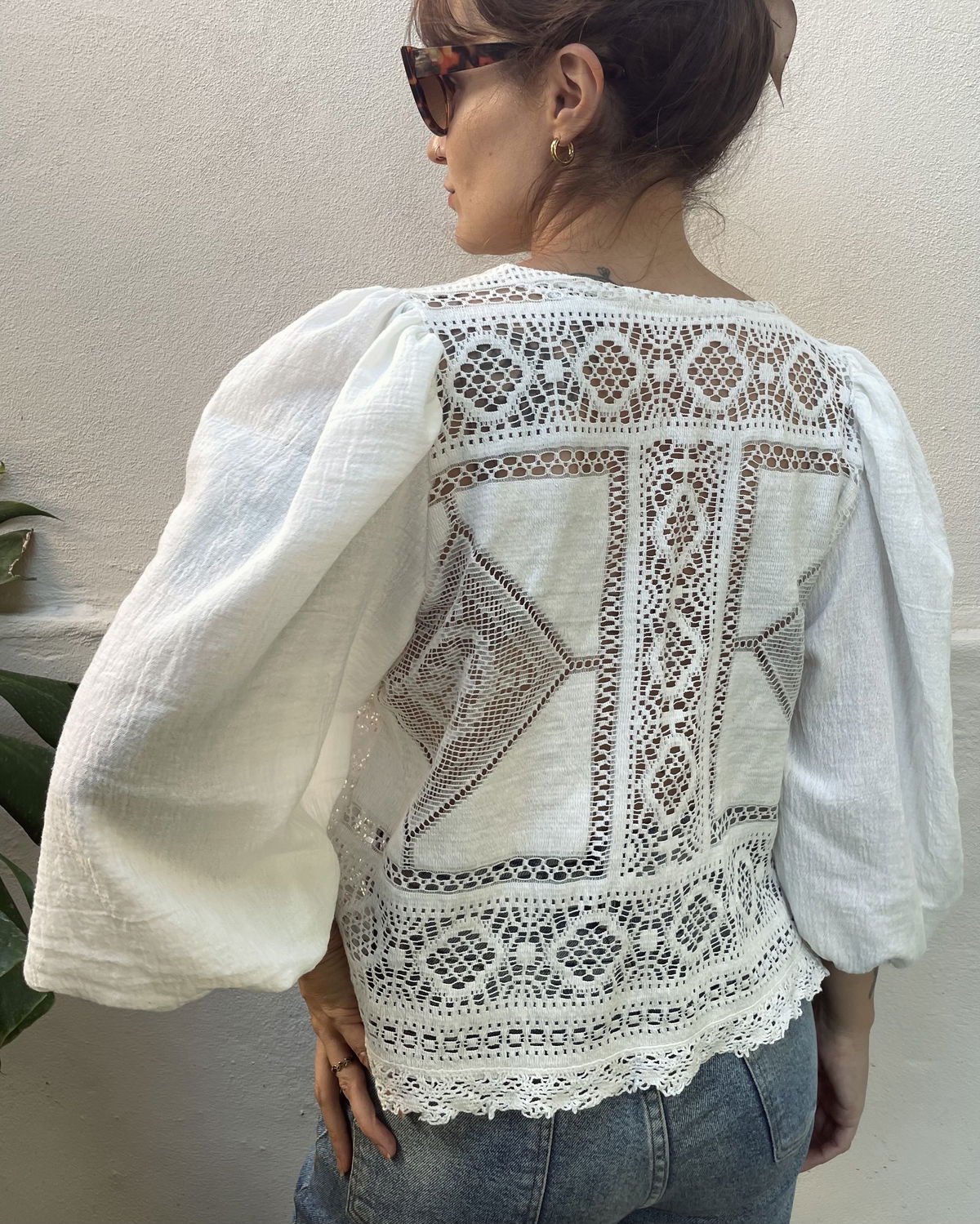 Blusa abierta confeccionada en filé frances mecánico con detalles de encaje de bolillos y puntillas de crochet. Mangas de gasa de algodón abullonadas.