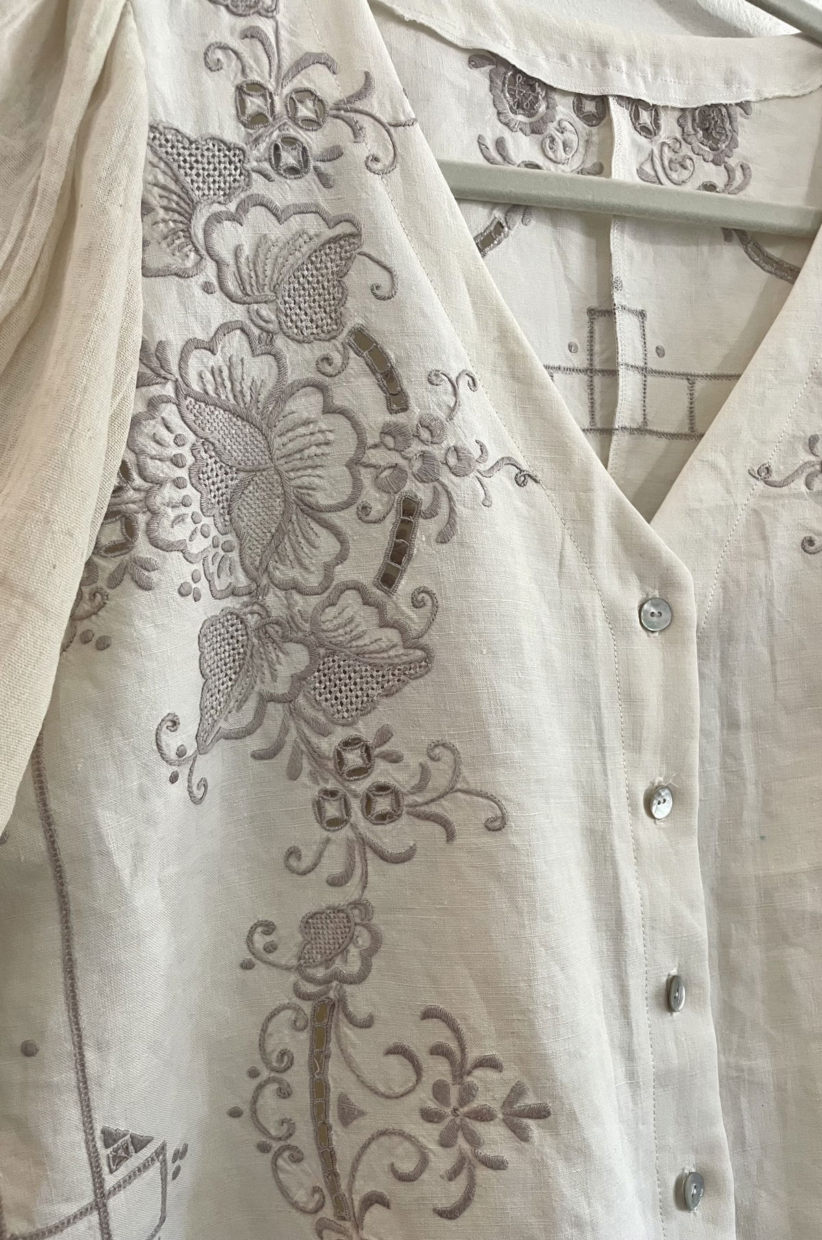 Blusa de algodón bordado, mangas de gasa de algodón, cuello en V y botones de nácar.