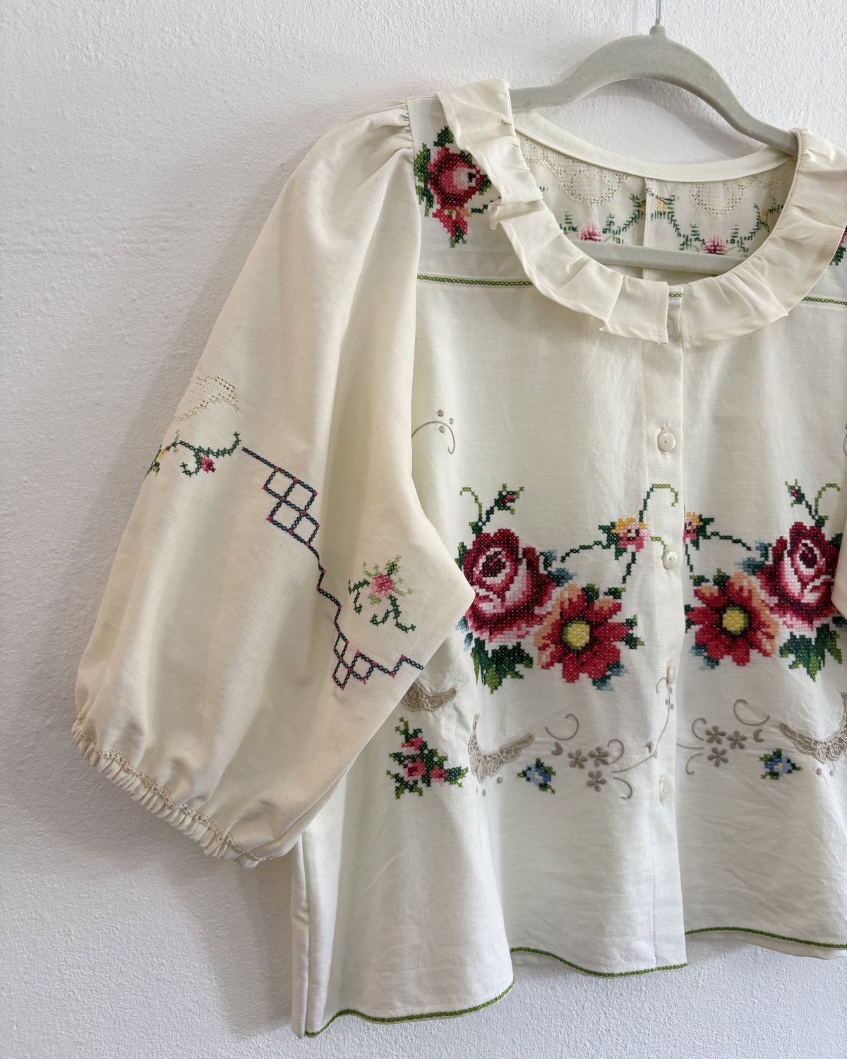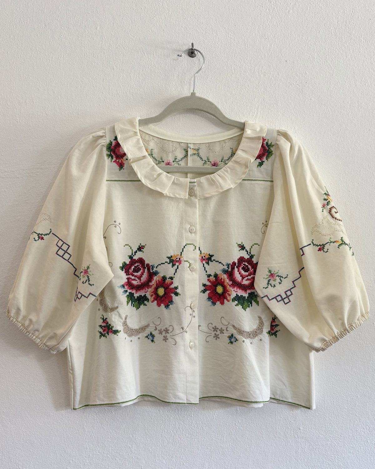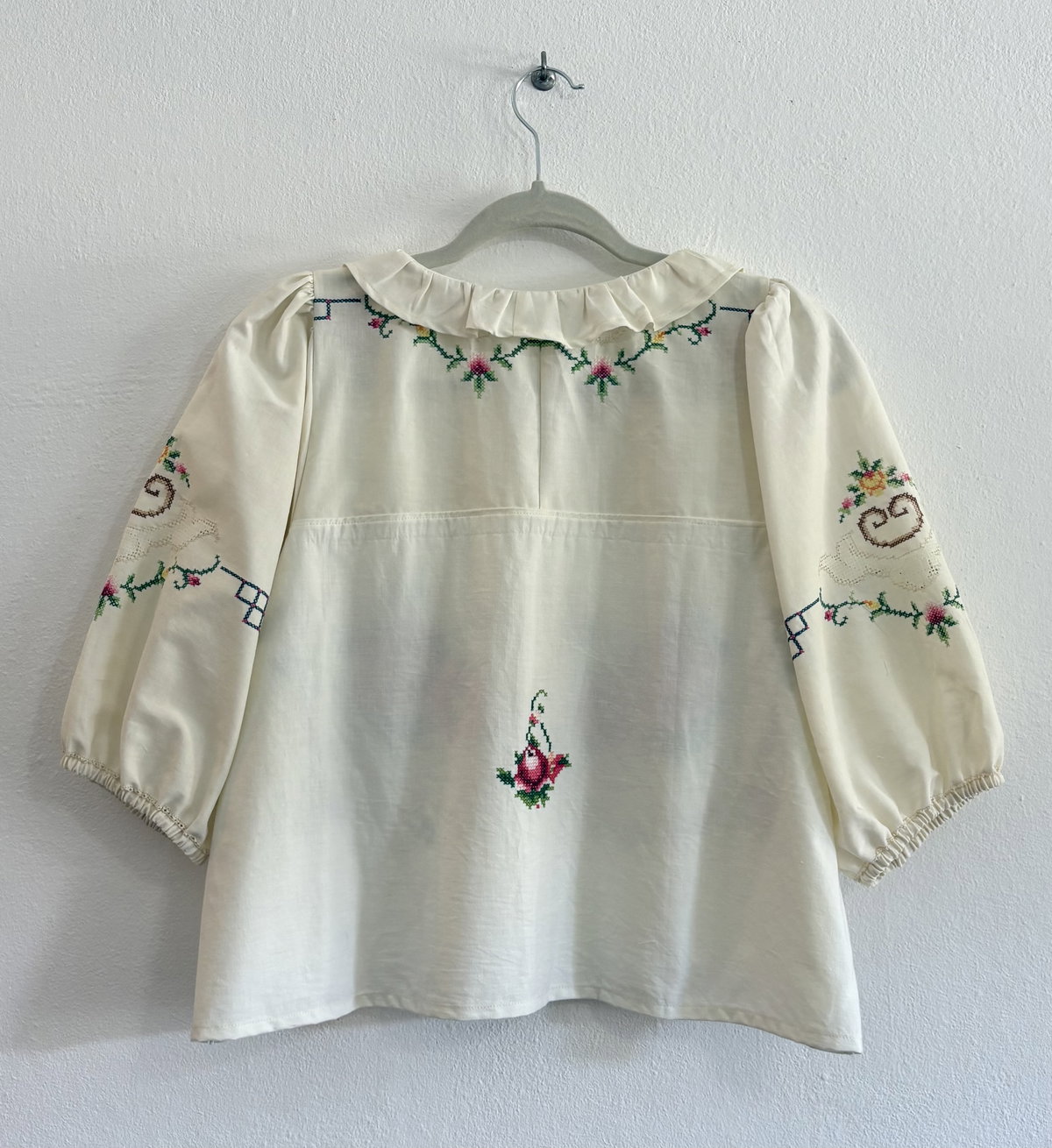 Blusa de algodón con bordados en punto cruz y volado en cuello. Mangas globo