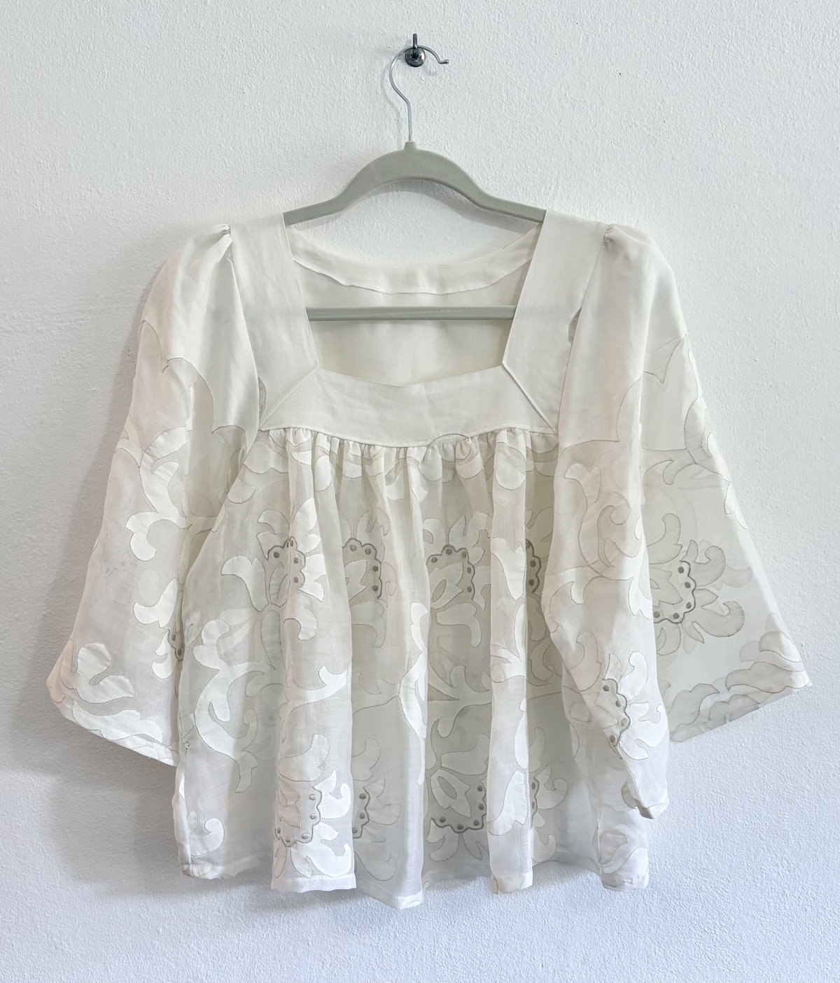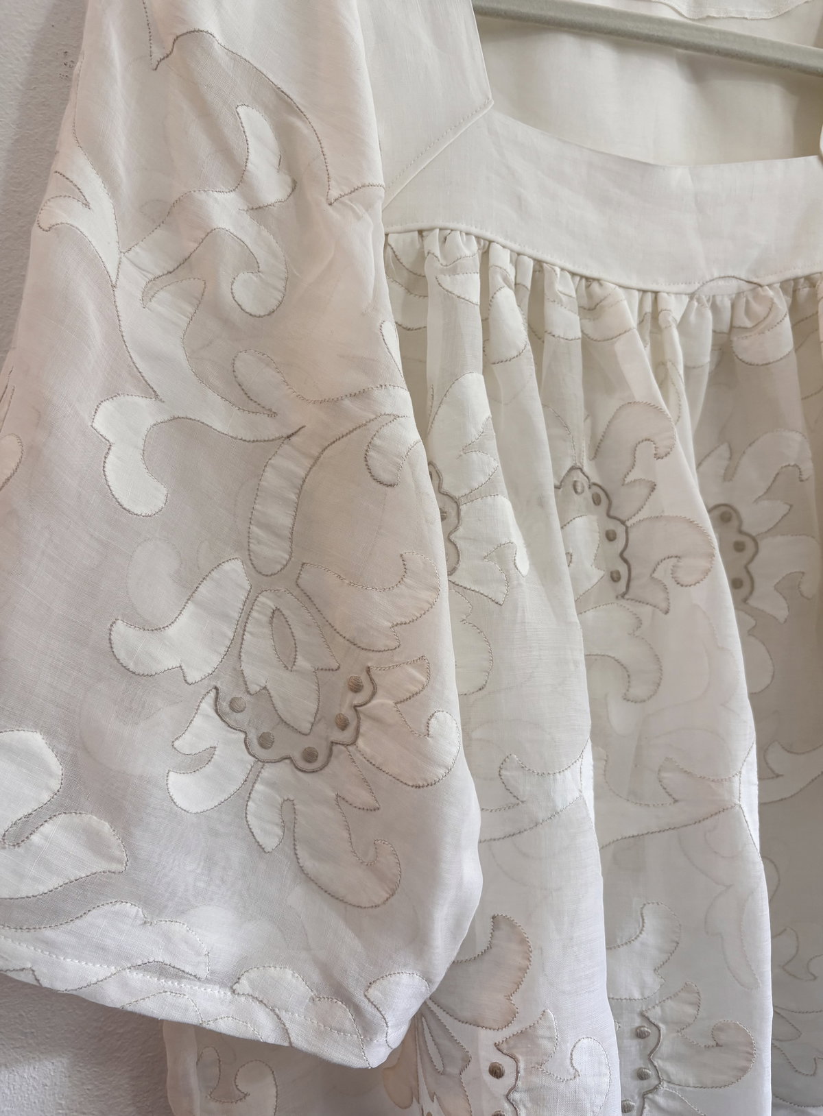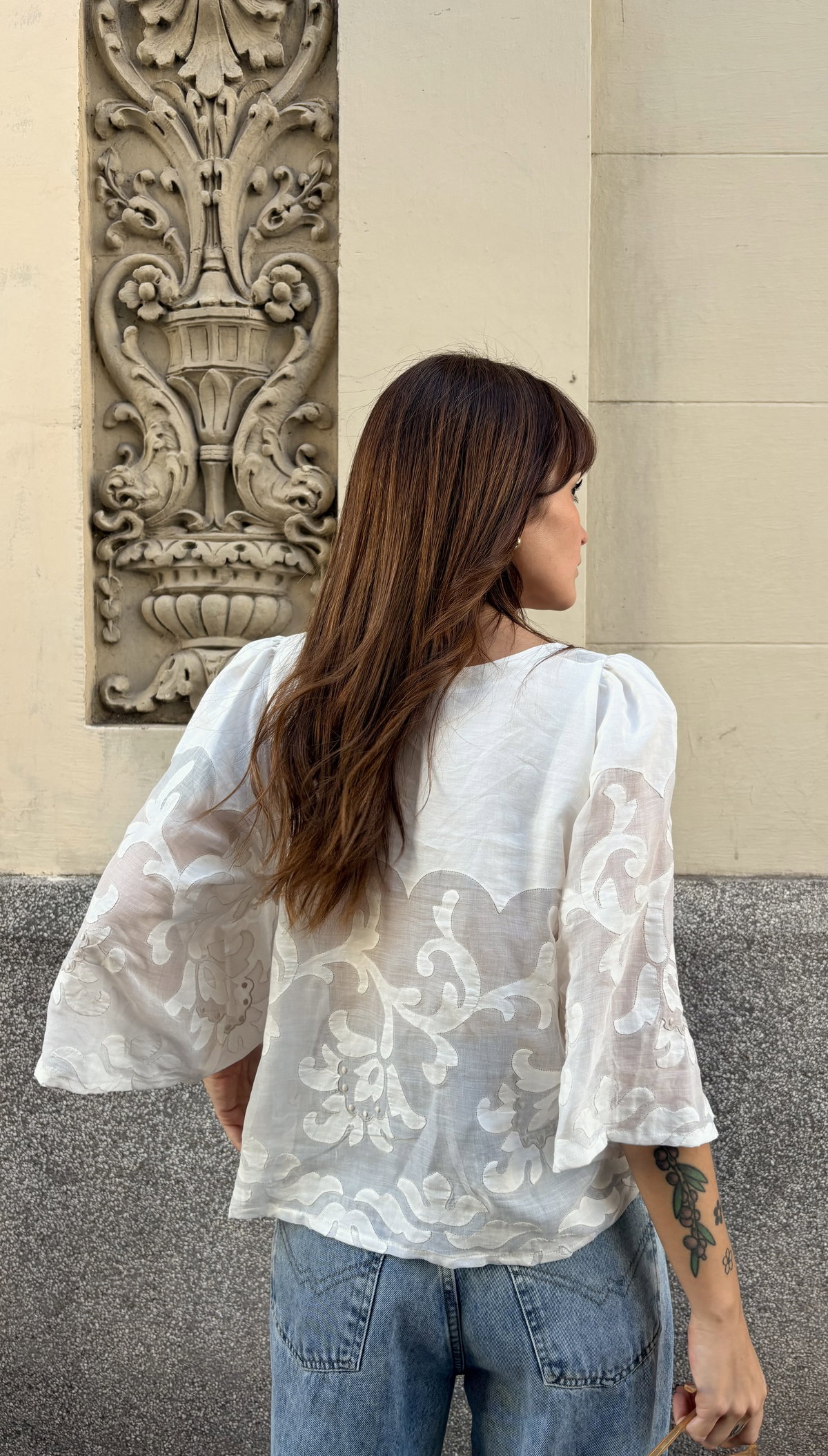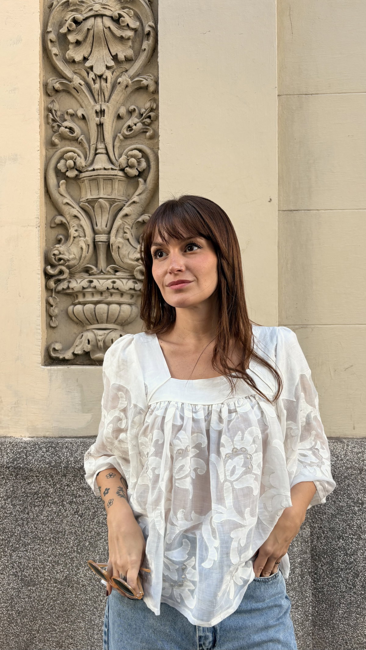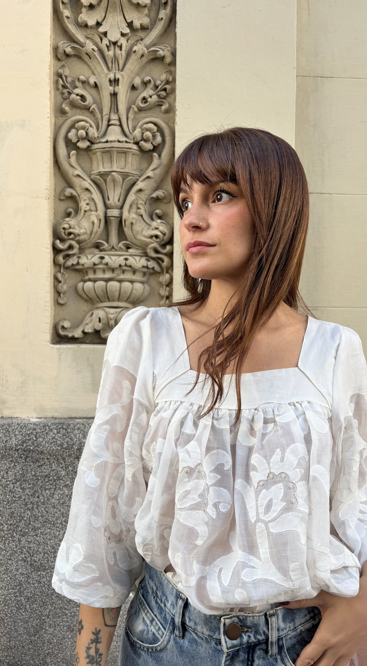 Blusa de organza natural con apliques en realce y detalles bordados. Tela hermosa súper liviana y con movimiento