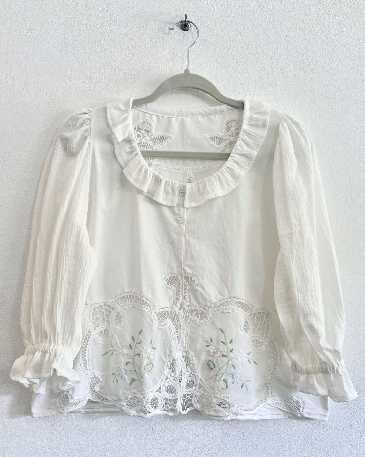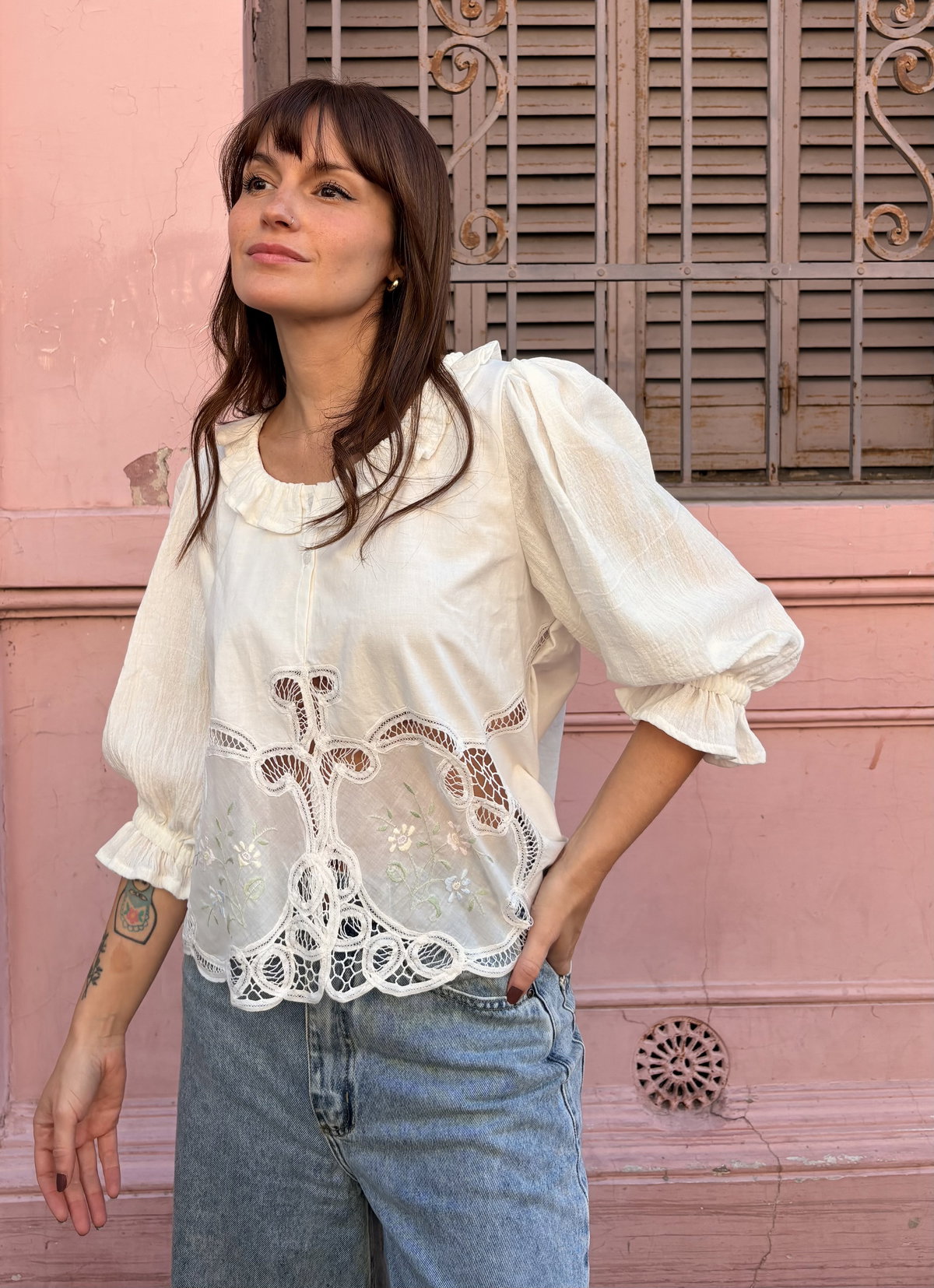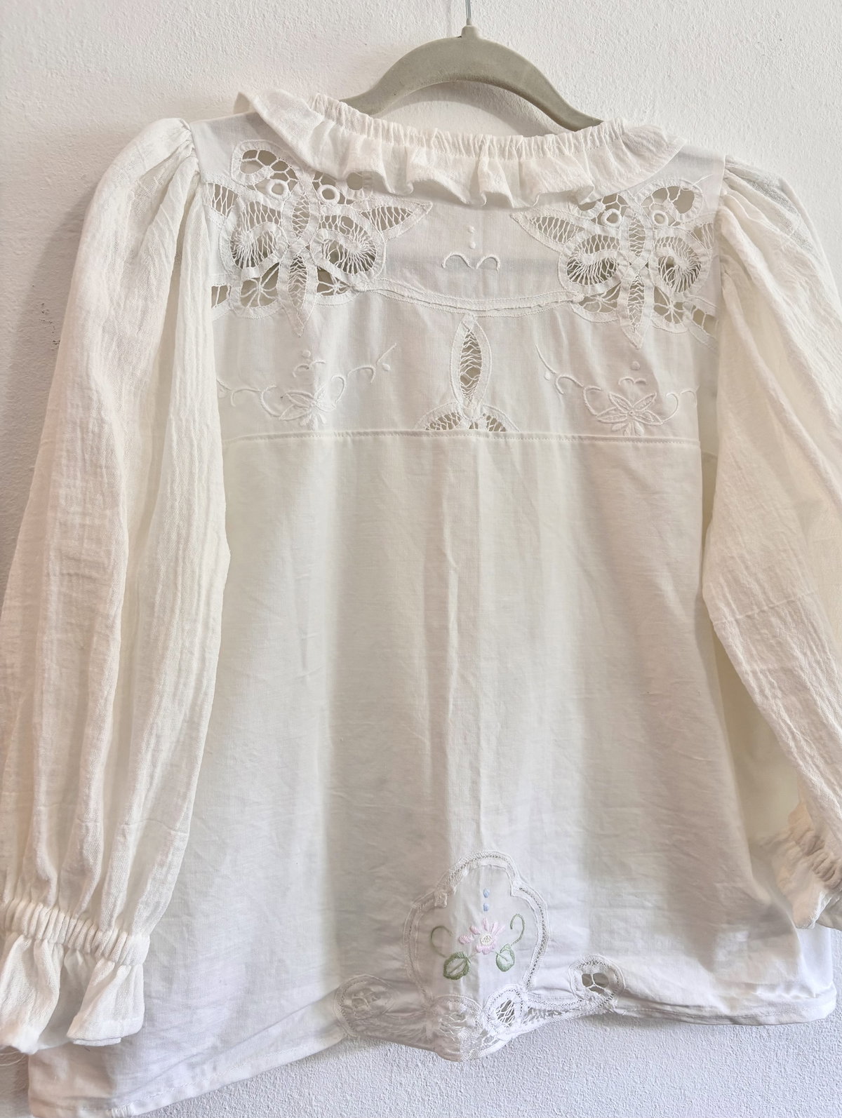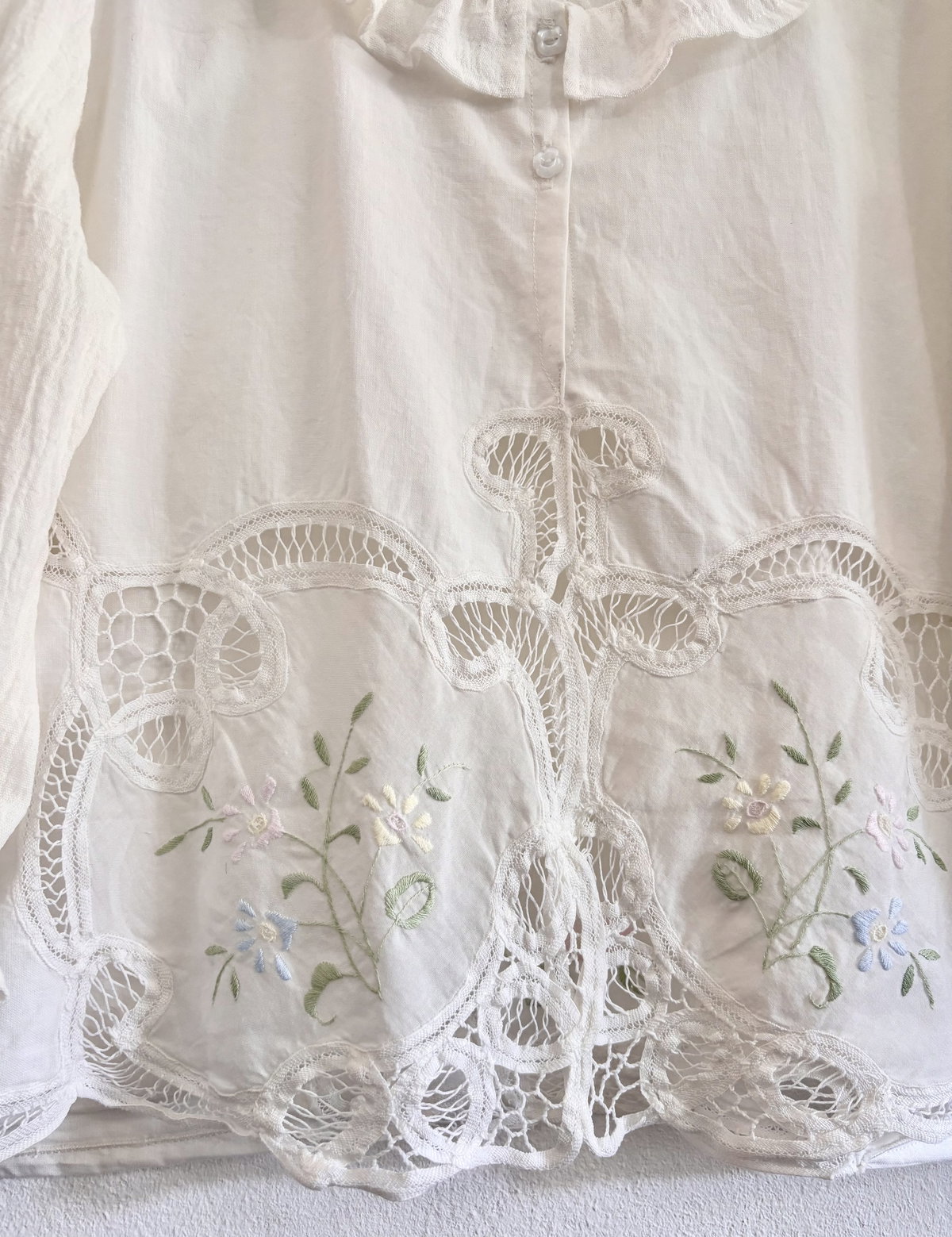 Blusa de algodón con detalles de encaje inglés y bordados sutiles en tonos pastel