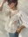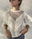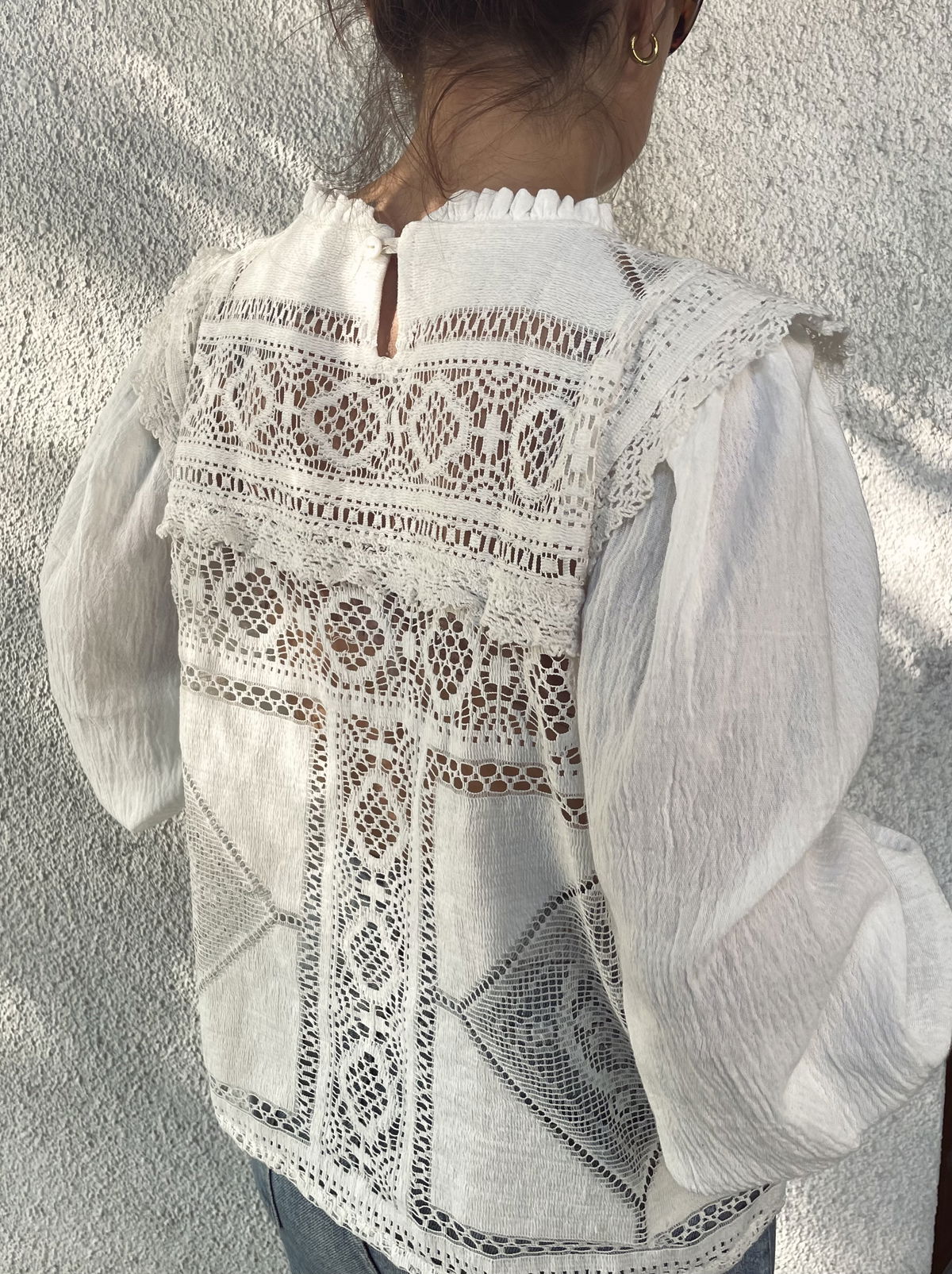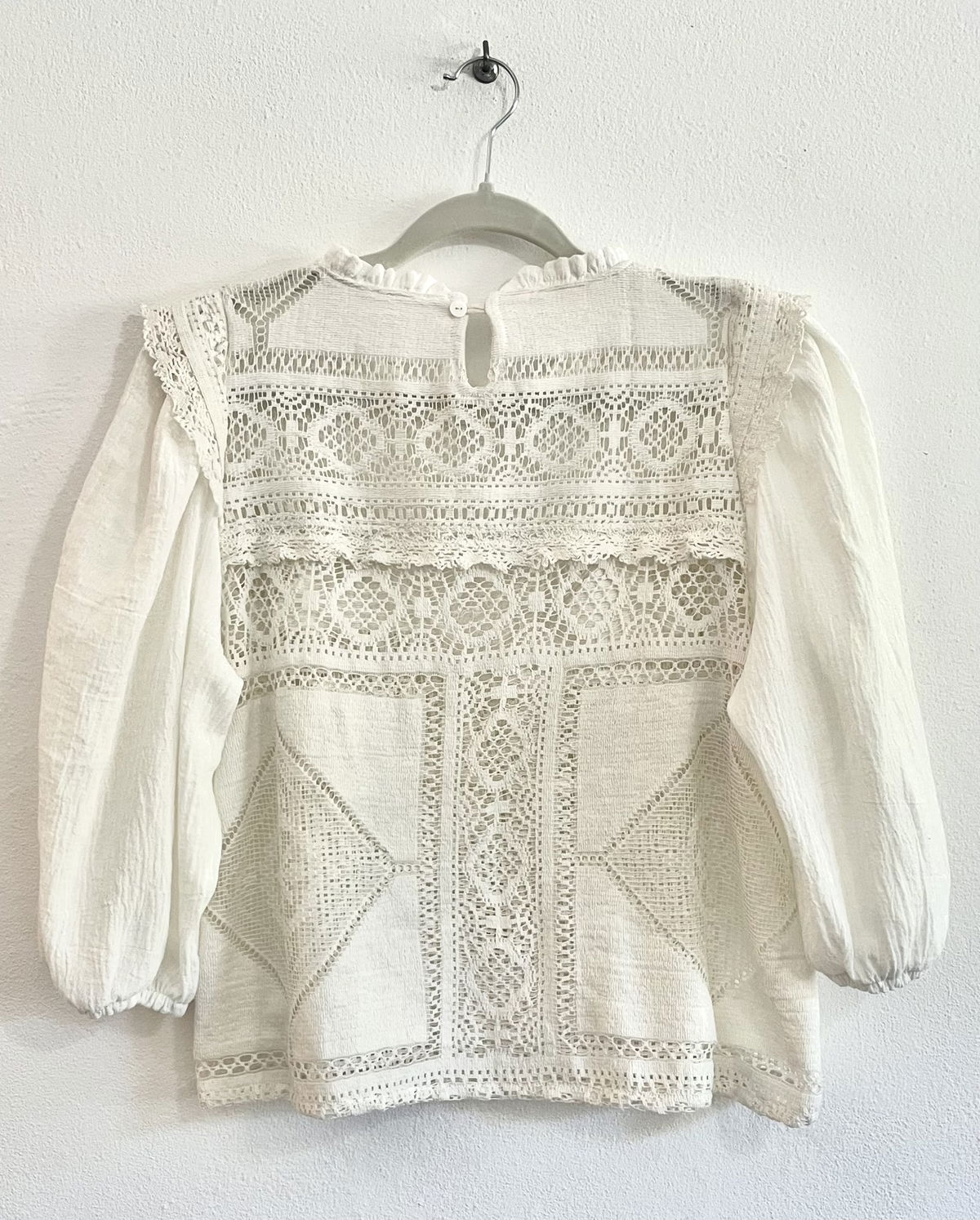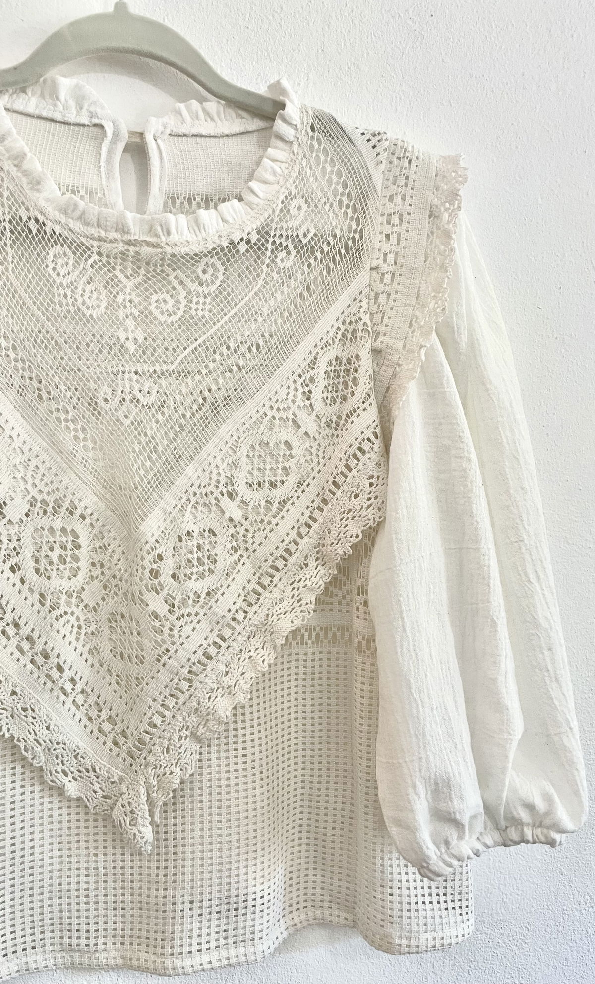 Blusa confeccionada en filé frances mecánico con puntillas y mangas de gasa de algodón abullonadas.