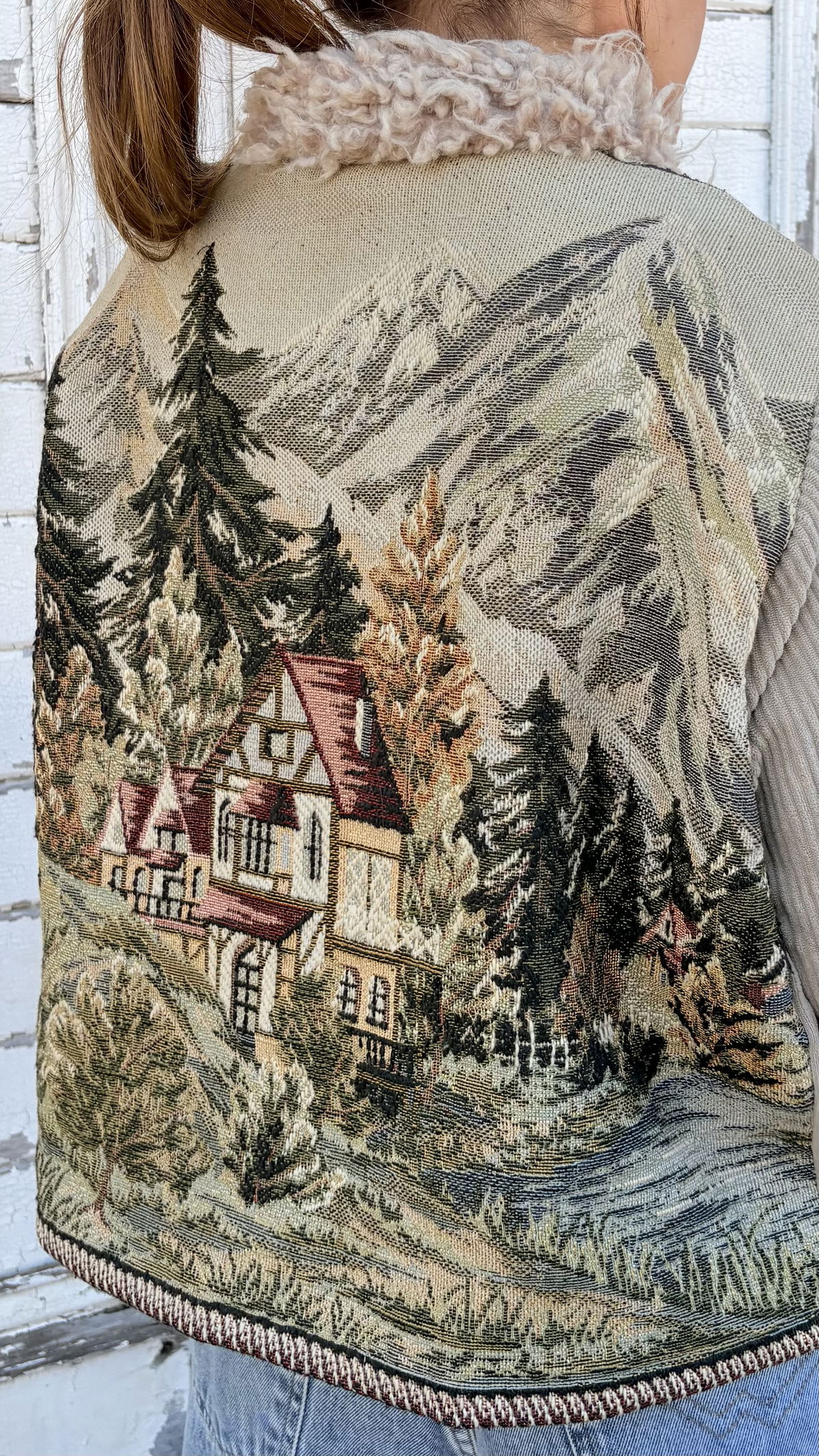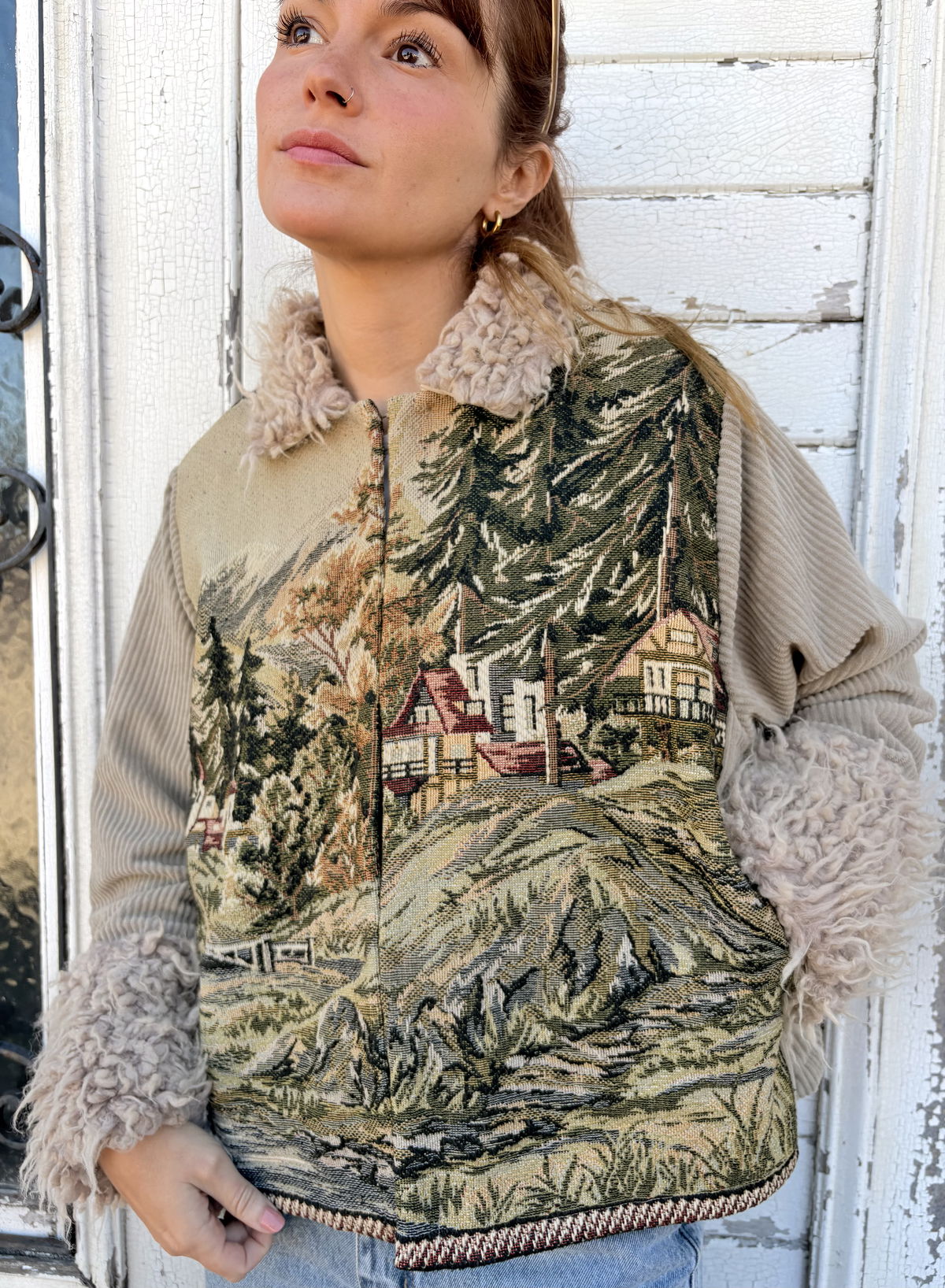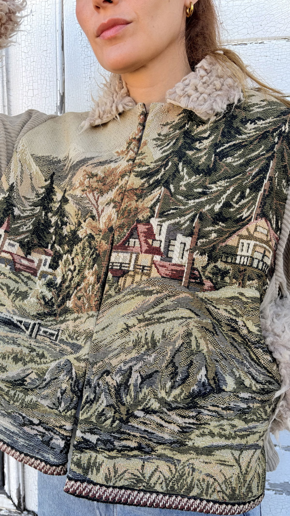 Campera confeccionada con tapiz de gobelino con un hermoso diseño de paisaje. Mangas de cordero y piel en ruedo de mangas y cuello. Integramente forrada
