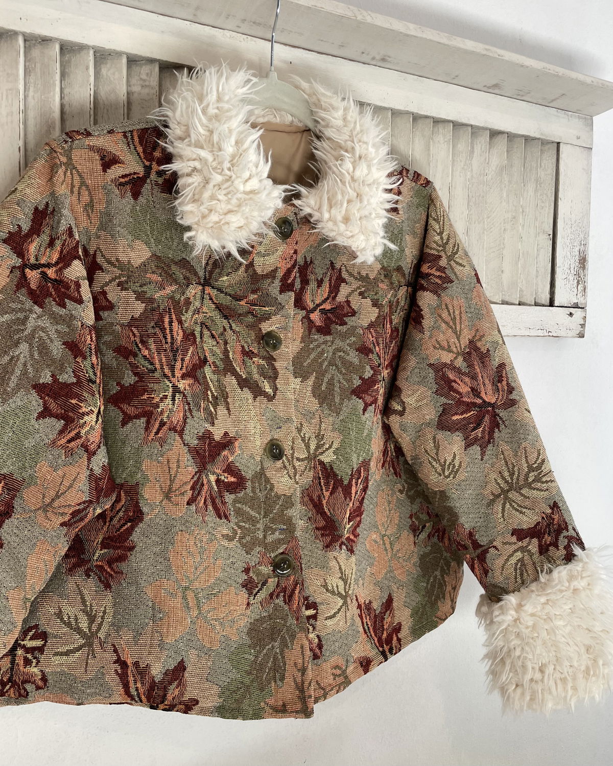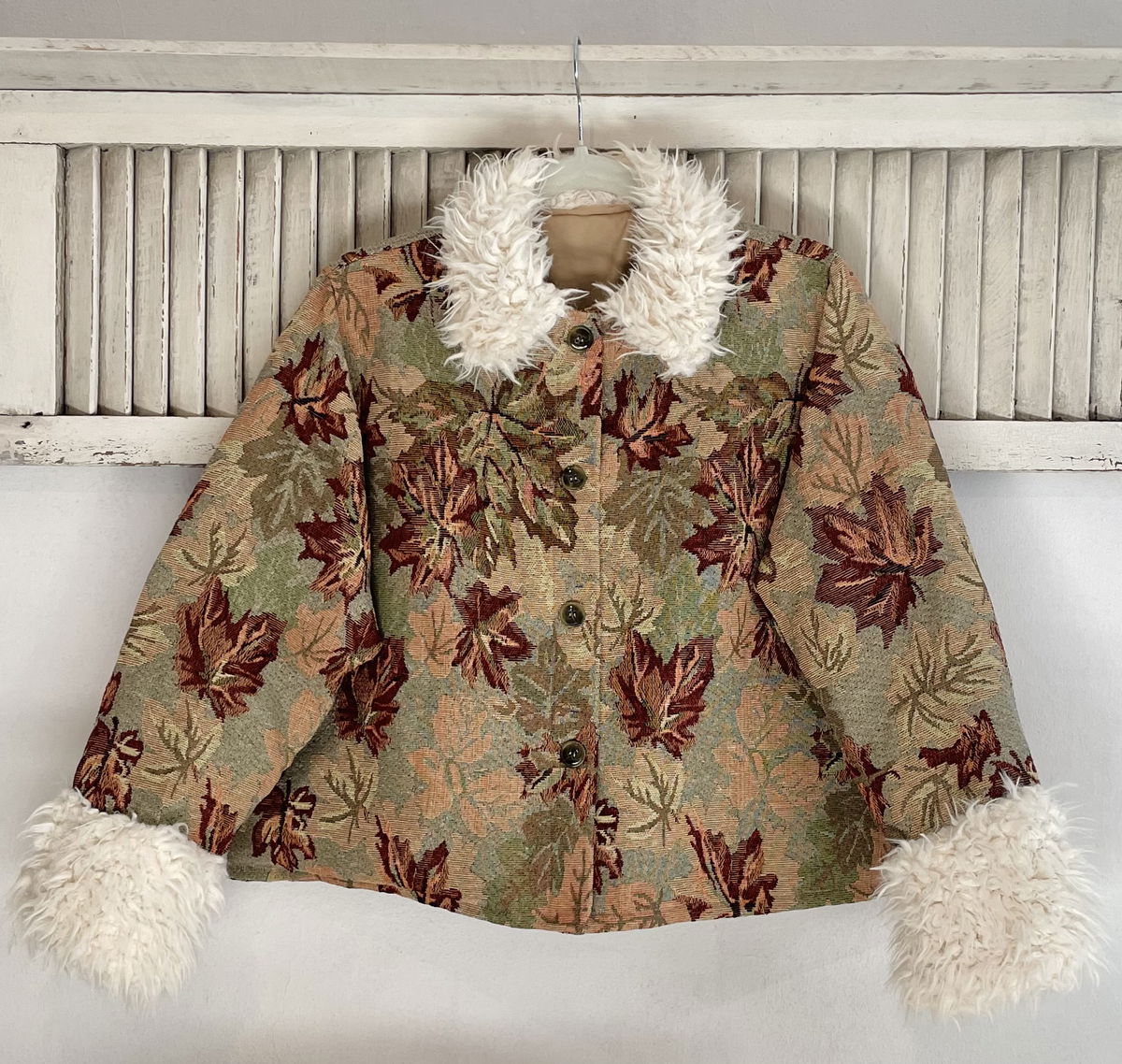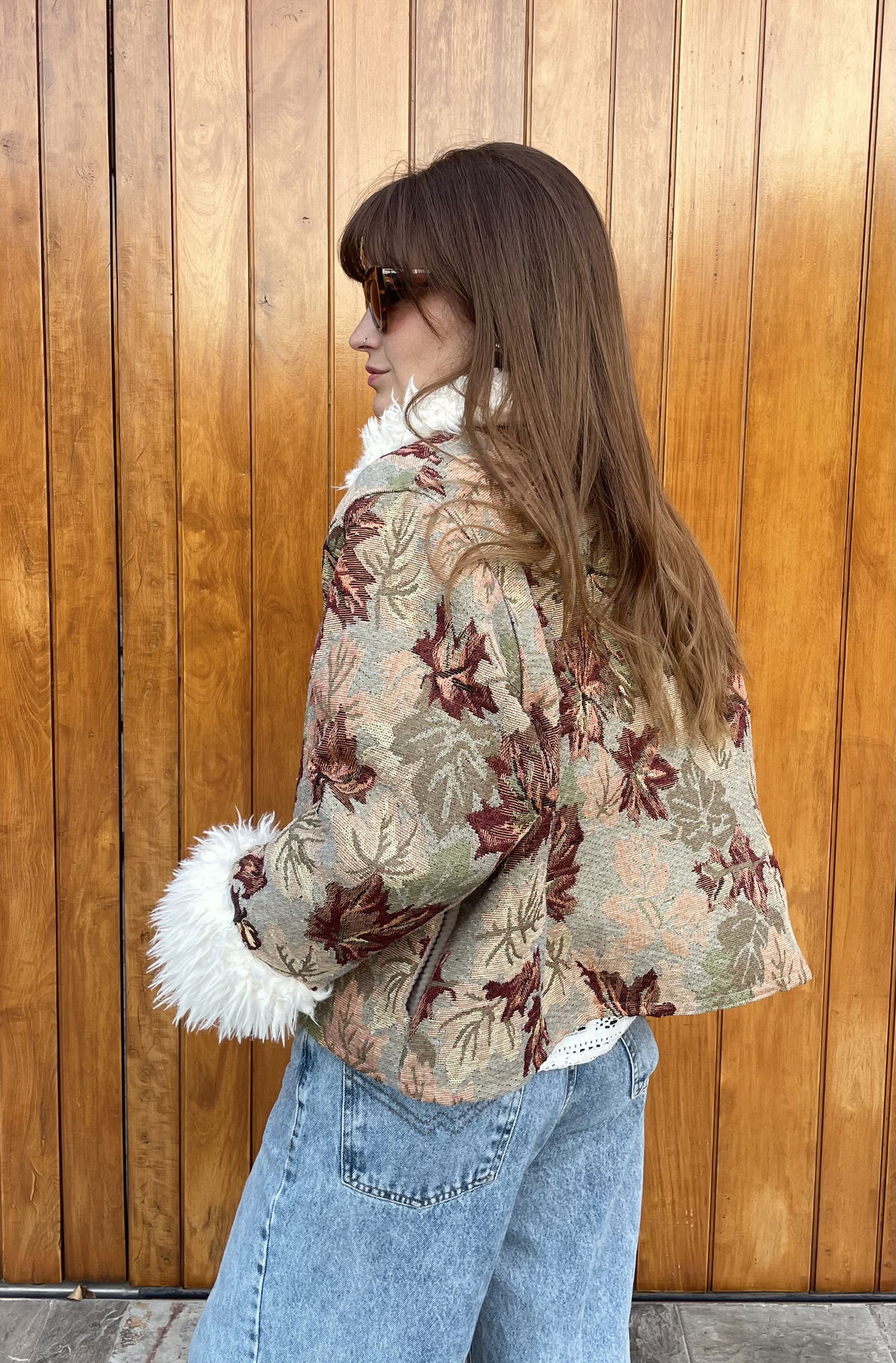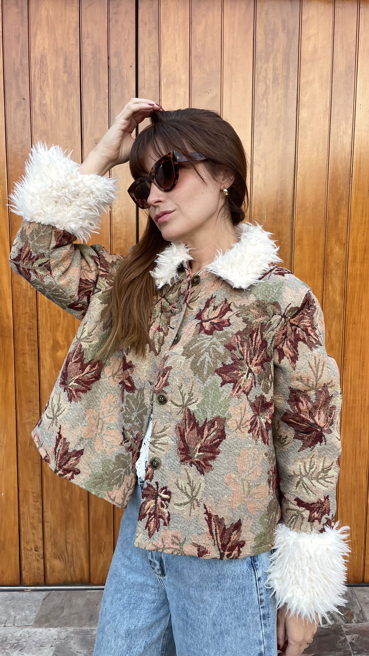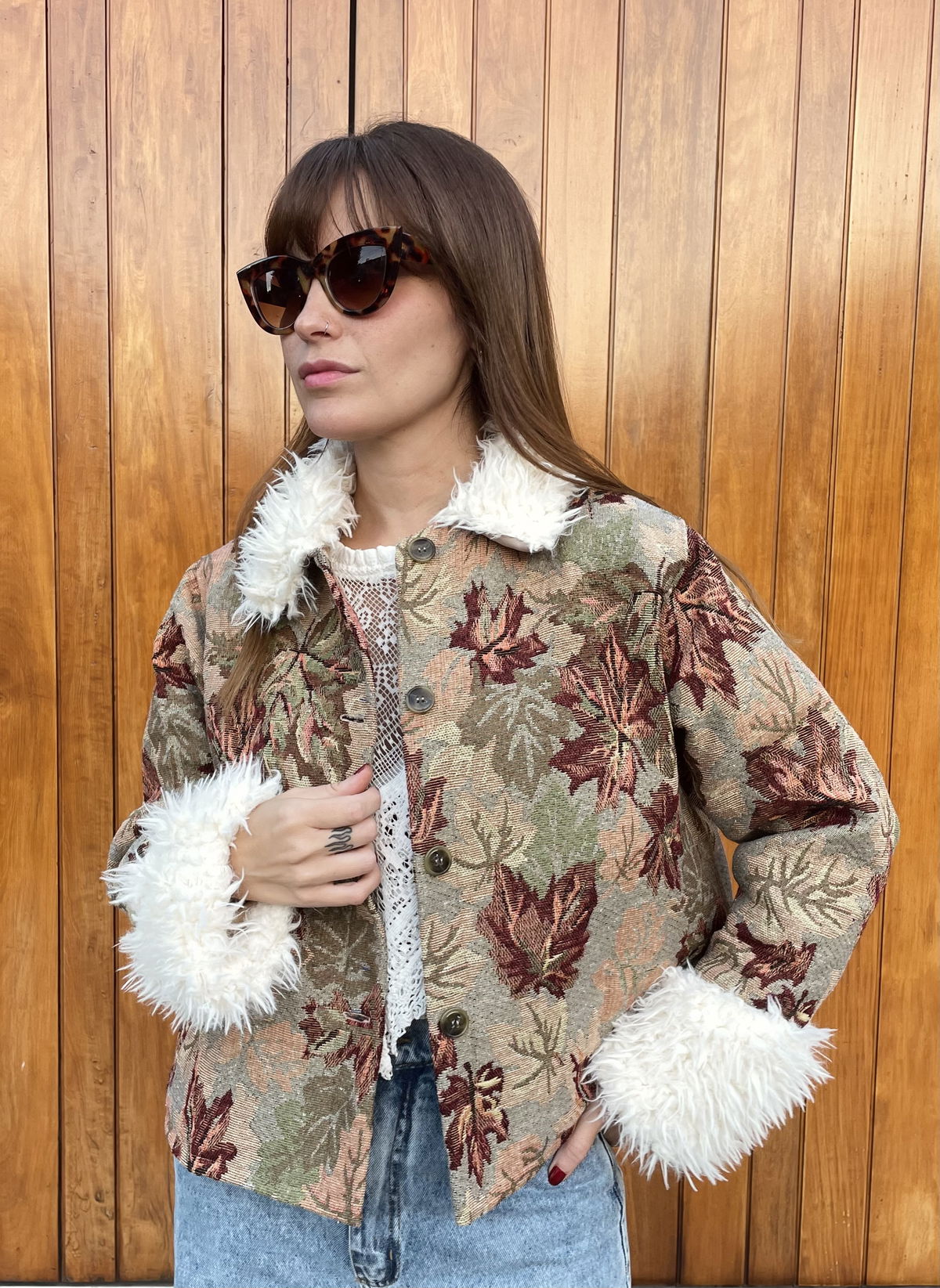 Campera confeccionada en gobelino floreado. Con piel en ruedo de mangas y cuello. Integramente forrada